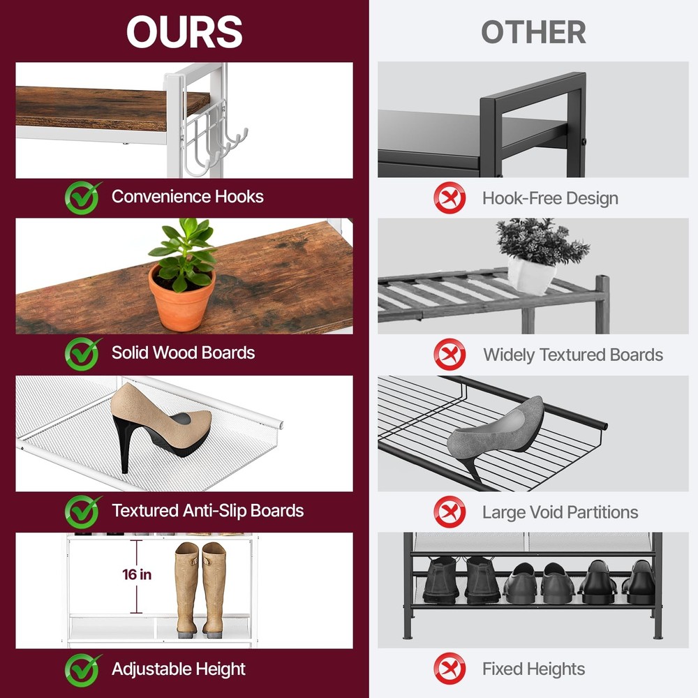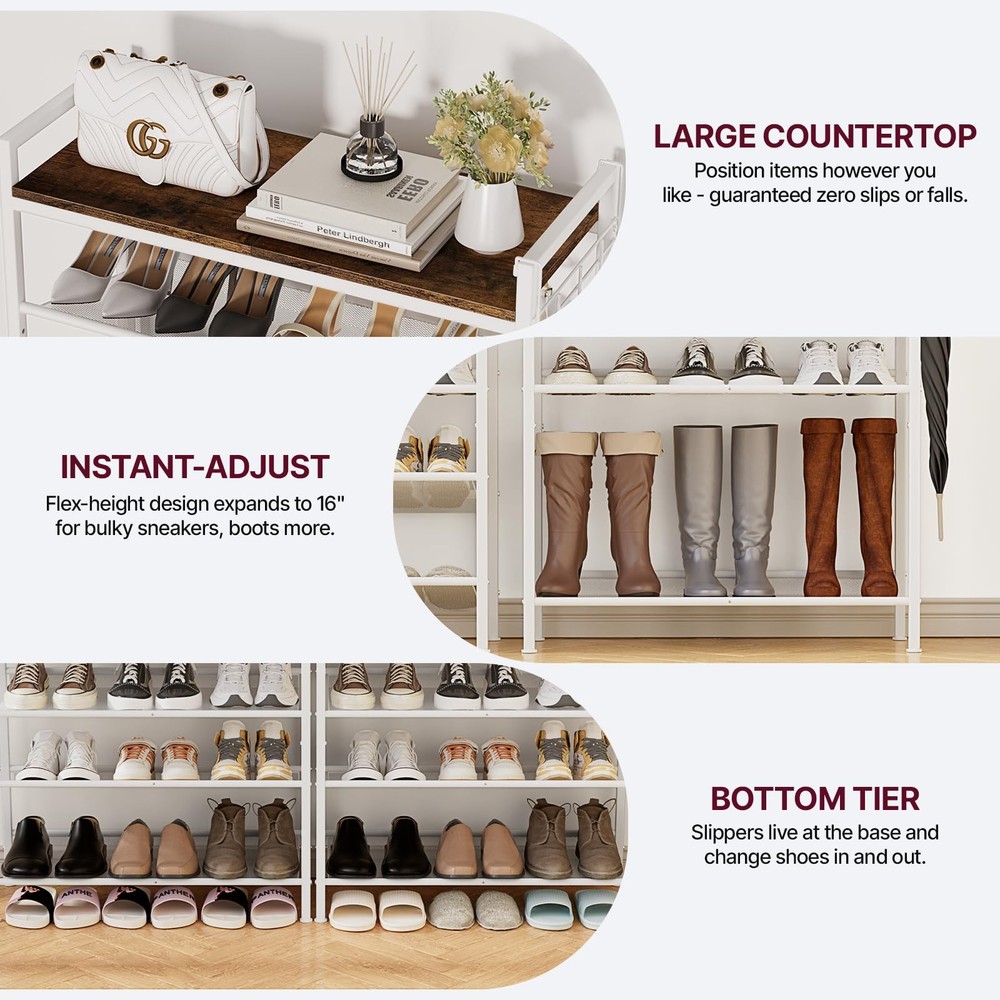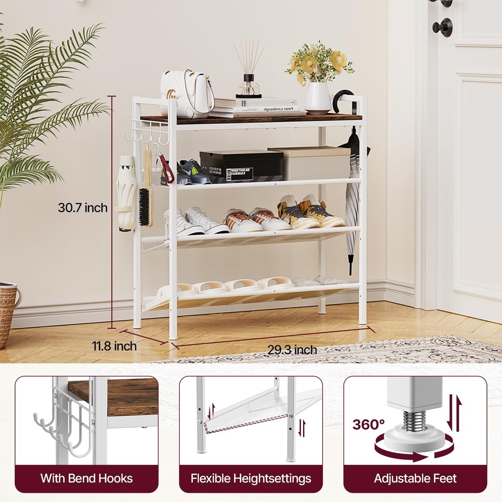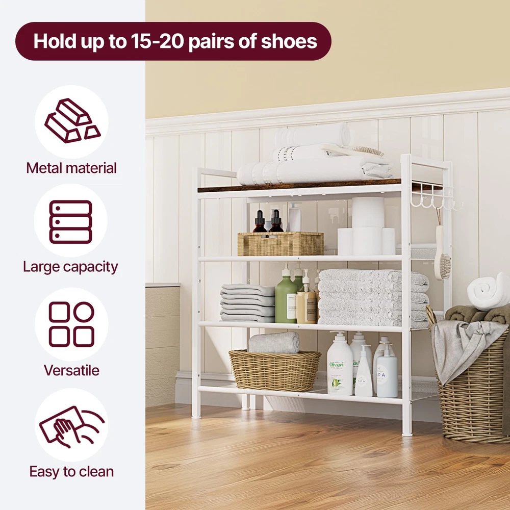 Shoe Rack for Front Door Entrance, Metal with Hook and Adjustable Mesh Shelves, Shoe Shelf Organizer for Entryway, Closet and Dorm Smart Tier Design: This 4-tier shoe rack is thoughtfully engineered to provide large-capacity shoe storage while maintaining a compact footprint. Holding 3–5 pairs per shelf, it accommodates 15–25 pairs of shoes in tota—ideal for families or sneaker lovers. Each level is spaced 8 inches apart to fit high heels, ankle boots, or sneakers with ease, shoe rack organizer helping you keep your entryway or closet neat and space-efficient! Efficient Shoe Storage Rack: The upgraded mesh shelves feature tighter spacing to prevent narrow heels from slipping through, while 4 tier shoe rack compartments easily fit everything from flats to boots. Shoe rack for entryway, closet, bedroom, or front door entrance, helps keep your space neat and organized, so that small shoe rack is the ultimate solution for a tidy, efficient home! Flexible Storage Needs: This adjustable metal shoe rack features customizable shelf height and tilt via pre-drilled side holes, making it easy to store anything from low-profile sneakers to boots. Designed for modern shoe storage and organization, white shoe rack it adapts effortlessly to suit various footwear types, it brings optimization to your home! Durable Wood & Metal Rack: This white shoe rack built with engineered wood panels and a durable iron frame. Each level provides stable shoe storage without sagging, whether used as shoe rack for front door entrance or as a metal shoe rack to hold heavy boots in the closet, its durable structure ensures reliable performance across a wide range of home environments—making it perfect for daily family use! Versatile Shoe Rack: This adjustable shoe rack is equipped with a convenient row of integrated hooks, perfect for hanging everyday items like keys, umbrellas, and handbag, 4-tier shoe rack for closet, ideal for busy entryway areas or tight front door spaces! Multi-Use Design & Simple Setup: This shoes rack blends function with flexibility, white shoe rack perfect for closet, entryway, front door, kitchens,bathrooms, in a narrow hallway, or by the garage for everyday footwear, while also serving as a minimalist shoe shelf for plants, towels, books, or daily essentials!