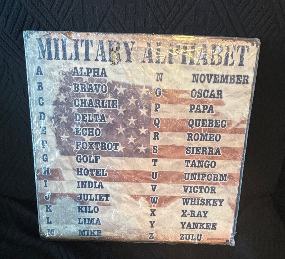 For sale is a new, unopened Military Alphabet wall art piece by Alamazooi. Features the NATO phonetic alphabet (Alpha, Bravo, Charlie, etc.) over an American flag design. Perfect for patriotic decor or military enthusiasts. Details: • Brand: Alamazooi • Condition: New in original packaging • Size: Approx. 12x12 inches (estimate based on image) • Material: Likely wood or metal with protective film What You Get: • Military Alphabet wall art (as shown, still sealed) Shipping: Buyer pays shipping. Item will be securely packaged. Please allow 2-3 business days for handling.