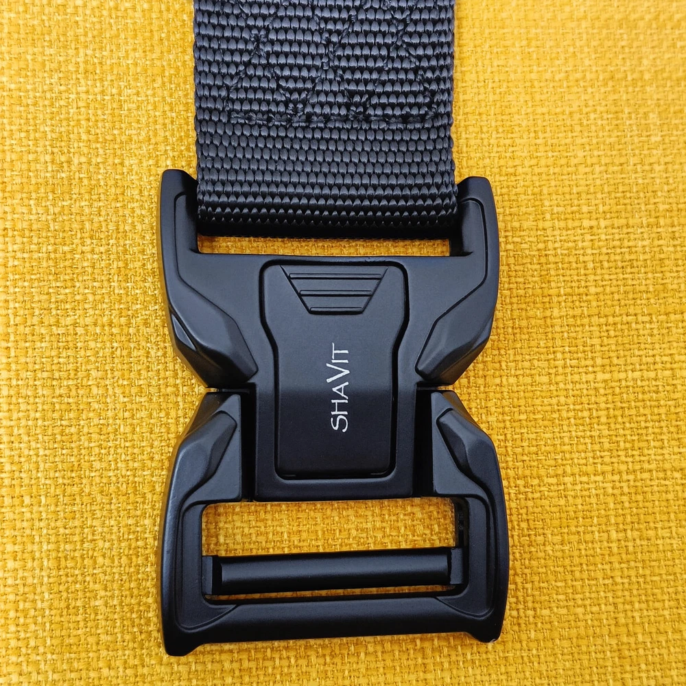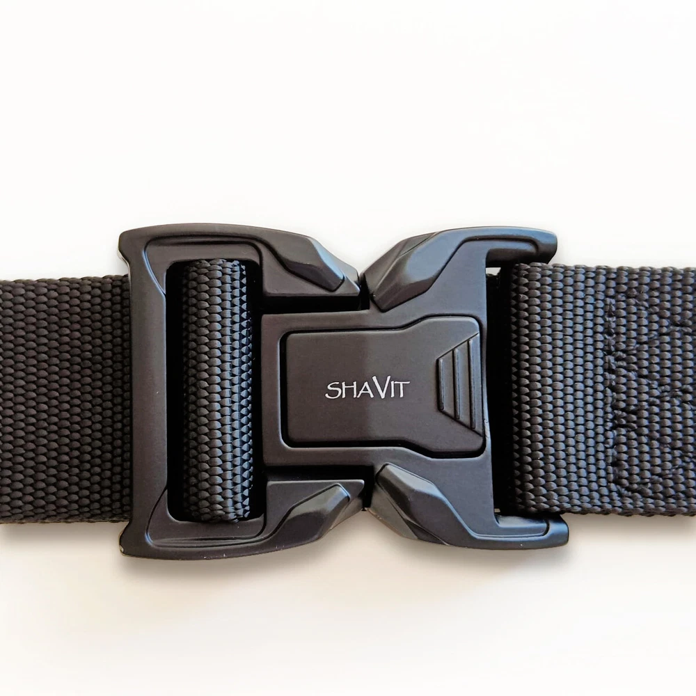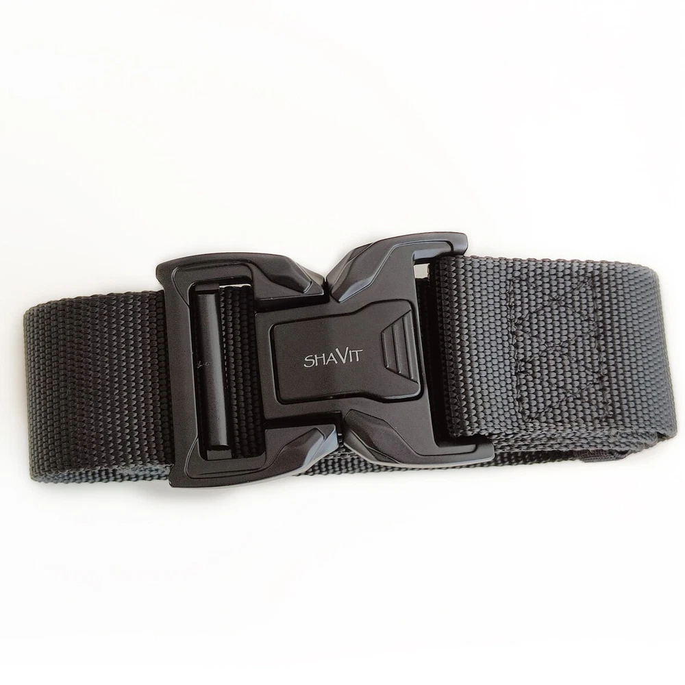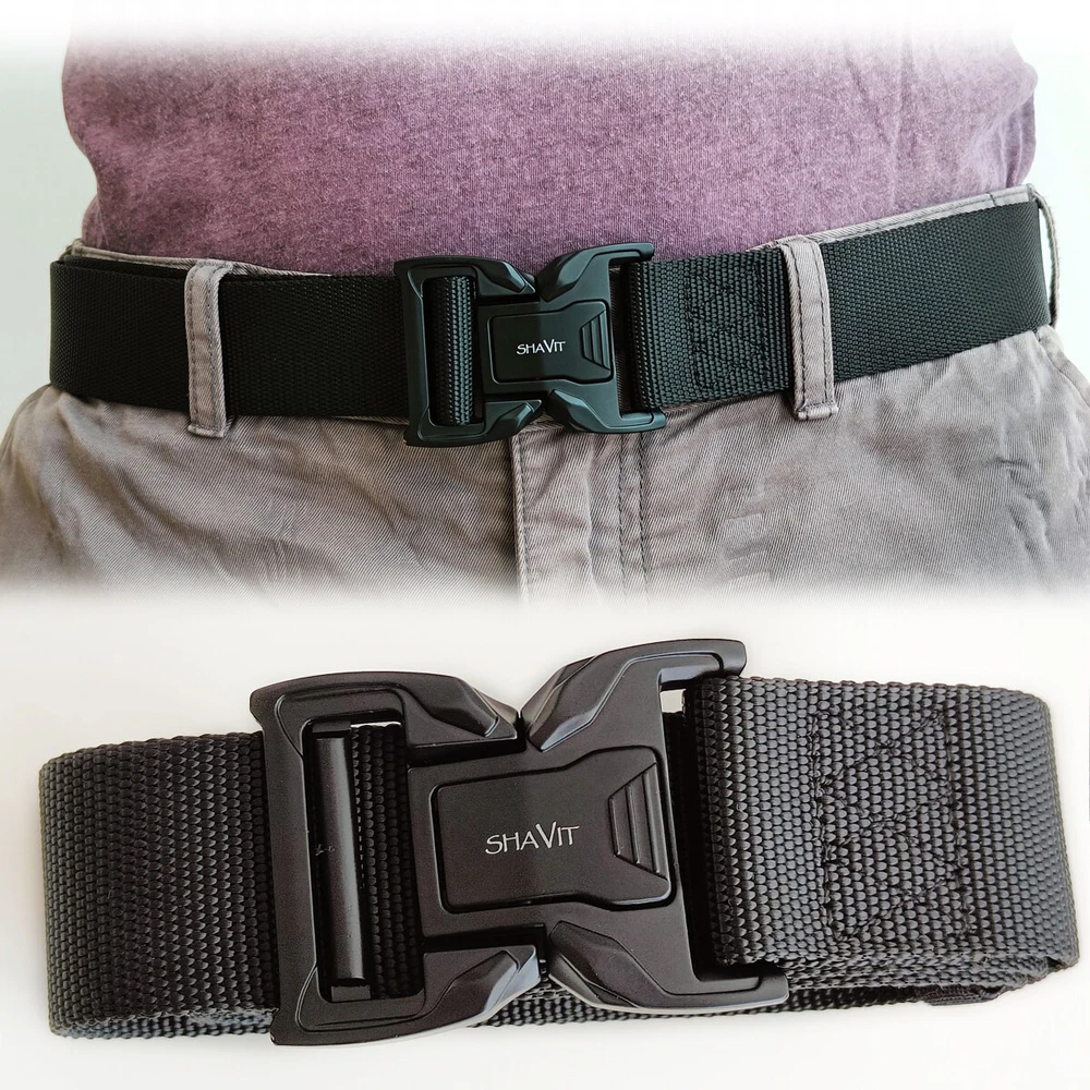 SHAVIT's Tactical Belt Military Style Belt Heavy-Duty Police Utility Nylon Rigger Belt with Quick-Release Metal Buckle Belt for Men Black HEAVY-DUTY BUCKLE: made of heavy-duty zinc alloy, strong and durable QUICK RELEASE DESIGN: a simple push on the golden tabs and the buckle is released. Easy to operate and convenient to carry How to Wear - 1.Remove the buckle from the webbing. 2. Get the webbing through you belt loops. 3. Adjust it to your perfect size. Total Length 125cm/49 inch Fits Waist 33"-43" KT Deals Military Tactical Belt is not only Army fans’ favorite, but also the outdoor sports and field training friends’ good partnersand can the belt prior to a camping trip . This belt is the best choice for you Quick Release - The metal quick-release buckle makes fastening and releasing the belt extremely convenient and quick. No Holes - No holes on the belt, the tactical belt is full adjustable to a certain waist size. Heavy Duty - The tactical belt is with a metal alloy buckle, it can bear a large pulling force. Belt Size: Belt Width: 3.8cm / 1.5in Belt Length: 125cm / 49in in this tactical style belt comfortably fits up to a 43” waist.