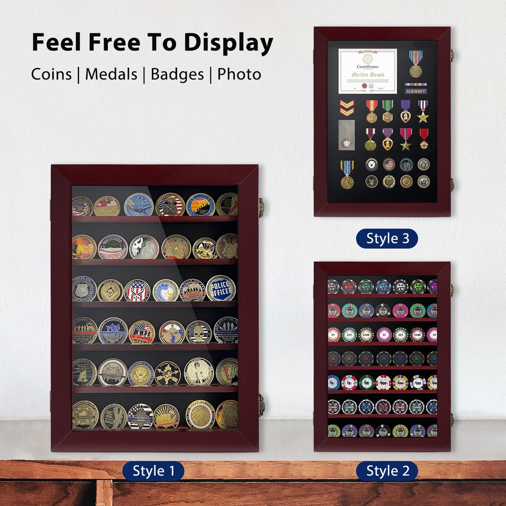 HIGH QUALITY - coin display rack is handcrafted from wooden, which is very strong and durable. Challenge coin holder’s red finish is glossy, showing its noble temperament. The smooth black felt lining allows you to affix displays of a variety of collectibles such as pins, badges, patches, and other items, protecting your precious collection from dust or scratches. HD TEMPERED GLASS & REMOVABLE DIVIDERS - Challenge coin display case door made of 3mm high toughened glass to protect your precious collection,high toughened glass different other acrylic materials. More durable more high-definition and wear-resistant, no need to worry about the door’s cover will be scratched; all shelves in between are removable to accommodate coins in large sizes. Designed with grooves to prevent coins from falling and moving, can holds 24-42 coins. Slot Width is about 5mm / 0.2 inches. SAFE PACKAGING - Challenge Coin Display Box measures 15.74"(H) X 11.42"(W) X 2.56"(D) and the shelf distance for each row is approximately 2.04 inches. Shipped in highly protective packaging, ensuring that your coin holder arrives to you in the best condition possible. DISPLAY WHATEVER YOU LOVEING - Challenge coin display stand easy to show your collection such as Army, Navy, Air force, Police, marine corps, coast guard and other Military challenger coins, medals, pins, badges, ribbons, token, miniature cars,patches, insignia, memorabilia, figurines, antique coins, commemorative awards, thimble, geo coins, badge, patch, belt buckle, knife and other collectibles of any size,and other items to complete your shadow box. PERFECT GIFT - Military coin holder would be a great present to welcome a home hero and your love. Army, Air Force, Marine Corps, Navy, Coast Guards, Retirement, Excellent Missions, Overseas Heroes. Military Days,for Welcoming party,Memorial Days, 4th July, Birthday, Holidays, Thanksgiving day,Christmas, Parent's anniversary, Fathers Day, Gift for Grandfather, or other special days.