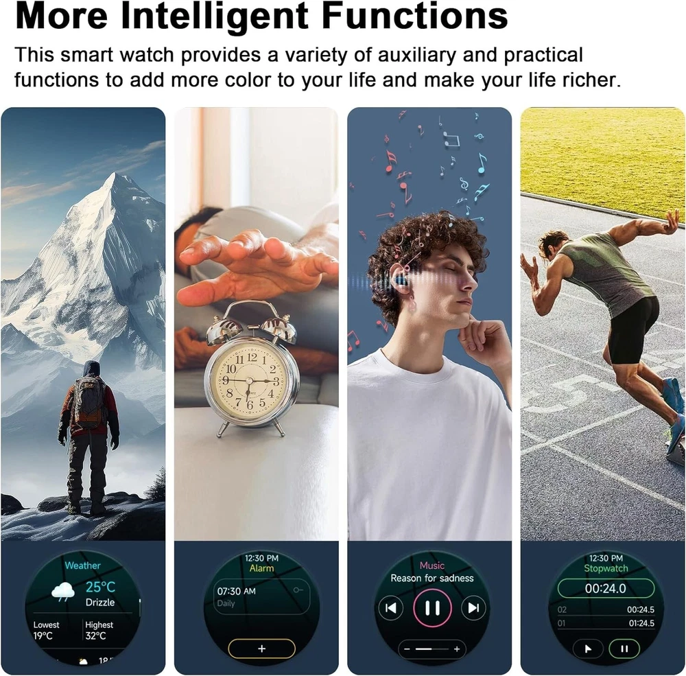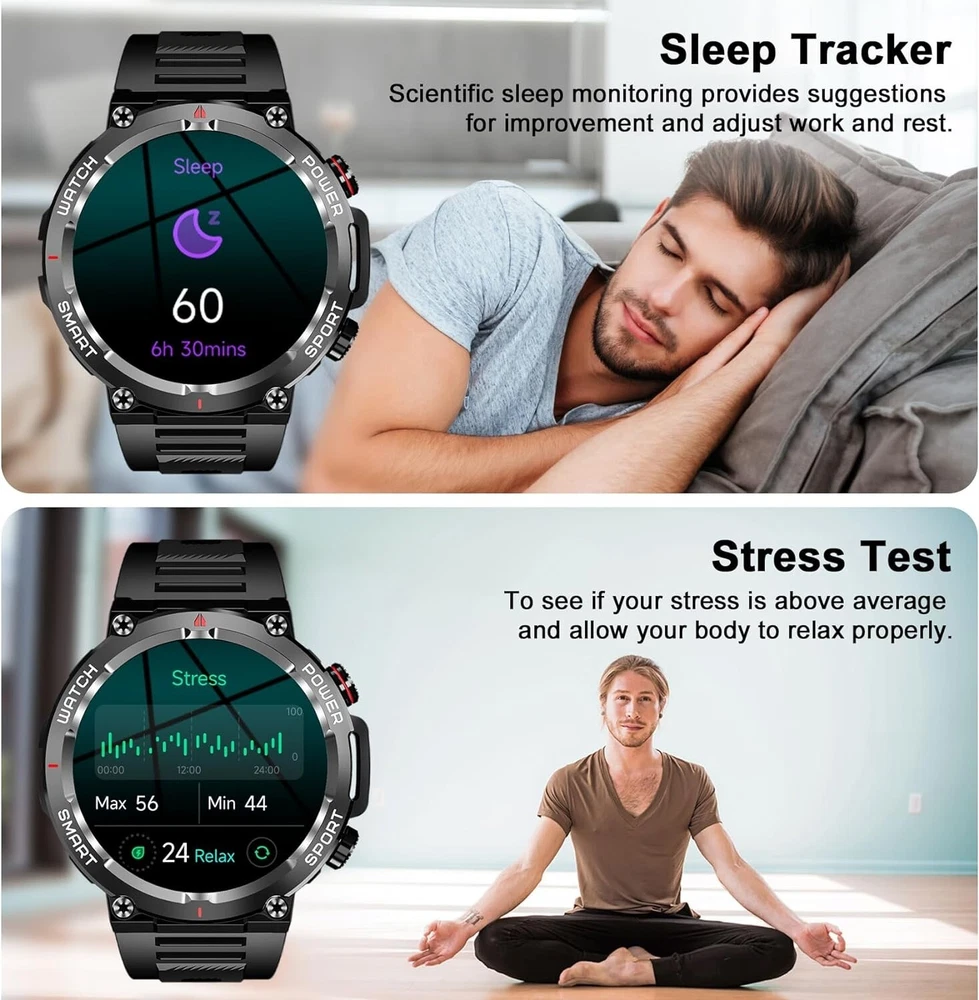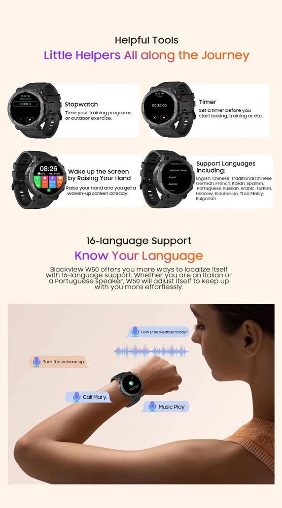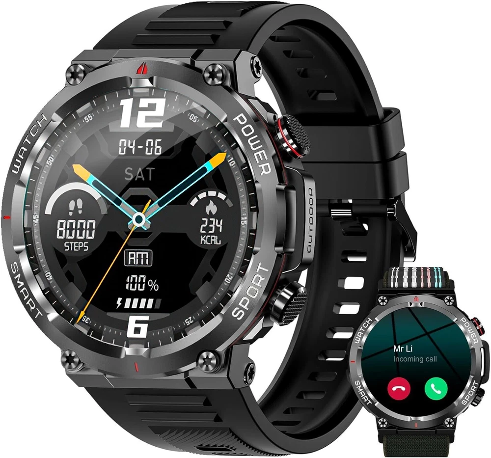 Military Smart Watch for Men (Call Receive/Dial) Rugged Tactical Fitness Tracker 👍 Fitness Tracker/ Bluetooth Calls/ Heart Rate/ Oxymeter/ Sleep/ Smart Notifications/ Pedometer/ Custom Dials/ Weather Forecast/ Sedentary Reminder/ Stopwatch/ Timer/ Alarm Clock/ Music Control/ Camera Control/ Don't Disturb Mode/ Find Phone and more👍 💥【Rugged Outdoor Smart Watch for Men】 Blackview W50 smartwatch is protected with scratch-resistant glass screen for durability. A robust fitness watch with a large 1.39'' Full HD screen that can display clearly and vividly for you. A variety of online watch faces make the watch more individual and unique. Equipped with 2 comfortable and skin-friendly wristbands (silicone band and woven band), the length can be adjusted freely. 💥【Bluetooth Calls, Answer/Make】 The smart watch for men supports Bluetooth calls, and the high-fidelity speaker and microphone can make and receive calls. It also supports syncing phone contacts and call logs. When your phone receives a call or message (such as SMS, E-mail, WhatsApp, Facebook, Instagram, etc.), the smart watch will give a real-time notification and you will never miss anything again. 💥【Health Monitor, Live Better】 The smartwatch for men also has a real-time health monitoring function, which records and monitors the user's health data, including heart rate, blood oxygen, emotional stress, sleep monitoring. This monitoring data can help you understand your health status, sleep quality and exercise activity in daily life, so that you can take appropriate measures to improve your health and lifestyle. 💥【100 Sports Modes】 This fitness watch for men supports 100 sports modes, meet your different sports needs. Choose the appropriate mode according to your sports scene (running/cycling/ball sports/martial arts/ice sports, etc.). In addition, the watch also supports recording your daily steps, calories burned and distance. You can analyze the watch's fitness data via "InfoWear" APP to achieve better training results. 💥 【Compatibility and Long Battery Life】 This fitness tracker is compatible with most smartphones, not suitable for iPads, tablets, PCs.Equipped with a 370mAh large-capacity battery, it supports 2.5 hours of fast charging, can last up to 20-30 days in standby, and can last up to 5 days in normal use. IP68 waterproof, you don't need to take off the watch in rainy days and when you wash your hands. (*Note: This product is not suitable for sauna, hot water, showering, diving, swimming) 🎁 【Stylish Gifts】 This fitness tracker smartwatch is the perfect gift for birthdays, anniversaries and special occasions. Perfect for those who enjoy outdoor or indoor activities. Perfect gift for dad, mom, brother, sister, friends, family, husband , wife on Christmas, Valentine's Day, Anniversary, Birthday, Thanksgiving. APP Infowear Waterproof 10M Band Colour Black Screen 1.39" HD Touch Screen MPN Does not apply Serial Number W50 Case Color Black Model02 W50 Smart Bracelet Case Colour Black Manufacturer Warranty 1 Years Network Bluetooth Case Size 1.39 Inches Features Blood Oxygen Sensor, Caller ID, ECG Monitor, Fitness Tracker, Heart Rate Monitor, Music Player, Sleep Monitor, Touchscreen, Waterproof, Water-Resistant, Bluetooth Call, Father's Day gift, birthday gift Operating System Android Wear Storage Capacity Flash 128MB Case Material Zinc alloy Band width 22mm Compatible With Android 4.4 & iOS 8.0 above Screen Size 1.39 Inches Brand Blackview Series Blackview W50 Type Blackview Smart Watch Battery Capacity 370mAh Band Color Black Band Material Silicone Compatible Phone Models For IOS,Android Design/Finish HD Touch Screen Model Smart Bracelet Compatible Operating System Android, iOS - Apple Country/Region of Manufacture China Connectivity Technology Bluetooth 5.3 Resolution 360*360