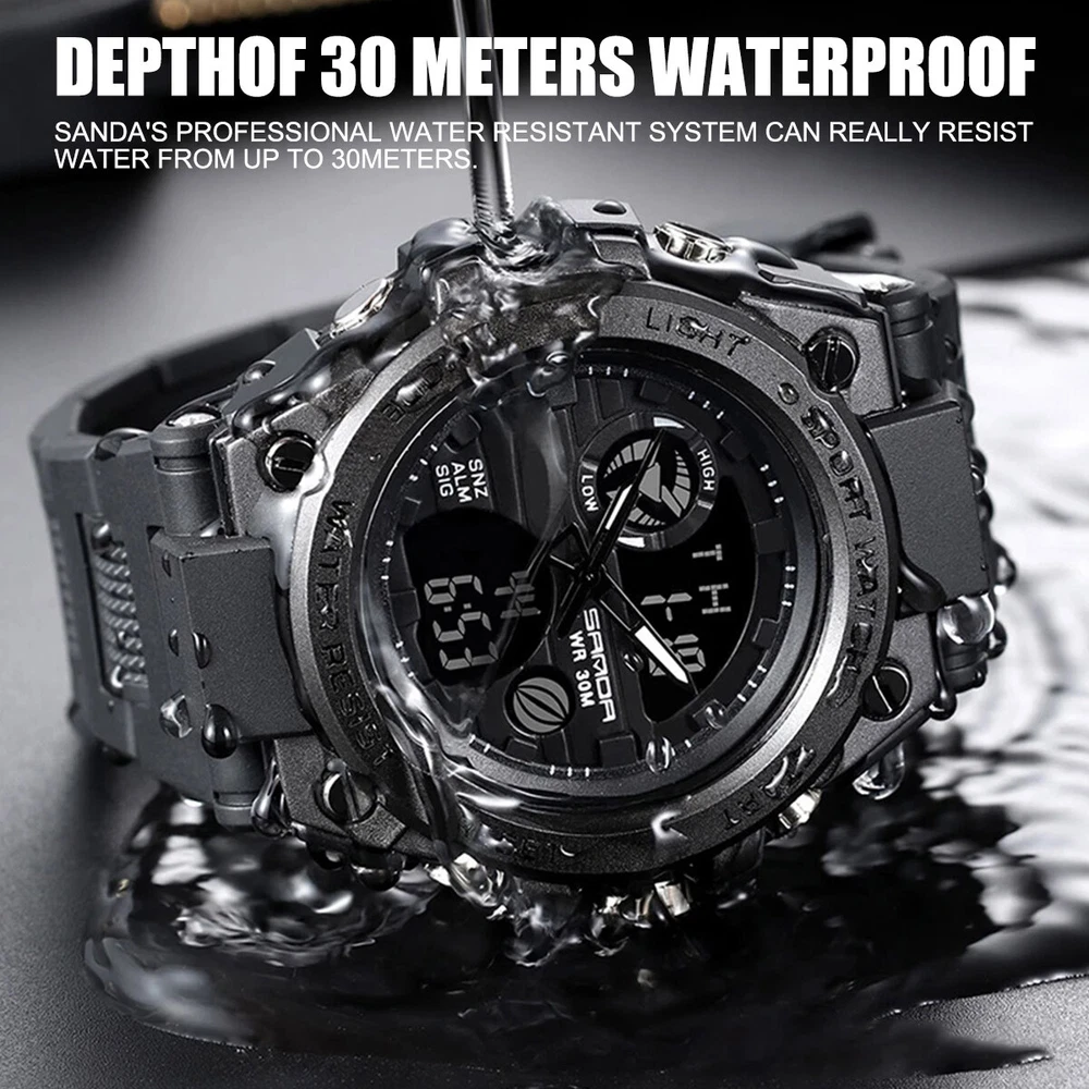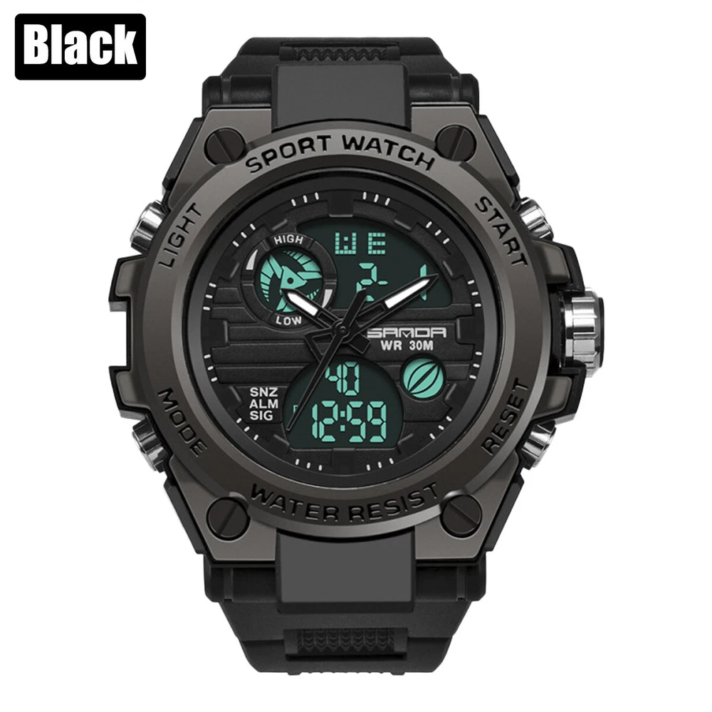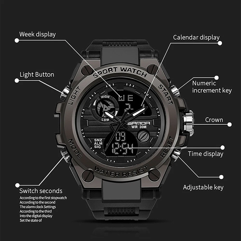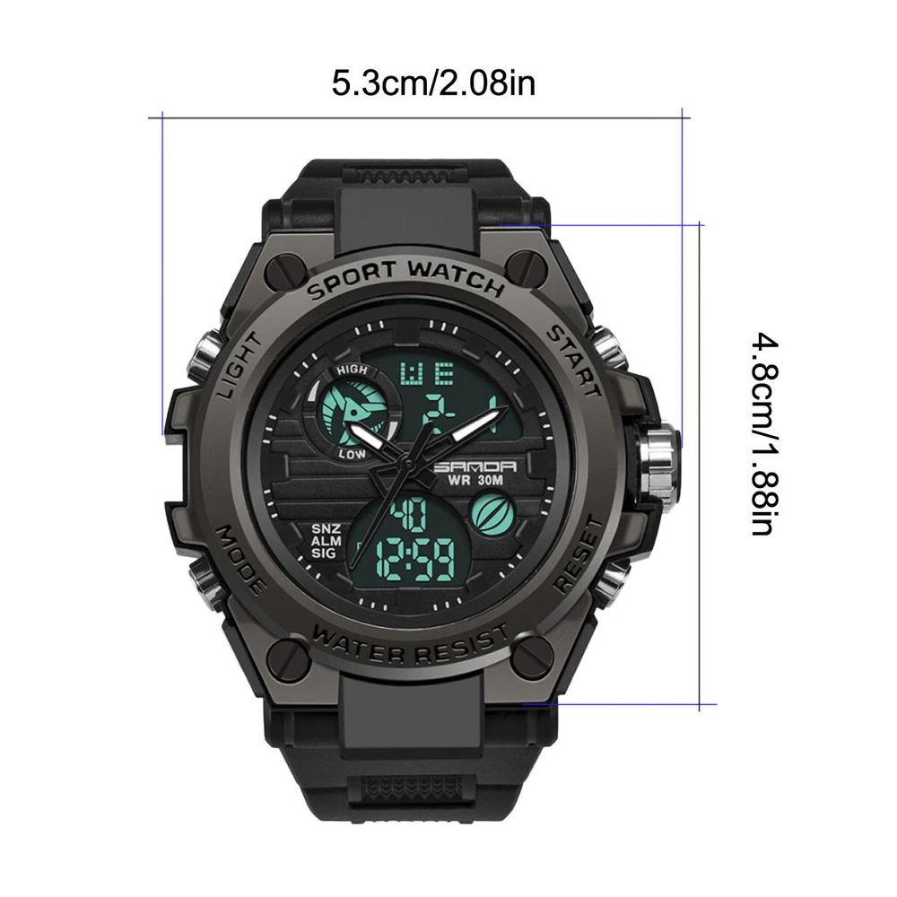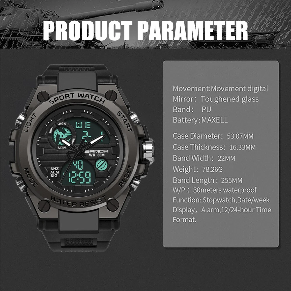 Product Description Description: The watch has a full range of functions, including two clock display of pointer time and digital time, day, month and week display, alarm clock function, snooze function, time on the hour, stopwatch timing function, EL backlight Feature: 1. With a brand new exterior design, wearing a watch not only keeps you up-to-date, but also makes it an essential trendy accessory for men; 2. Imported movement and battery from Japan, high-quality movement ensures accurate watch movement and long battery life; 3. The function of digital electronic clock and pointer quartz clock can set the time of two places simultaneously, making it more suitable for users who work or travel; 4. Calendar, week, alarm clock, stopwatch and other commonly used functions are all equipped to meet daily needs; 5. The watch comes with a soft EL backlight, ensuring clear and unobtrusive viewing of time at night; 6. 30 meter waterproof daily life, watch can be worn in daily showers and swimming, with a thickened case design, fearless of falling and slight bumps. Parameters: Material: PU, plastic, acrylic, metal Type: electronic watch, quartz watch Origin of movement: Japan Battery life: over 1 year Style: tough guy, outdoor, sporty Common functions: dual time, calendar, week, 12/24 hour time system, stopwatch, alarm clock, hour reporting, EL backlight Number of alarm clocks that can be set: 1 Waterproof grade: 30 meters waterproof Watch wearing circumference: minimum 166mm, maximum 223mm Dial width and height: 53mm, 49mm Dial thickness: 16.3mm Band width: 22mm Packaging list: SANDA Sports Watch x1 Product manual x1 Brand label x1 Payment Shipping Terms Returns Contact Us We accept PayPal only. If buyer want to delay the payment because of financial problem, please contact me by the ebay message within 3 days Payment via PayPal (PayPal accepts all major credits/debit cards and eCheque) ECheque payment will tak e 3-10 days to get clear, thus DELAYing the shipment. Handling time: 1 business day (Orders are not processed on weekends & holidays) Tracking information will be sent once item is shipped. Local pick-up is unavailable at the moment. For international shipping and shipping to Guam, Hawaii and Alaska, Please contact us before placing the order. Item is shipped to ebay address. Leaving correct address can minimize delay. For any issues with Defects, Return, Item Exchange request, please contact us first and send us a message first before opening any type of case or request. We devote ourselves making EVERY CUSTOMER in 100% Satisfactory and resolve any problem. We highly value and appreciate your business. Thank you. No returns will be accepted without an RMA number. Please contact us for the RMA number. Return is acceptable within 30 days of delivery. Return for replacement or money back is optional. Returned items must be in the brand new, unaltered and resalable condition. Seller is not responsible for any labor cost, expense in a dealer store, or damage due to wrong installation. Return is accepted within 14 days after the buyer's receiving the item. (Excluding contrived damagement or misusage).100% money-back Guaranteed! All product will be tested in 100% before delivery.If the item is defected by the processing of postage,Buyer has up to 14 days from date of receipt for exchange of a new one.All shipping charges for returned products are to be paid by the buyer,Please contact us for the return address All messages will be answered within 24 office hours. Please contact us either by clicking "contact seller" in the "purchase history" section or simply click "ask a question" at the bottom of this page. If you are unsatisfied with our item or service, please contact us before leaving any feedback. We are committed to resolve all issues in a friendly and satisfactory manner. We always reply to messages within 2 business days (off-duty at weekend). If you do not get a response from us, then please check your junk or spam mailbox. Payment We accept PayPal only. If buyer want to delay the payment because of financial problem, please contact me by the ebay message within 3 days Payment via PayPal (PayPal accepts all major credits/debit cards and eCheque) ECheque payment will tak e 3-10 days to get clear, thus DELAYing the shipment. Shipping Handling time: 1 business day (Orders are not processed on weekends & holidays) Tracking information will be sent once item is shipped. Local pick-up is unavailable at the moment. For international shipping and shipping to Guam, Hawaii and Alaska, Please contact us before placing the order. Item is shipped to ebay address. Leaving correct address can minimize delay. Terms For any issues with Defects, Return, Item Exchange request, please contact us first and send us a message first before opening any type of case or request. We devote ourselves making EVERY CUSTOMER in 100% Satisfactory and resolve any problem. We highly value and appreciate your business. Thank you. No returns will be accepted without an RMA number. Please contact us for the RMA number. Return is acceptable within 30 days of delivery. Return for replacement or money back is optional. Returned items must be in the brand new, unaltered and resalable condition. Seller is not responsible for any labor cost, expense in a dealer store, or damage due to wrong installation. Returns Return is accepted within 14 days after the buyer's receiving the item. (Excluding contrived damagement or misusage).100% money-back Guaranteed! All product will be tested in 100% before delivery.If the item is defected by the processing of postage,Buyer has up to 14 days from date of receipt for exchange of a new one.All shipping charges for returned products are to be paid by the buyer,Please contact us for the return address Contact Us All messages will be answered within 24 office hours. Please contact us either by clicking "contact seller" in the "purchase history" section or simply click "ask a question" at the bot