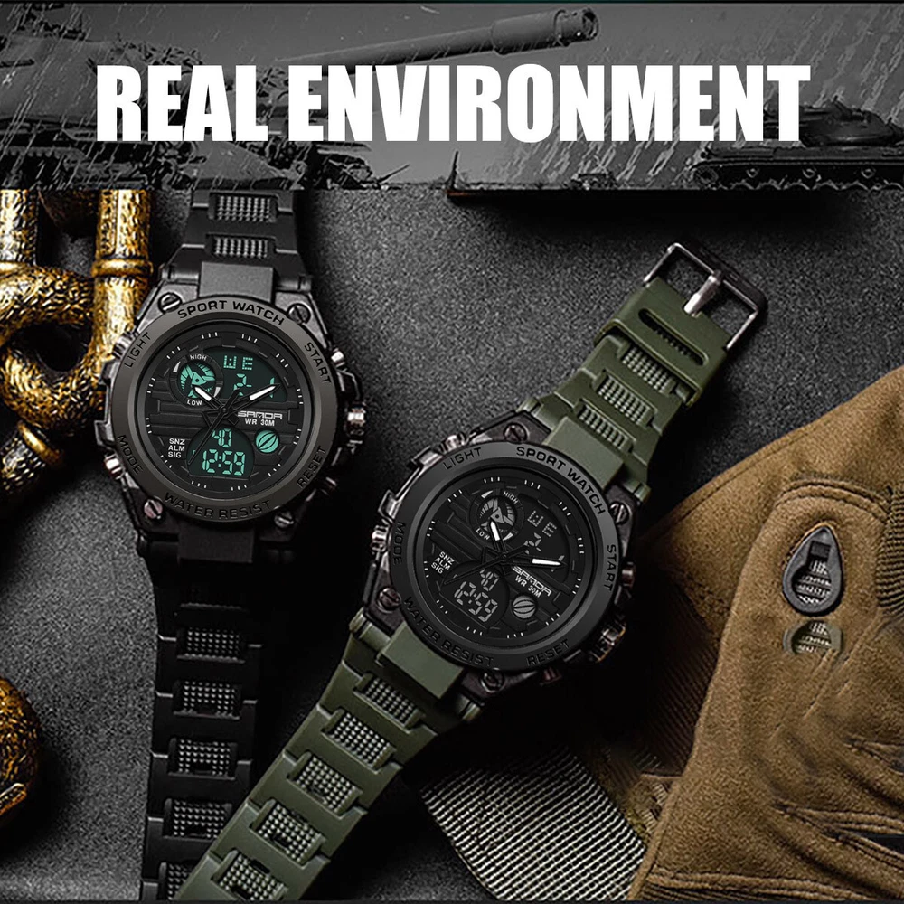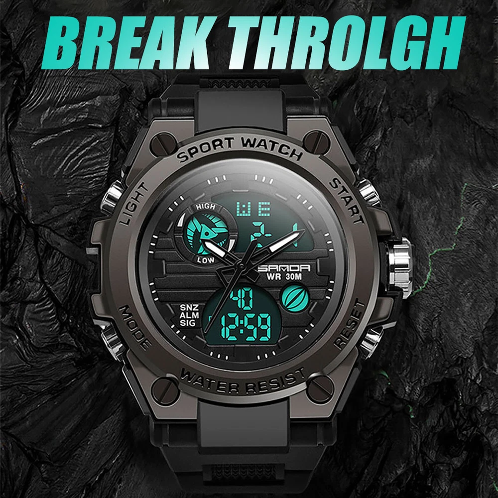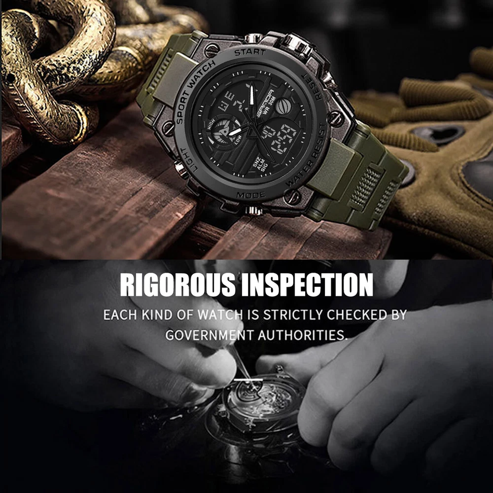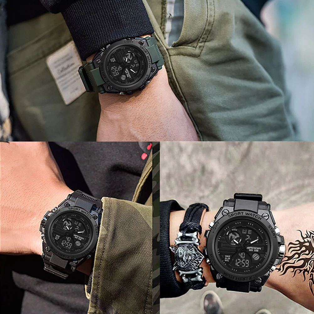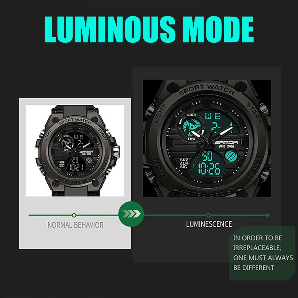 Product Description Description: The watch has a full range of functions, including two clock display of pointer time and digital time, day, month and week display, alarm clock function, snooze function, time on the hour, stopwatch timing function, EL backlight Feature: 1. With a brand new exterior design, wearing a watch not only keeps you up-to-date, but also makes it an essential trendy accessory for men; 2. Imported movement and battery from Japan, high-quality movement ensures accurate watch movement and long battery life; 3. The function of digital electronic clock and pointer quartz clock can set the time of two places simultaneously, making it more suitable for users who work or travel; 4. Calendar, week, alarm clock, stopwatch and other commonly used functions are all equipped to meet daily needs; 5. The watch comes with a soft EL backlight, ensuring clear and unobtrusive viewing of time at night; 6. 30 meter waterproof daily life, watch can be worn in daily showers and swimming, with a thickened case design, fearless of falling and slight bumps. Parameters: Material: PU, plastic, acrylic, metal Type: electronic watch, quartz watch Origin of movement: Japan Battery life: over 1 year Style: tough guy, outdoor, sporty Common functions: dual time, calendar, week, 12/24 hour time system, stopwatch, alarm clock, hour reporting, EL backlight Number of alarm clocks that can be set: 1 Waterproof grade: 30 meters waterproof Watch wearing circumference: minimum 166mm, maximum 223mm Dial width and height: 53mm, 49mm Dial thickness: 16.3mm Band width: 22mm Packaging list: SANDA Sports Watch x1 Product manual x1 Brand label x1 Payment Shipping Terms Returns Contact Us We accept PayPal only. If buyer want to delay the payment because of financial problem, please contact me by the ebay message within 3 days Payment via PayPal (PayPal accepts all major credits/debit cards and eCheque) ECheque payment will tak e 3-10 days to get clear, thus DELAYing the shipment. Handling time: 1 business day (Orders are not processed on weekends & holidays) Tracking information will be sent once item is shipped. Local pick-up is unavailable at the moment. For international shipping and shipping to Guam, Hawaii and Alaska, Please contact us before placing the order. Item is shipped to ebay address. Leaving correct address can minimize delay. For any issues with Defects, Return, Item Exchange request, please contact us first and send us a message first before opening any type of case or request. We devote ourselves making EVERY CUSTOMER in 100% Satisfactory and resolve any problem. We highly value and appreciate your business. Thank you. No returns will be accepted without an RMA number. Please contact us for the RMA number. Return is acceptable within 30 days of delivery. Return for replacement or money back is optional. Returned items must be in the brand new, unaltered and resalable condition. Seller is not responsible for any labor cost, expense in a dealer store, or damage due to wrong installation. Return is accepted within 14 days after the buyer's receiving the item. (Excluding contrived damagement or misusage).100% money-back Guaranteed! All product will be tested in 100% before delivery.If the item is defected by the processing of postage,Buyer has up to 14 days from date of receipt for exchange of a new one.All shipping charges for returned products are to be paid by the buyer,Please contact us for the return address All messages will be answered within 24 office hours. Please contact us either by clicking "contact seller" in the "purchase history" section or simply click "ask a question" at the bottom of this page. If you are unsatisfied with our item or service, please contact us before leaving any feedback. We are committed to resolve all issues in a friendly and satisfactory manner. We always reply to messages within 2 business days (off-duty at weekend). If you do not get a response from us, then please check your junk or spam mailbox. Payment We accept PayPal only. If buyer want to delay the payment because of financial problem, please contact me by the ebay message within 3 days Payment via PayPal (PayPal accepts all major credits/debit cards and eCheque) ECheque payment will tak e 3-10 days to get clear, thus DELAYing the shipment. Shipping Handling time: 1 business day (Orders are not processed on weekends & holidays) Tracking information will be sent once item is shipped. Local pick-up is unavailable at the moment. For international shipping and shipping to Guam, Hawaii and Alaska, Please contact us before placing the order. Item is shipped to ebay address. Leaving correct address can minimize delay. Terms For any issues with Defects, Return, Item Exchange request, please contact us first and send us a message first before opening any type of case or request. We devote ourselves making EVERY CUSTOMER in 100% Satisfactory and resolve any problem. We highly value and appreciate your business. Thank you. No returns will be accepted without an RMA number. Please contact us for the RMA number. Return is acceptable within 30 days of delivery. Return for replacement or money back is optional. Returned items must be in the brand new, unaltered and resalable condition. Seller is not responsible for any labor cost, expense in a dealer store, or damage due to wrong installation. Returns Return is accepted within 14 days after the buyer's receiving the item. (Excluding contrived damagement or misusage).100% money-back Guaranteed! All product will be tested in 100% before delivery.If the item is defected by the processing of postage,Buyer has up to 14 days from date of receipt for exchange of a new one.All shipping charges for returned products are to be paid by the buyer,Please contact us for the return address Contact Us All messages will be answered within 24 office hours. Please contact us either by clicking "contact seller" in the "purchase history" section or simply click "ask a question" at the bot