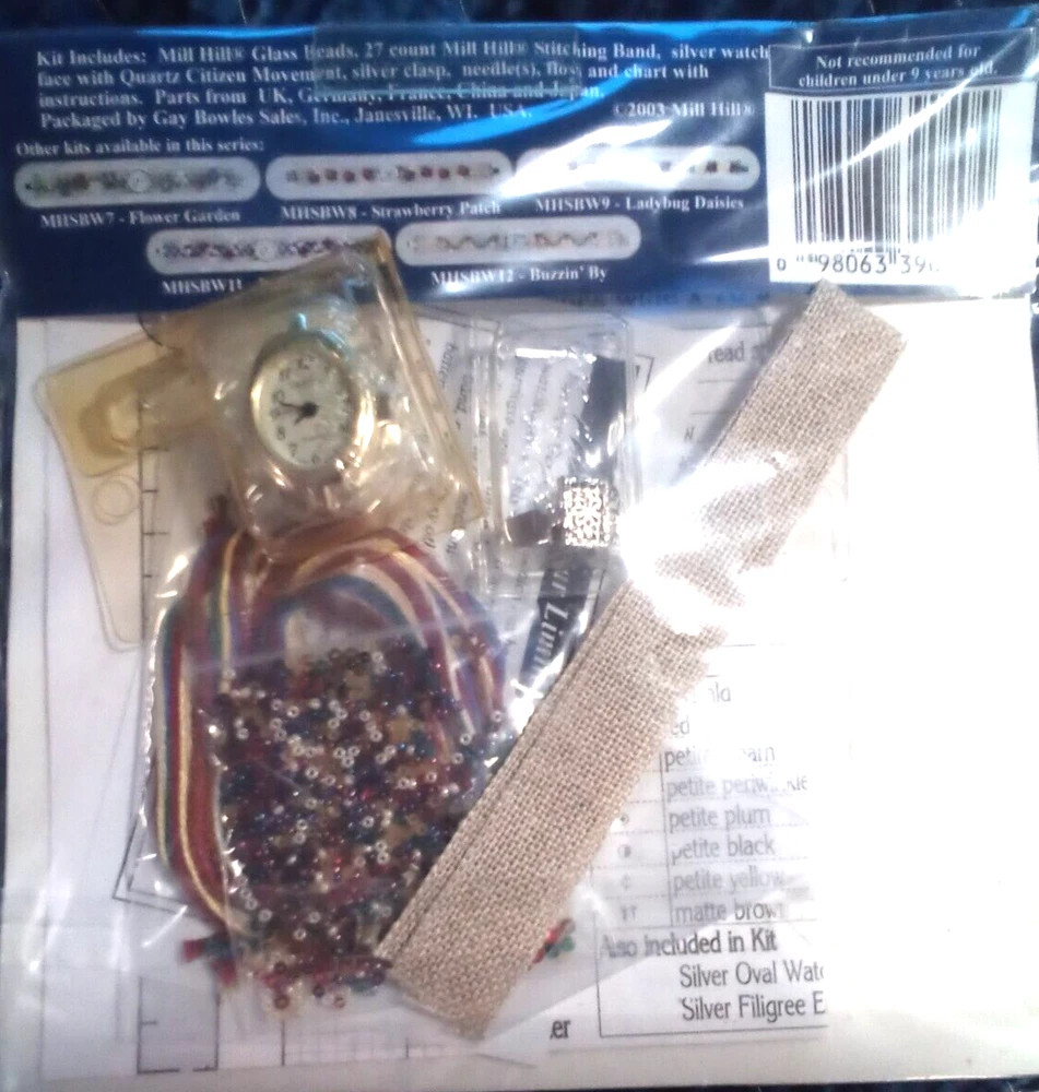 The kit includes Mill Hill 27ct banding for the watch band, beads, needle, silver watch (Quartz Citizen), silver clasp, floss and chart with instructions. The finished size is 3/4" x 7 1/4".
