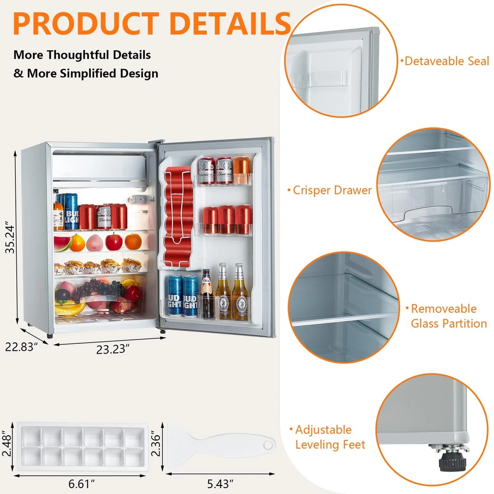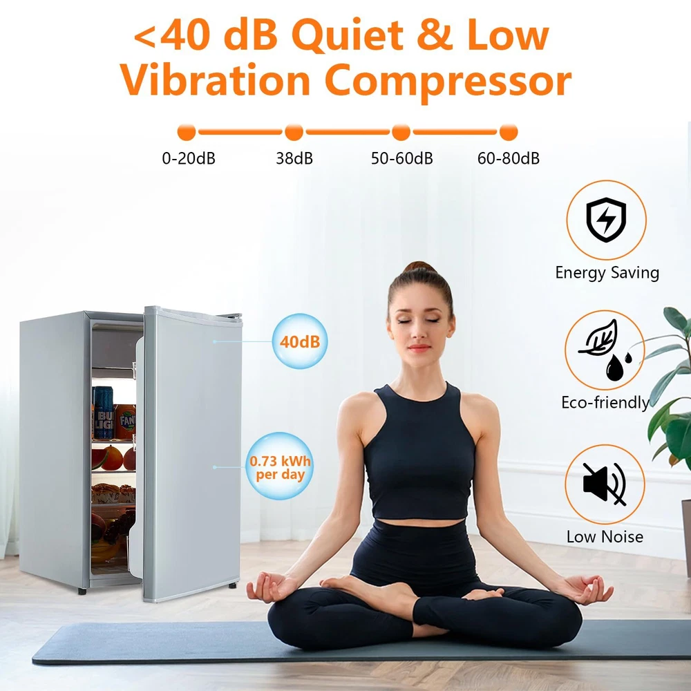 COMPACT SINGLE-DOOR FRIDGE: This 4.3 Cu.Ft mini fridge features a combination of freezer and refrigerator sections, offering 0.4 Cu.Ft freezer and 3.88 Cu.Ft fridge capacity. Ideal for dorms, offices, bedrooms, and RVs, it maximizes storage while saving space. EFFICIENT AND QUIET OPERATION: Operating at a low 40dB and consuming only 0.6 kWh per day, this compact fridge ensures energy efficiency and minimal noise, making it perfect for bedrooms and quiet environments. ADJUSTABLE THERMOSTAT SETTINGS: Equipped with a 7-setting adjustable thermostat, this mini fridge lets you customize temperatures from 32°F to 50°F to keep your food and beverages at their best. The freezer section is perfect for ice cream and ice cubes. STYLISH AND PRACTICAL DESIGN: Featuring a sleek exterior and practical features like a freezer compartment, this mini fridge adds convenience and style to any setting. Ideal for those who want functionality without sacrificing aesthetics. ORGANIZED STORAGE SOLUTIONS: Includes a crisper drawer for fresh fruits and vegetables and adjustable, removable shelves to meet your storage needs. Dimensions: 20.63in x 20.63in x 32.71in. Perfect for keeping your items organized and easily accessible.