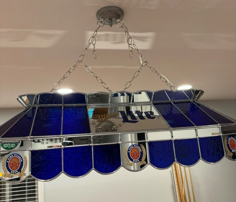 You are bidding on a Miller Lite Beer Billiards Stained Glass Mirror Pool Table Light Lamp 40 inches. The fixture is brand new in the box. This truly sets this lamp far ahead of any other pool light available in the industry. It is very unique. All of our lamps are hand made in the USA. The finest materials are used in the manufacturing of our stained glass lamps. this Pool Table Billiard Game Table Lamp is a must have! STUNNING HAND CRAFTED 40" old world tiffany style stained glass pool table billiard lite. Fully wired in line for direct wire with 3 UL approved high quality porcelain light sockets and two 3.9' heavy duty antique brass chain on each side of the lamp for hanging. (only one cord goes up to the canopy for wiring). Ceiling mount canopy kit included. Handmade in the USA. Light bulbs not included. Lamp measures 40 1/2" long by 16" wide x 11 1/2 high. Logos are silk screen printed on mirror glass to give it a classic bar look 108 individual hand cut pieces of glass 40 1/2" long x 16" wide x 14" high 3 quality high porcelain light sockets recommended bulb wattage: 60W ( BULBS NOT INCLUDED) 10 ft. electric cord for wiring direct wire 3.9' of heavy duty antique brass chain on each side for hanging textured blue stained glass and mirror glass for that old world classic bar look ceiling mount canopy kit included Handmade in the USA The chain attaches to the lamp in three points, those three points form two triangles that come to two points, the two triangles come up of the lamp about 11". Off the two triangles we put 3' of chain. that's almost 4' from the end of the chain to lamp. now we don't advertise that there is 9' of chain, but there is 9' of chain total on the lamp. THIS LAMP IS GREAT FOR Sports Bar and grills Restaurants Taverns Liquor stores Billiard Halls Game rooms Billiard table lighting Poker Table lighting Overhead bar lighting Man Caves/li> Dorm Rooms Dining Tables High Bidder to pay $124.95 shipping, packing, and insurance charges due to the large size of this custom made box for shipping. Please allow approx 4 weeks for delivery as these are hand made. UPS will not deliver to a P.O. Box or Military Addresses. You will need to provide a physical address otherwise we cannot ship your item. Shipping to Hawaii, Alaska, and Puerto Rico will require additional shipping charges due to size of box. Please contact us for rates. Click Here to check out our other pool lights & bar stools for auction on eBay