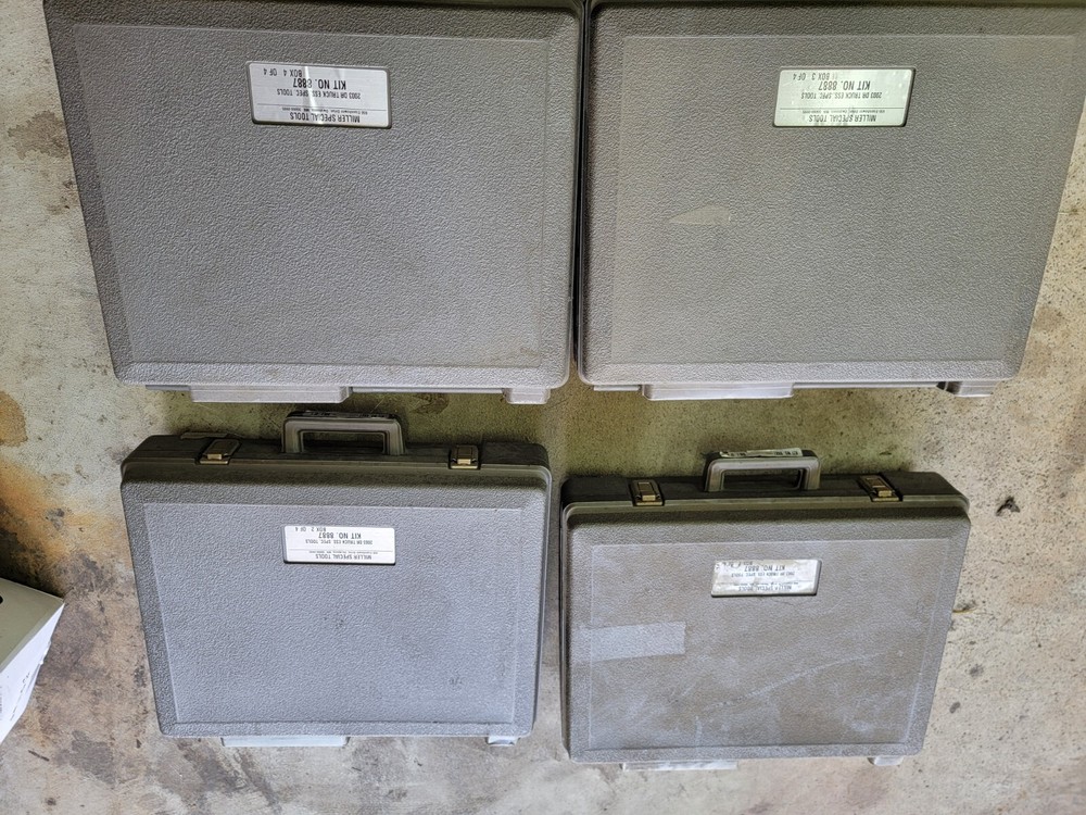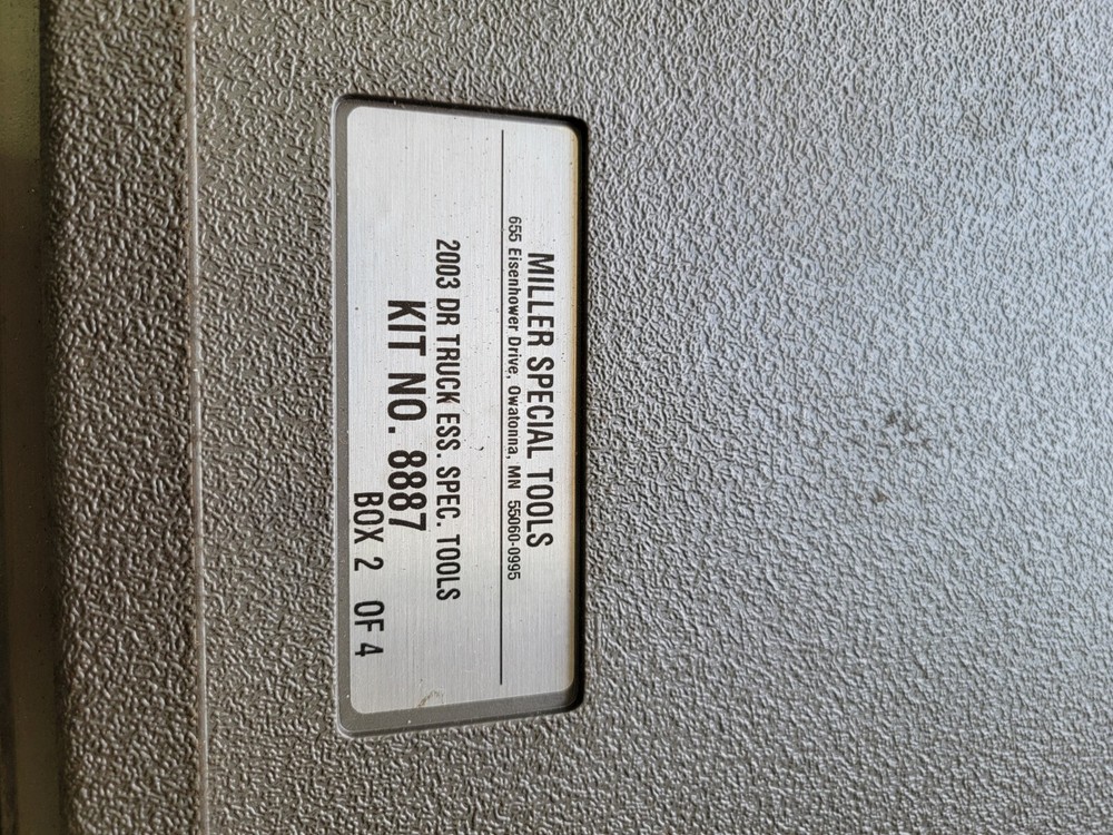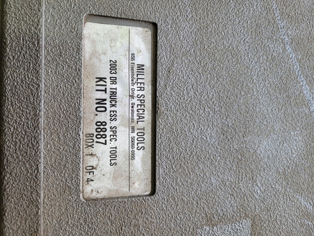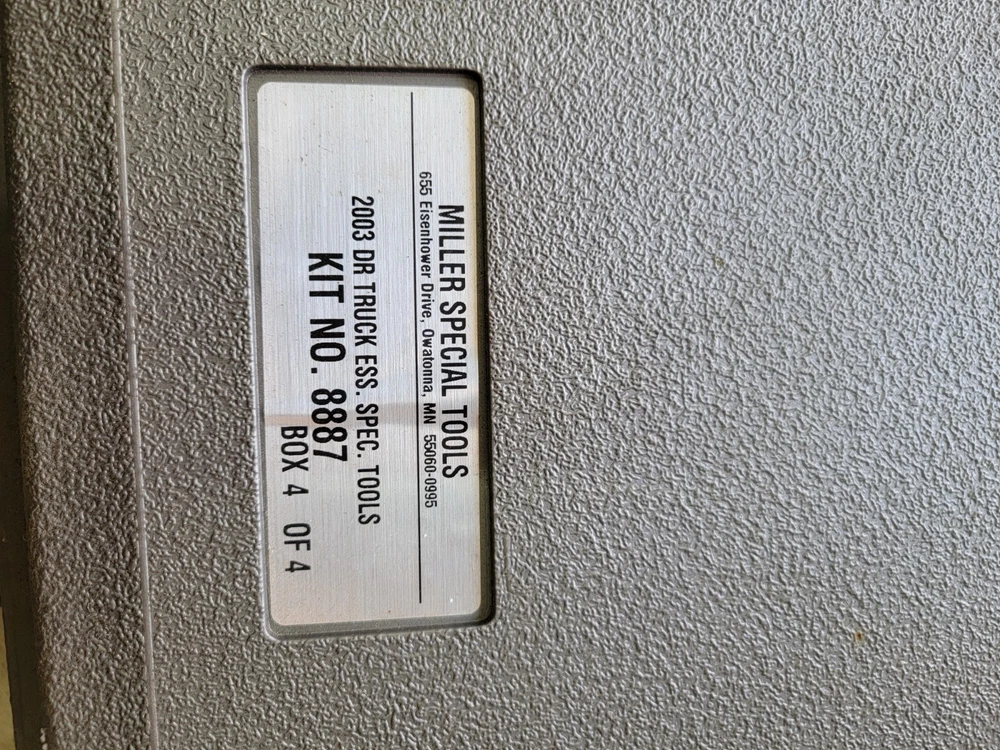 Miller 8887 Dodge Ram Truck Axle Steering Tool Kit SetYou are bidding on a Miller Dodge Ram Truck Axle Steering Tool Kit Set - 4 kit set 8887 1 thru 4. Tool Set is near complete ***Missing two tools box 1 and 2. *** noted below*** Tools are used and overall in good condition and ready for use. Shipping will be separated into 4 different boxes each with their own tracking numbers but shipping price will not be affected.All tools come as pictured. Tool Kit 1 includes 8883 Differential Adjuster Wrench8886 Bearing Cup Installer8888 Differential Bearing Plug8896 Pinion Seal Installer8954 Hub Nut Socket8956 Differential Bearing Installer**** Missing 8959 Bearing Cup Installer8960 Bearing Cup Installer8961 Bearing Cup Installer8962 Bearing Cup Installer8963 Hub Seal Installer8968 Bearing Cup Installer8976 Pinion Diver8977 Pinion Driver Tool Kit 2 includes 6825A Power Steering Adapter8975-1 thru 5 Ball Joint Remover Installer Set8985 Socket8986 Oil Seal Protector8987 Seal Installer8988 Locknut Wrench8989 Seal Installer***** Missing 8990 Oil Seal Remover8993 Oil Seal Protector Tool Kit 3 includes 8289(2)Arbor Discs8878 Pinion Gauge Block8885 Axle Shaft Seal Installer Set8897 Pinion Gauge Block8899 Pinion Gauge Block8964 Differential Bearing Plug8965 Differential Bearing Installer8982 Pinion Installer Tool Kit 4 includes 8498 Axle Shaft Seal Receiver8879 Puller Adapters8881 Bearing Installer8882 Pinion Seal Installer8981 Bearing Installer
