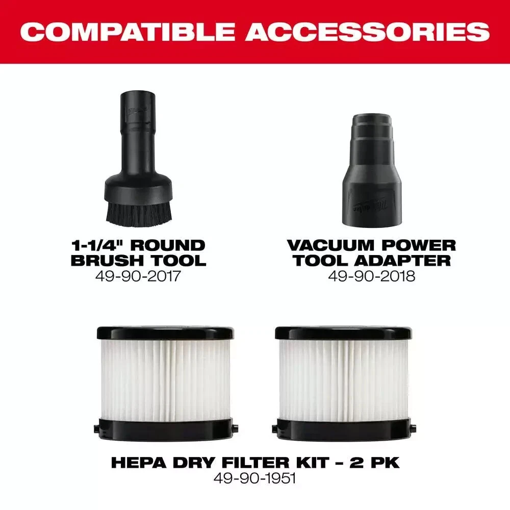 Milwaukee 0882-20 M18 18V Lithium-ion Cordless Compact Vacuum - Bare Tool New Product Details Color: Red Voltage: 18 v Power Method: Cordless Hose Length: 48 in Description The M18 Compact Vacuum provides users with the most powerful & adaptable handheld cleanup tool. A high performance motor creates best in class suction for cleanup of drywall dust, wood/metal shavings, and common jobsite debris. With a unique handheld design, the M18™ Compact Vacuum can be used in a wide variety of orientations and applications across the jobsite. For added versatility, the 0882-20 comes with (2) extension wands, 4’ flexible hose, crevice tool, floor tool, and removable HEPA filter. A clear view and easy to empty canister provides added convenience. As a part of the M18™ System of tools, it is powered by REDLITHIUM™ battery packs, which deliver up to 25 minutes of run time on a XC5.0 battery pack and 43 minutes of runtime on a HIGH DEMAND™ 9.0 Battery Pack. Includes: [1] M18 Compact Vacuum(0882-20) [1] 4' Hose [1] Crevice Tool [1] Extension [1] HEPA Filter [1] Floor Tool Features: High performance motor Adapts from handheld to stationary 40 CFM Removable HEPA filter Clear view and easy to empty canister Canister volume: 36 oz Inlet Diameter: 1-1/4" Battery System: M18 Compatible Batteries: All M18 REDLITHIUM Battery Packs Compatible Chargers: All M18 Chargers 5 Year Limited Warranty