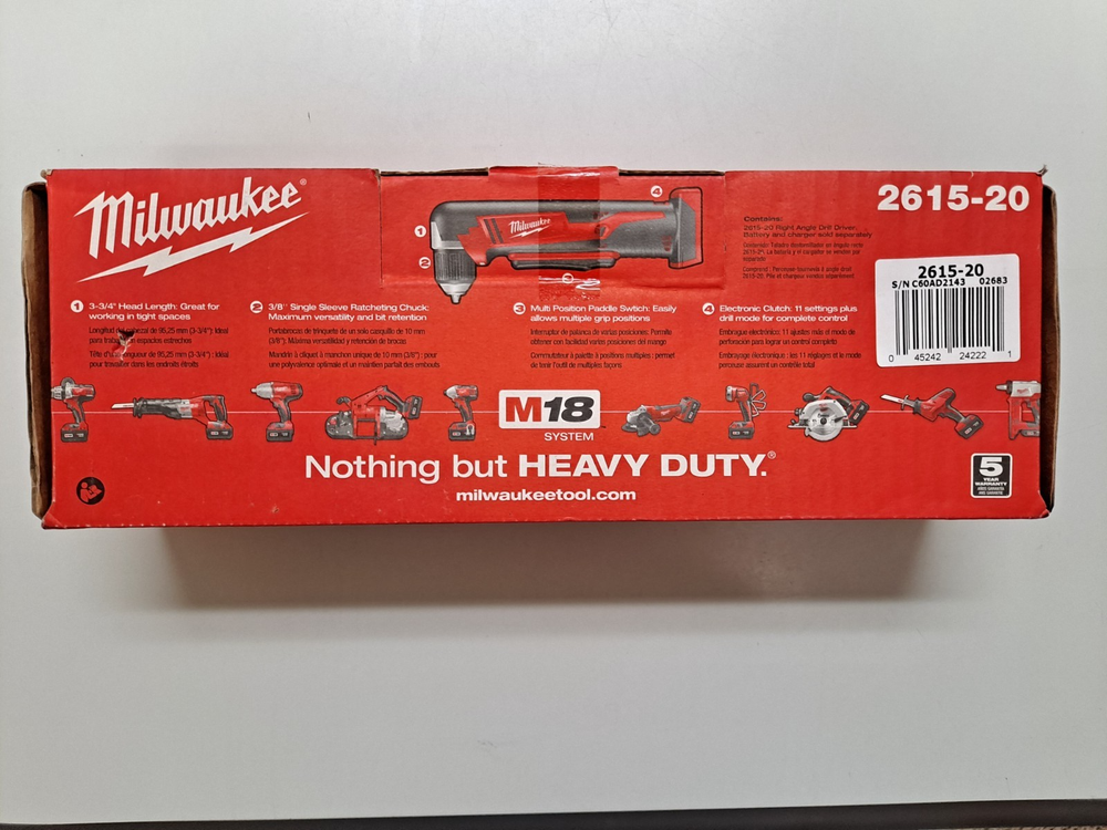 The Milwaukee 2615-20 Cordless Right Angle Drill is a versatile addition to any handymanâs toolbox. This cordless drill can handle a variety of home repair or construction tasks with ease. The model works with bits that fit securely into the 1/2-inch keyless chuck. This dual-power - electric and battery - device can reach top rotational speeds of 1,500 RPM and up to 125 inches-pounds of torque. Designed for work in tight spaces, the head of this drill is just 3 3/4 inches in length and it comes with built-in LED lights that help illuminate even the darkest of workspaces. Weighing in at 2 3/4 pounds, this drill is durable enough to handle big projects yet lightweight enough for you to move from job to job.