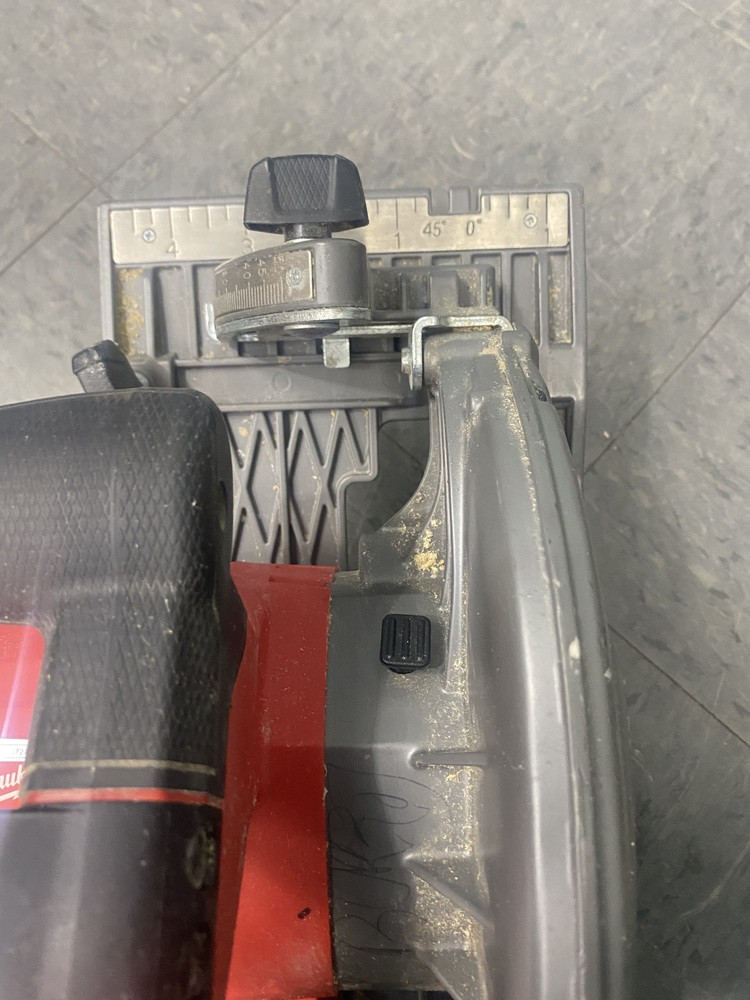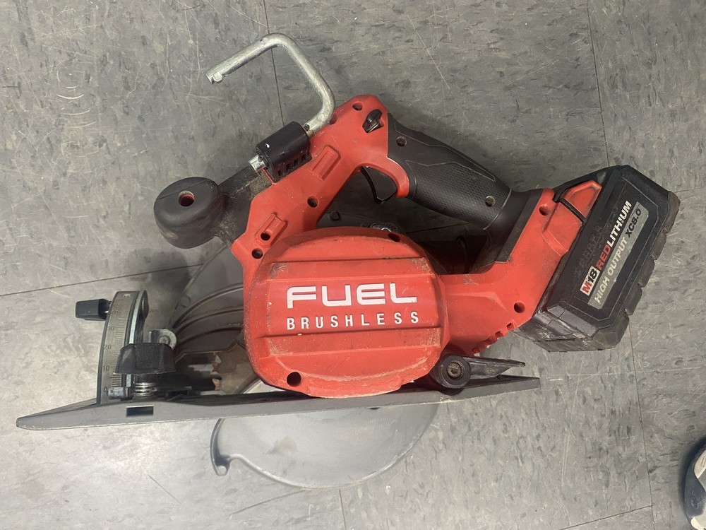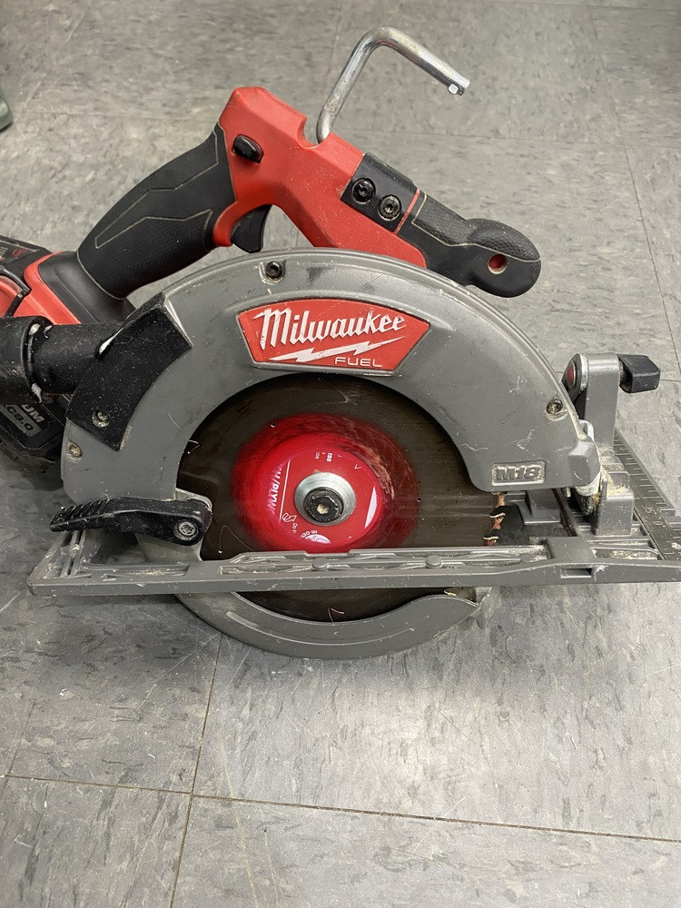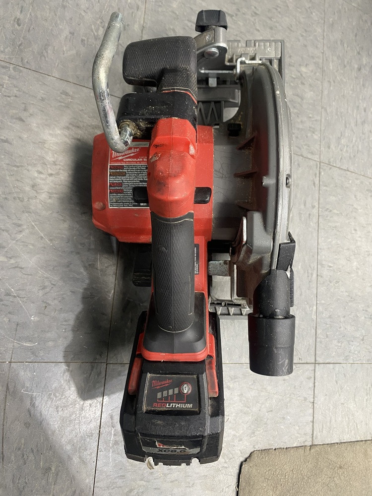 Milwaukee (2732-20) 7-1/4 Inch Cordless Circular Saw + 8.0Ah Battery + Charger This saw has been tested and works well. There are some signs of wear. Some scrapes and scratches. See Pictures. Comes with a M18 8.0Ah battery and charger. About this item Product will either come in original packaging that is in less than perfect shape and has been opened to inspect contents or will come in non-retail packaging (brown/white box or white/clear bag). Magnesium shoe and guards for maximum durability Integrated rafter hook for easy storage between cuts LED light for increased accuracy and visibility Integrated dust port on guard and included vac adapter Electric brake for stopping blade after trigger is released