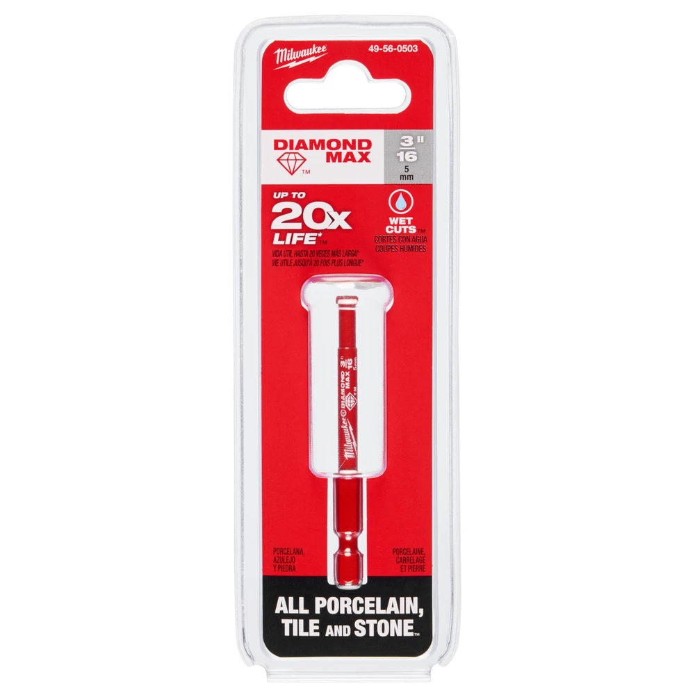 The MILWAUKEE 3/16in. Diamond MAX Hole Saw delivers up to 10X longer life when cutting tile, stone, and glass. Diamond MAX Hole Saws offer best-in-class performance, with higher grade diamonds for maximum heat and fracture resistance. An improved continuous brazed edge provides clean, superior joint strength, and better diamond retention when cutting hard, abrasive materials. The One-Piece Hole Saw has a 1/4in. quick-change hex shank and features a large slug ejection slot. Designed as the single cutting solution for all tile, stone, and glass applications, Diamond MAX offers the lowest cost-per-hole on the market. Milwaukee 3/16in. Diamond Plus Hole Saw, Model# 49-56-0503 Northern Tool Item# 54653 Item Weight: 0.0500 lb(s) Manufacturer: Milwaukee MPN: 49-56-0503 Warranty: . Product Summary: The MILWAUKEE 3/16in. Diamond MAX Hole Saw delivers up to 10X longer life when cutting tile, stone, and glass. Diamond MAX Hole Saws offer best-in-class performance, with higher grade diamonds for maximum heat and fracture resistance. An improved continuous brazed edge provides clean, superior joint strength, and better diamond retention when cutting hard, abrasive materials. The One-Piece Hole Saw has a 1/4in. quick-change hex shank and features a large slug ejection slot. Designed as the single cutting solution for all tile, stone, and glass applications, Diamond MAX offers the lowest cost-per-hole on the market. Payment Instructions You can pay us securely through eBay. All orders will contain an invoice/receipt. IMPORTANT: We will not honor requests to remove invoices or receipts from packages. No exceptions ON U.S. PURCHASES, Northern currently collects sales tax on purchases shipped to all states except: Alaska, Delaware, Montana, New Hampshire, Oregon Shipping Information This product will be shipped by Parcel. Parcel Shipping: Ground Shipped items must be sent to a physical address and cannot be sent to PO boxes. If a PO box address is submitted without a physical address it may delay your order. We cannot ship to APO/FPO boxes. Please note that we do not ship items on weekends or holidays. More information on shipping and handling times can be found on our Store Policies Page . Customer Care We want you to be satisfied with your purchase; please notify us by email if you have any concerns. Before you send an email message, please check our Help Section . We may already have an answer to your question! We are available to answer your email questions Monday through Friday from 8am - 3pm CST, excluding holidays. If your email is sent on a weekend, holiday or after business hours, we will respond to you on the following business day. Returns may be accepted on most items within 30 days of receipt of the item. All returns require authorization from us. Some returns are charged a 15% restocking fee. Please click the Shipping and Payments tab on this item for specific return information and full details. About Our Products Product Warranty: Warranty information and contact details can be found on our Store Policies Page. We are working hard to ensure that the information provided on the eBay product advertisements is accurate and up-to-date. We reserve the right to correct ad errors and/or omissions. Pricing and availability is subject to change without notice. No