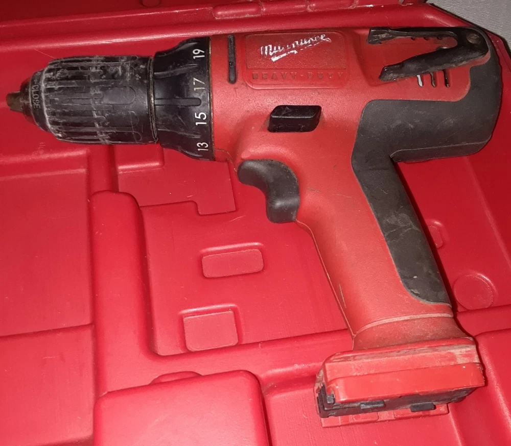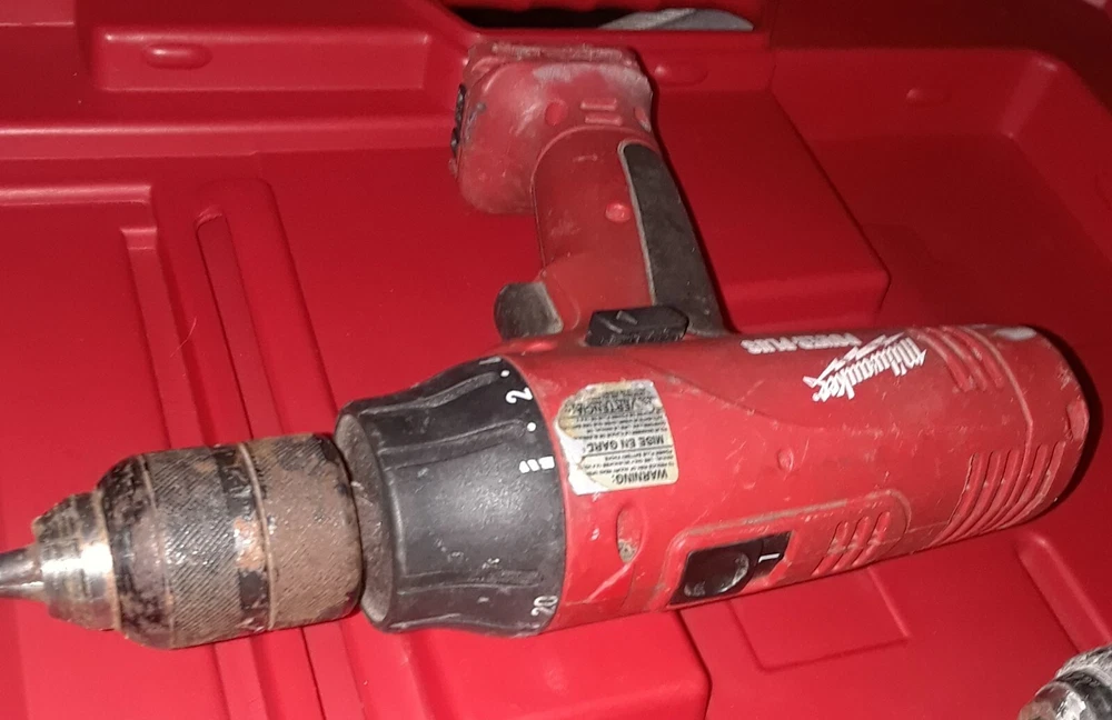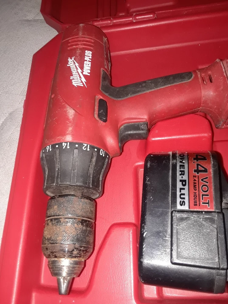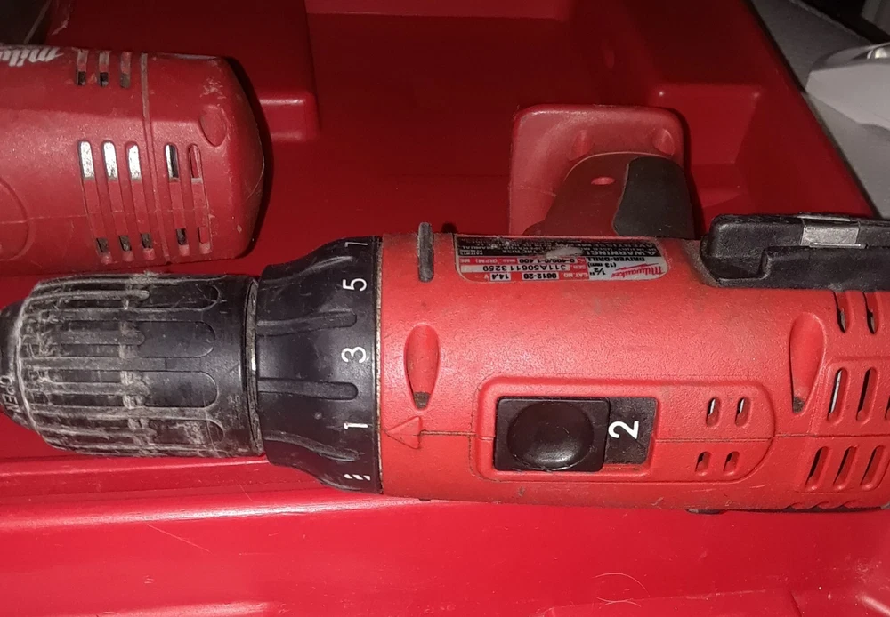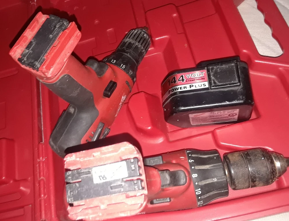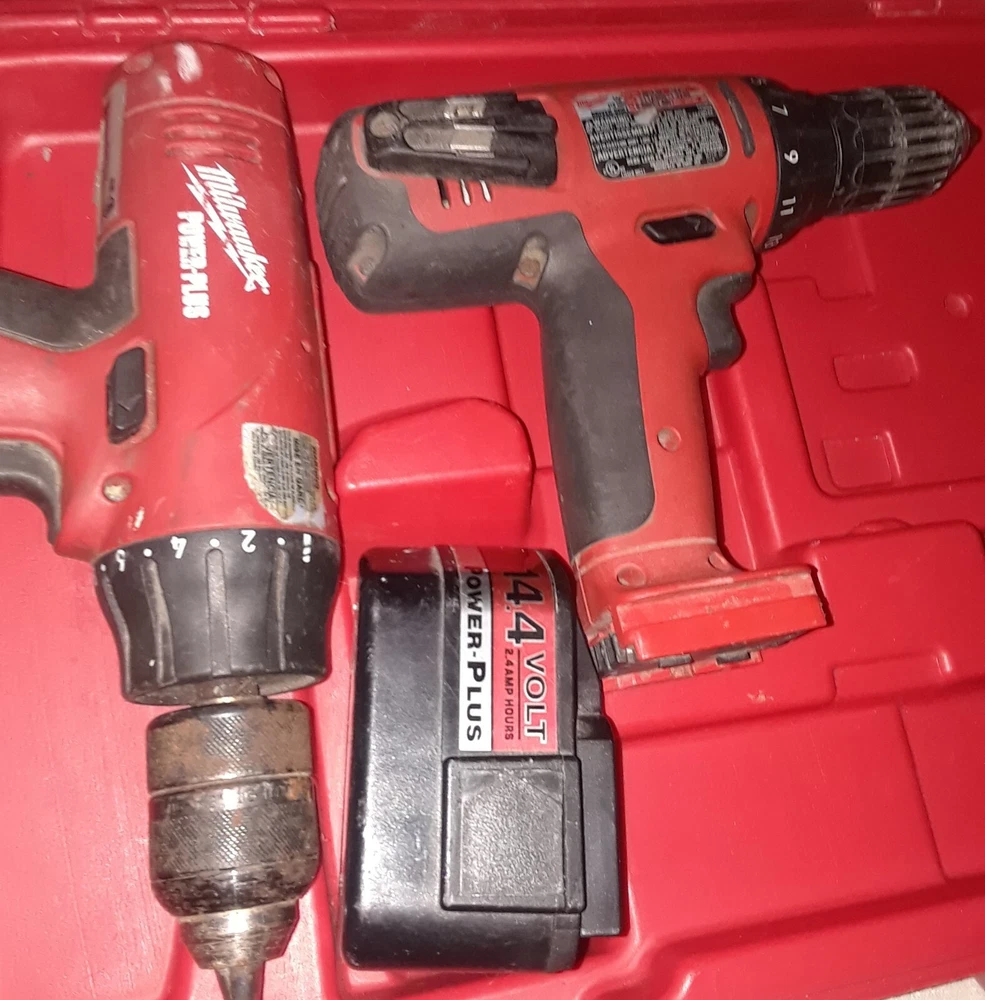 Milwaukee Drills 05-1620 06-1220 14.4v + Case - Not Tested for Parts Only. items Not Working As Shown in Picture. They Pre-Own Use, for Parts Only. I am not able to Test as I do not have charger to juice up the one battery and see if they working. The Power Plus one you can turn the main drill portion and it sound like regular drill, the other one i can't turn, also i can't smell any type odor like when something burns out like a car stereo and stuff, also the battery clip on and off no problem, and all the buttons appear to function, they not stuck or jam. now this don't imply that they not burn out or defective i don't know if that help any, just try to describe best way. Sale is for everything 2 drills 1 battery and case. i answer question best i can, i respond as kwik as possible, probably within minutes, or an hour or so, just depend, i mean you know. Also have a Milwaukee Radio that i put up as separate sale. These items belong to my wife uncle, we couldn't find the chargers and other stuff that may be missing. apologies. I Ship Out Real Kwik to You.