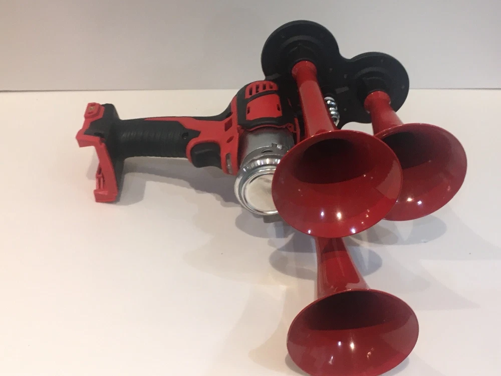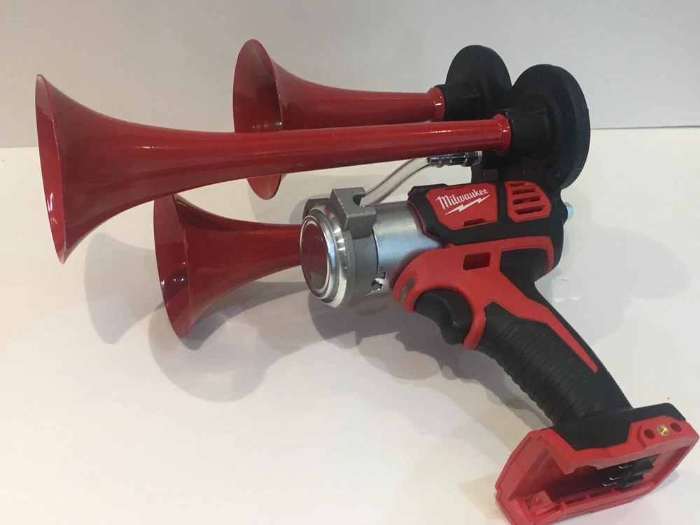 Milwaukee M18 Cordless Handheld and Very Loud ,Variable Tone, Air Horn - Train Horn. Comes w/Billet Finish Compressor & 3 Red Trumpets, Longes One is 11 Inches . Excellent Balanced Horn w/Stainless Steel Mounting Hardware and Working LED Light. May Include Clear, Red or Black Air Hose > Preferred hose color can be noted on checkout < Battery Not Included ! Trumpets may be RemovedUnscrewed) for Easier Siping & Handeling ! Compatible w/All M18 Batteries. In Mint Condition. Fast Shipping. Thanks for Your interest and God bless.
