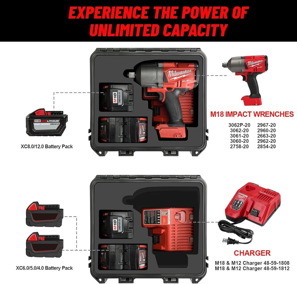 This hard case is perfect for keeping your Milwaukee M18 impact wrench and torque wrench safe! The waterproof design is tough enough for job sites, and the snug fit protects against bumps and drops. It has plenty of space for batteries and a charger tooβgreat organization without any bulk. Durable, well-built, and exactly what I needed to keep my tools secure on the go. Highly recommend for anyone with M18 tools!