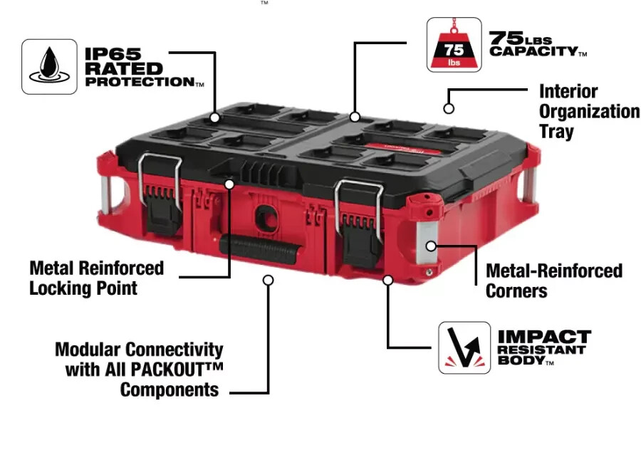 Milwaukee 48-22-8424 PACKOUT 22 in, 75 Pound. Medium Tool Box Black/Red- New About This Product The PACKOUT modular storage system is the industry's most durable and versatile storage system. The PACKOUT tool box is constructed with impact resistant polymers and metal reinforced corners so it can withstand harsh jobsite environments. The tool storage box connects with all other PACKOUT system components via integrated locking cleats and features a 75 lbs. of weight capacity. An IP65 rated weather seal protects tools and accessories from rain and other jobsite debris. Interior organizer trays allow users to keep equipment organized to fit their needs. A carry handle and reinforced hinges ensure the tool box is easily transportable wherever it is needed. The PACKOUT modular storage allows users to customize and build their own storage system to easily transport and organize tools and accessories. Highlights - IP65 rated which means you can have peace of mind that your toolbox will protect your tools against low pressure water, like rain or small jobsite mishaps, as well as offering full protection against dust and other particles - Metal reinforced corners - Metal reinforced locking point - Interior organizer trays - Mounting location for the one-key tick - a Bluetooth tracking device for Packout products - Heavy-duty latches - Reinforced hinge Dimensions Maximum Handle Length (in.): 6 in Product Depth (in.): 16 in Product Height (in.): 6.5 in Product Width (in.): 22 in Details - Color Family: Red - Color/Finish: Red - Features: Lid Strike, Lockable, Padded Handle - Holding Capacity (cu in.): 1200 cu in - Included Accessories: No Additional Items Included - Material: Resin - Modular Storage Type: Medium Box - Modular System Type: Milwaukee Packout - Product Weight (lb.): 10.21 lb - Tool Box Type: Modular Tool Box - Tool Storage Product Type: Modular Tool Box - Tools Product Type: Tool Storage - Weight Capacity (lb.): 75