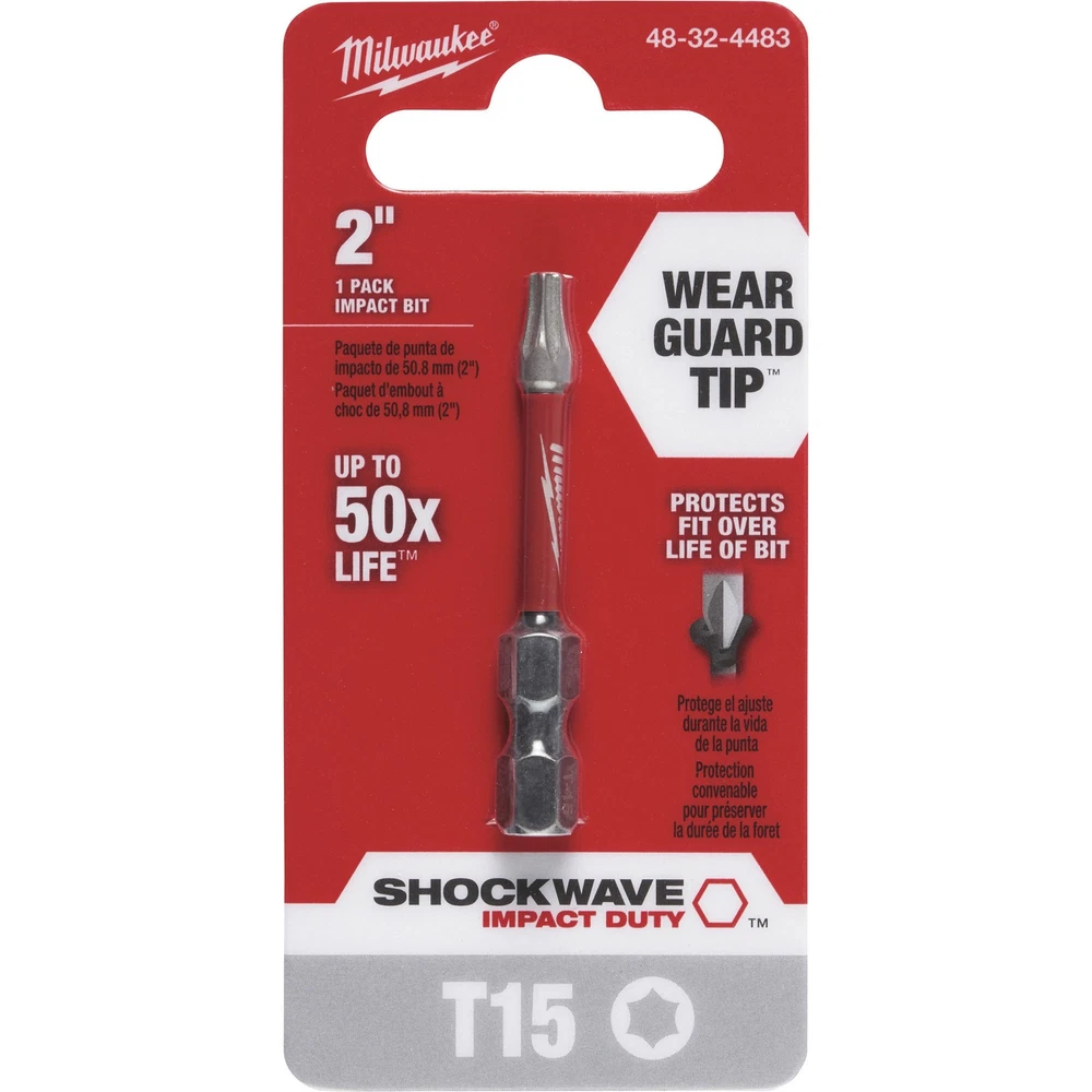 Milwaukee® Shockwave™ Impact Duty™ driver bits are engineered to be the most durable, best fitting driver bits on the market. The optimized Shockzone™ geometry is unique for each tip type to provide up to 30x longer life and absorbs 3x more torque vs. other impact bits. The Precise Fit Custom Machined Tip™ prevents stripping and reduces wobble while the Custom Alloy76™ Steel and proprietary heat treat process maximizes resistance to wear and shock. Shockwave driver bits are built to deliver extreme durability for the most demanding applications. Milwaukee Shockwave Impact Duty Driver Bit, 2in., Torx T15, Model# 48-32-4483 Northern Tool Item# 66972 Item Weight: 0.0100 lb(s) Manufacturer: Milwaukee MPN: 48-32-4483 Warranty: . Product Summary: Milwaukee® Shockwave™ Impact Duty™ driver bits are engineered to be the most durable, best fitting driver bits on the market. The optimized Shockzone™ geometry is unique for each tip type to provide up to 30x longer life and absorbs 3x more torque vs. other impact bits. The Precise Fit Custom Machined Tip™ prevents stripping and reduces wobble while the Custom Alloy76™ Steel and proprietary heat treat process maximizes resistance to wear and shock. Shockwave driver bits are built to deliver extreme durability for the most demanding applications. Payment Instructions You can pay us securely through eBay. All orders will contain an invoice/receipt. IMPORTANT: We will not honor requests to remove invoices or receipts from packages. No exceptions ON U.S. PURCHASES, Northern currently collects sales tax on purchases shipped to all states except: Alaska, Delaware, Montana, New Hampshire, Oregon Shipping Information This product will be shipped by Parcel. Parcel Shipping: Ground shipped items must be sent to a physical address and cannot be sent to a PO box. If a PO box address is submitted without a physical address, it may delay your order. We cannot ship to APO/FPO boxes. Please note that we do not ship items on weekends or holidays. More information on shipping and handling times can be found on our Store Policies Page . Customer Care We want you to be satisfied with your purchase; please notify us by email if you have any concerns. Before you send an email message, please check our Help Section . We may already have an answer to your question! We are available to answer your email questions Monday through Friday from 8am - 3pm CST, excluding holidays. If your email is sent on a weekend, holiday or after business hours, we will respond to you on the following business day. Returns may be accepted on most items within 30 days of receipt of the item. All returns require authorization from us. Some returns are charged a 15% restocking fee. Please click the Shipping and Payments tab on this item for specific return information and full details. About Our Products Product Warranty: Warranty information and contact details can be found on our Store Policies Page. We are working hard to ensure that the information provided on the eBay product advertisements is accurate and up-to-date. We reserve the right to correct ad errors and/or omissions. Pricing and availability is subject to change without notice. No