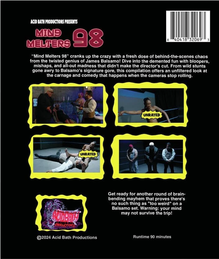 Further Details Title: Mind Melters 98 Condition: New Format: Blu-ray Description: Mind Melters 98 cranks up the crazy with a fresh dose of behind-the-scenes chaos from the twisted genius of James Balsamo! Dive into the demented fun with bloopers, mishaps, and all-out madness that didn't make the director's cut. From wild stunts gone awry to Balsamo's signature gore, this compilation offers an unfiltered look at the carnage and comedy that happens when the cameras stop rolling. Director: James Balsamo Actor: James Balsamo Rating: MPAA Not Rated No Of Discs: 1 Run Time: 1 hour and 30 minutes Country/Region of Manufacture: USA Studio: Acid Bath EAN: 0840418320693 Region Code: Blu-ray: A (Americas, Southeast Asia...) Missing Information? Please contact us if any details are missing and where possible we will add the information to our listing.