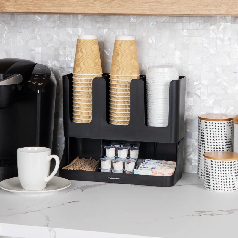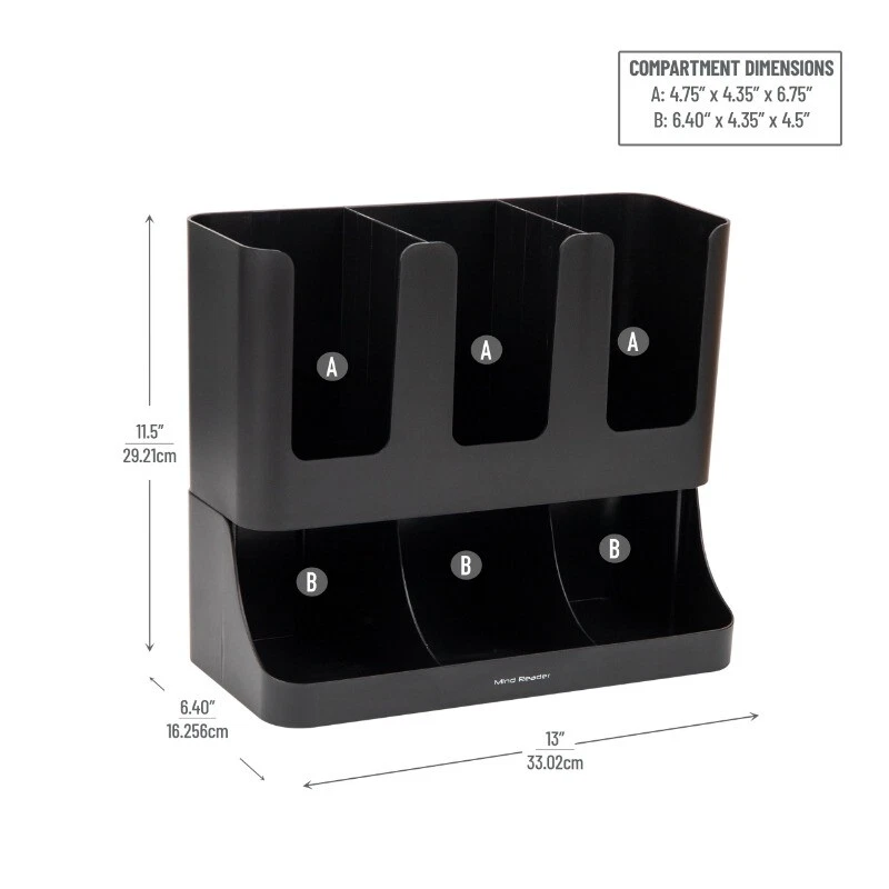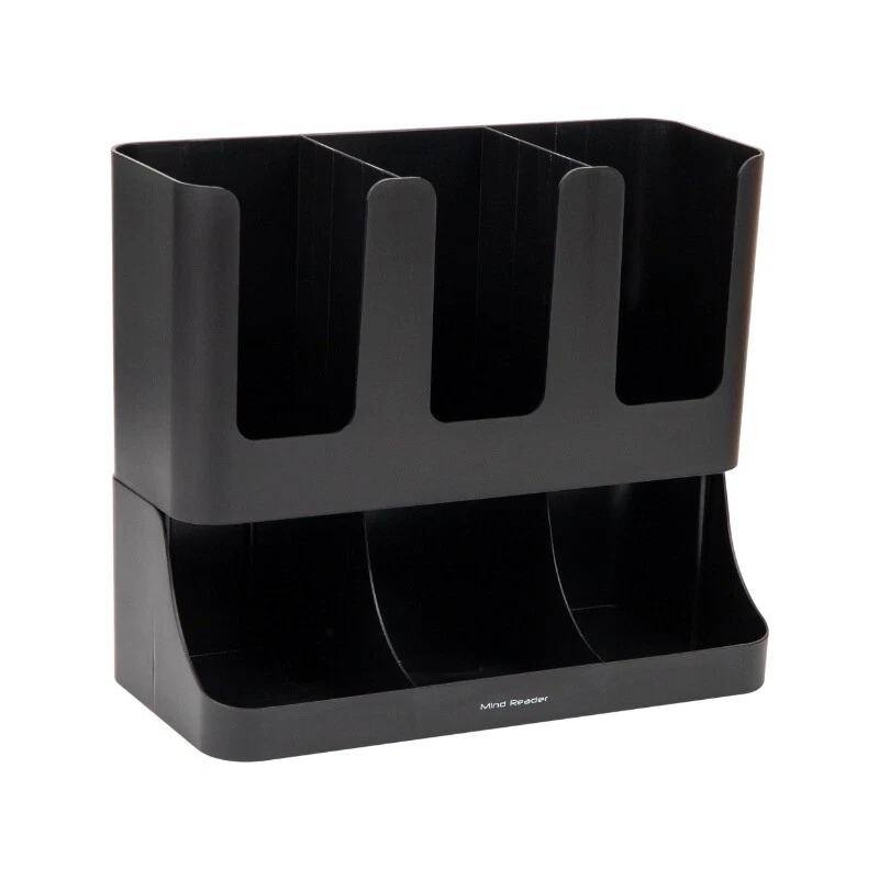 Multipurpose Coffee and Tea Condiment Organizer by Mind Reader Keep your coffee and tea necessities neatly organized with this versatile condiment organizer. With six distinct compartments, it offers convenient storage for coffee and tea cups, lids, and a variety of related condiments such as sugar, sweeteners, and creamers. This organizer is perfect for decluttering your office breakroom, hotel coffee bar, or home kitchen countertop, eliminating the need to rummage through drawers or clear clutter from surfaces. But it's not limited to coffee and tea supplies. It also serves as an efficient beverage station in bed and breakfasts, hotels, and conference centers. It can accommodate condiment packets too, from lemon and honey to ketchup and mustard. Planning a party or backyard barbecue? This lightweight organizer offers portable convenience. Easily move it around to suit your event's needs. Versatile storage solution: This cup and condiment organizer is perfect for storing cups, lids, and coffee/tea accessories, but can also be used for organizing other condiments or office supplies Efficient condiment organization: The two-tiered design of the organizer allows you to easily see and access your condiments, saving you time and effort in the morning rush Stylish and space-saving: With its stylish design and compact size, this organizer requires no assembly and seamlessly blends with most existing decor, while maximizing your available space Optimal dimensions: Measuring 13 inches long x 6.4 inches deep x 11.5 inches tall (33.02 x 16.26 x 29.21 centimeters), this organizer fits neatly on your office desk or kitchen countertop, providing efficient storage without taking up too much space