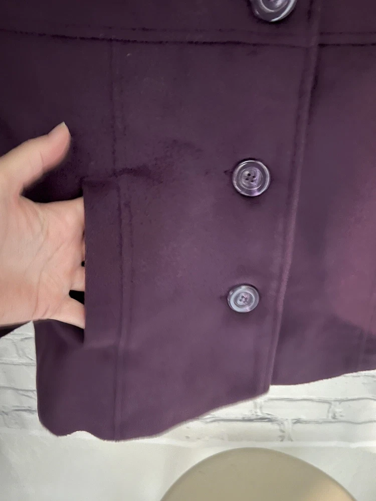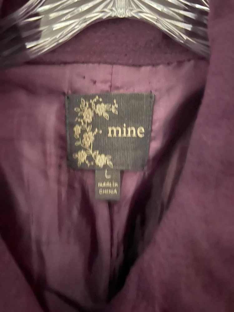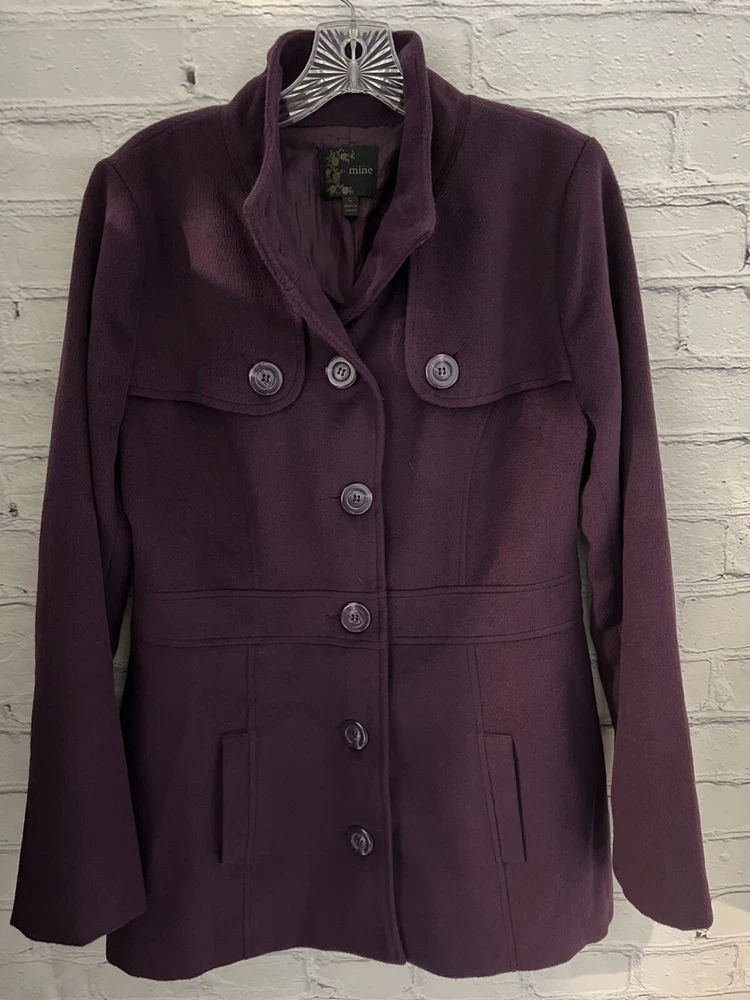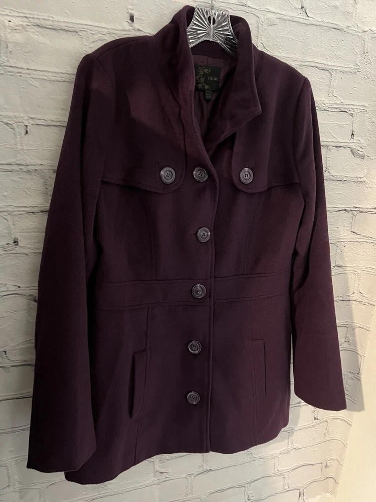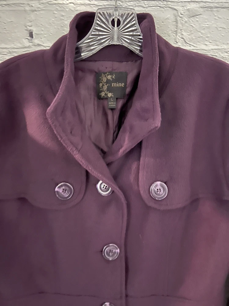 Mine Solid Purple Coat Lined Button Front Pockets Junior's Size Large Material: shell 93% polyester / 7% rayon. lining 100% polyester Measurements laying flat: underarm to underarm - about 20"; shoulder to hem - about 29" Inventory: Hang220