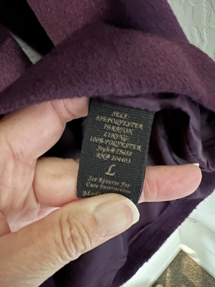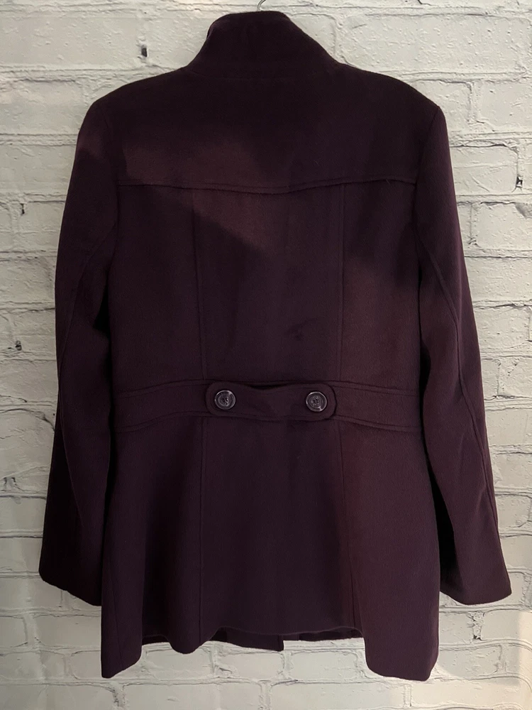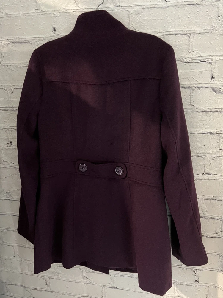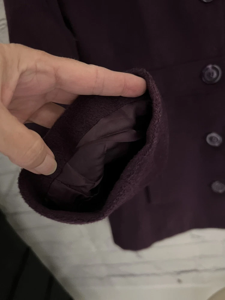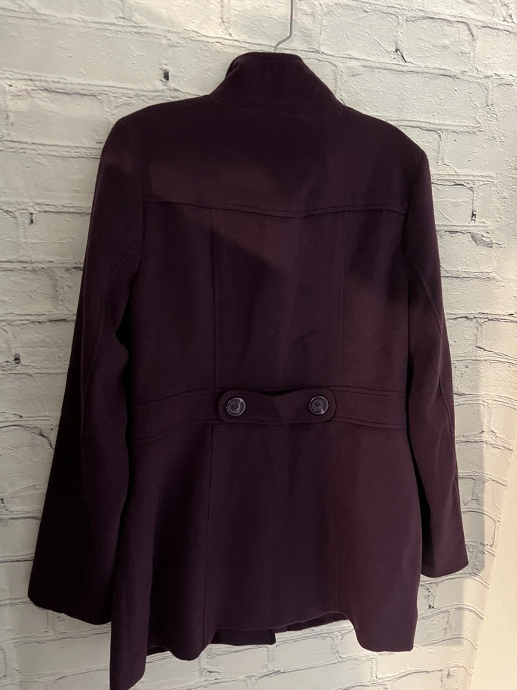 Mine Solid Purple Coat Lined Button Front Pockets Junior's Size Large Material: shell 93% polyester / 7% rayon. lining 100% polyester Measurements laying flat: underarm to underarm - about 20"; shoulder to hem - about 29" Inventory: Hang220