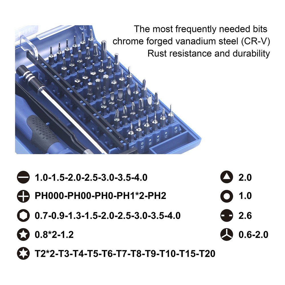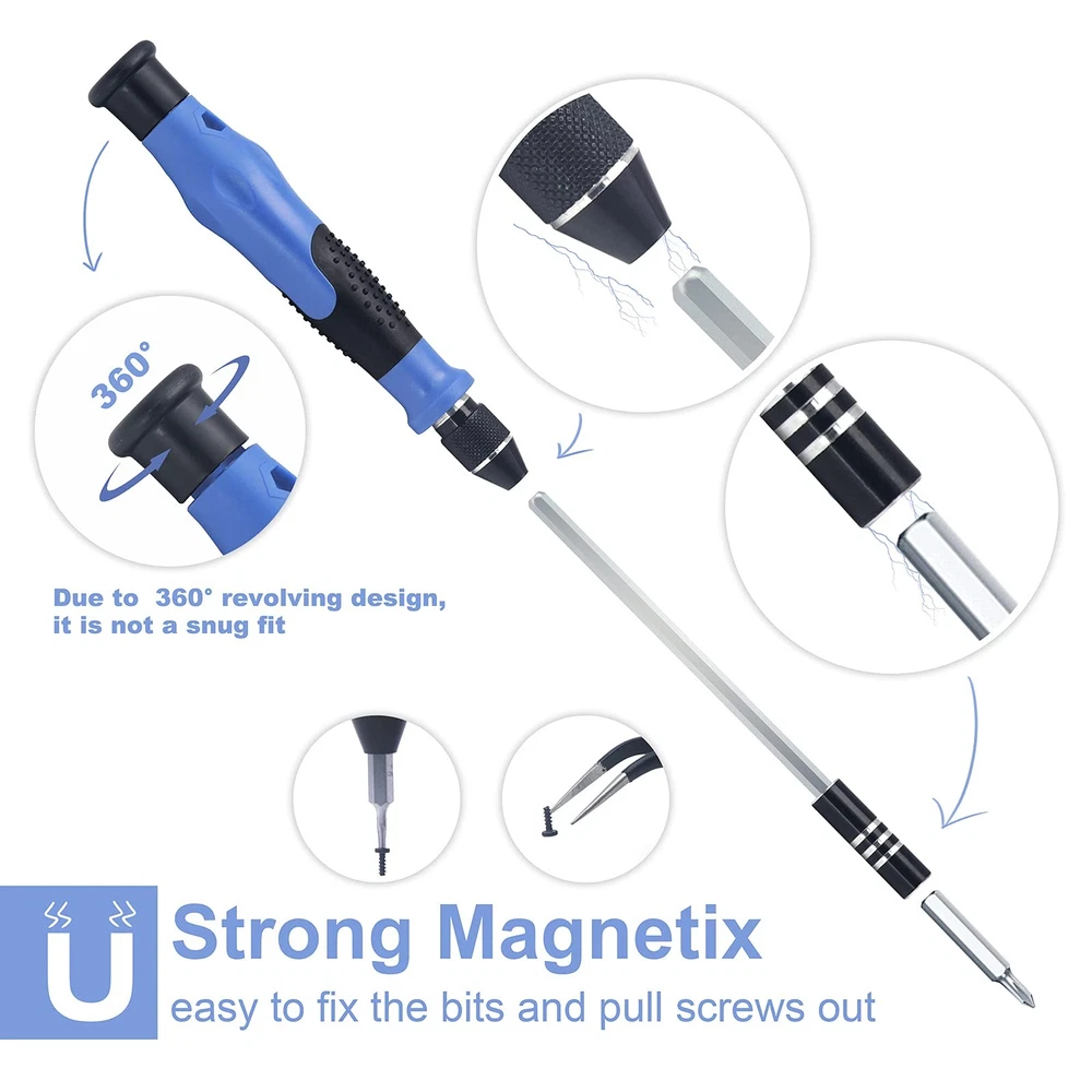 45 in 1 Precision Screwdriver small torx screwdriver set with 120mm Extension Rod & Anti-Slip Handle&Tweezers Bits are made of industrial-grade CR-V steel with high hardness. Scrwedriver Handle is ergonomically shaped and encapsulated non-slip which is comfortable. 120 mm extension rod allows you to repair narrow parts more conveniently. Antistatic Tweezers protects electronic components from damage caused by static electricity. Doesn't stick to small parts, which increases efficiency. There is a partition inside the plastic shell above the bit, so the bit will not run around when the tool box is closed, and it can keep the tool box tidy You can easily open the housing with the OPEN button. The small case can be put in the pocket. Package Includes 1 x Screwdriver Handle 1 x 120mm Extension Rod 42 x Screwdriver Bits 1 x Tweezers Wide Application: 45 in 1 Miniature Screwdriver Set is widely used for household appliances maintenance and is a professional repair tool compatible with computer, smartphone, game console, tablets, pc, camera, glasses, etc. A variety of commonly used bit models to meet your daily needs. The Multi-use tool is also suitable as a unique and practical gift for Father's Days, Birthdays, Christmas, Thanksgiving, and Valentine's Day gifts. Computer Repair Kits of High Quality: The bits are made of high-strength chrome vanadium steel, which provides rust-proof and extreme durability. And the multi-magnetic driver makes it easy to fix bits and pull screws out. Extension Rod and Non-slip Handle: Equipped with a 120mm extension shaft, you can easily align the bits even if the position of the screws is deep and narrow. And the handle makes of PP and TPR is non-slip and ergonomic. It feels great in the hand. The end cap can be rotated freely so that you can also do it with one hand. Simple and Portable: The mini screwdriver set with case can be put into the pocket. You can easily open the housing with the OPEN button. It's great for home and office storage. You can work on your projects yourself anytime, anywhere. Packaging & Service: Magnetic driver repair tool kit includes 42 bits, a non-slip handle, an extension rod and tweezers. We always put our customer experience as our priority, and we also provide an 18-month warranty for all of our products. If you have any problem about our products, please don't hesitate to contact us. We will try our best to solve your problem within 24 hours.