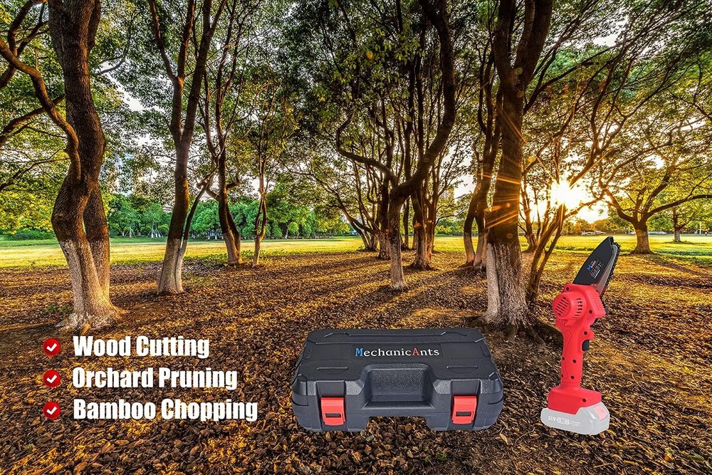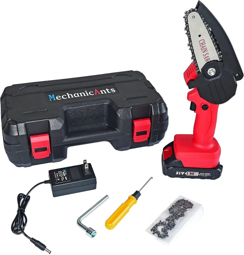 ✔MechanicAnts mini chainsaw is specially designed for wood cutting, branches pruning and gardening. -Powerful but lightweight, women can easily one hand operate, save time and effort. ✔Come with tool box and no installation required, can be a great gift for your parents and grand-parents. ✔Package Includes: 1* Tool box 1* MechanicAnts mini chainsaw 1* 1500 mAh battery 1* Charger 1* Screwdriver 1* Wrench 2*Saw chains ✔Product Specification: -Motor power: 550W -Battery voltage: 21V -Battery capacity: 1500mAh -Charger input: 100-240V AC 50-60Hz -Charger output: 21V 0.8A DC -Guide plate length: 4inches -Chain speed: 5M/S ✔Cautions in Use: -Please remove the battery when touching the chain; -Be away from children to avoid accidental injury.