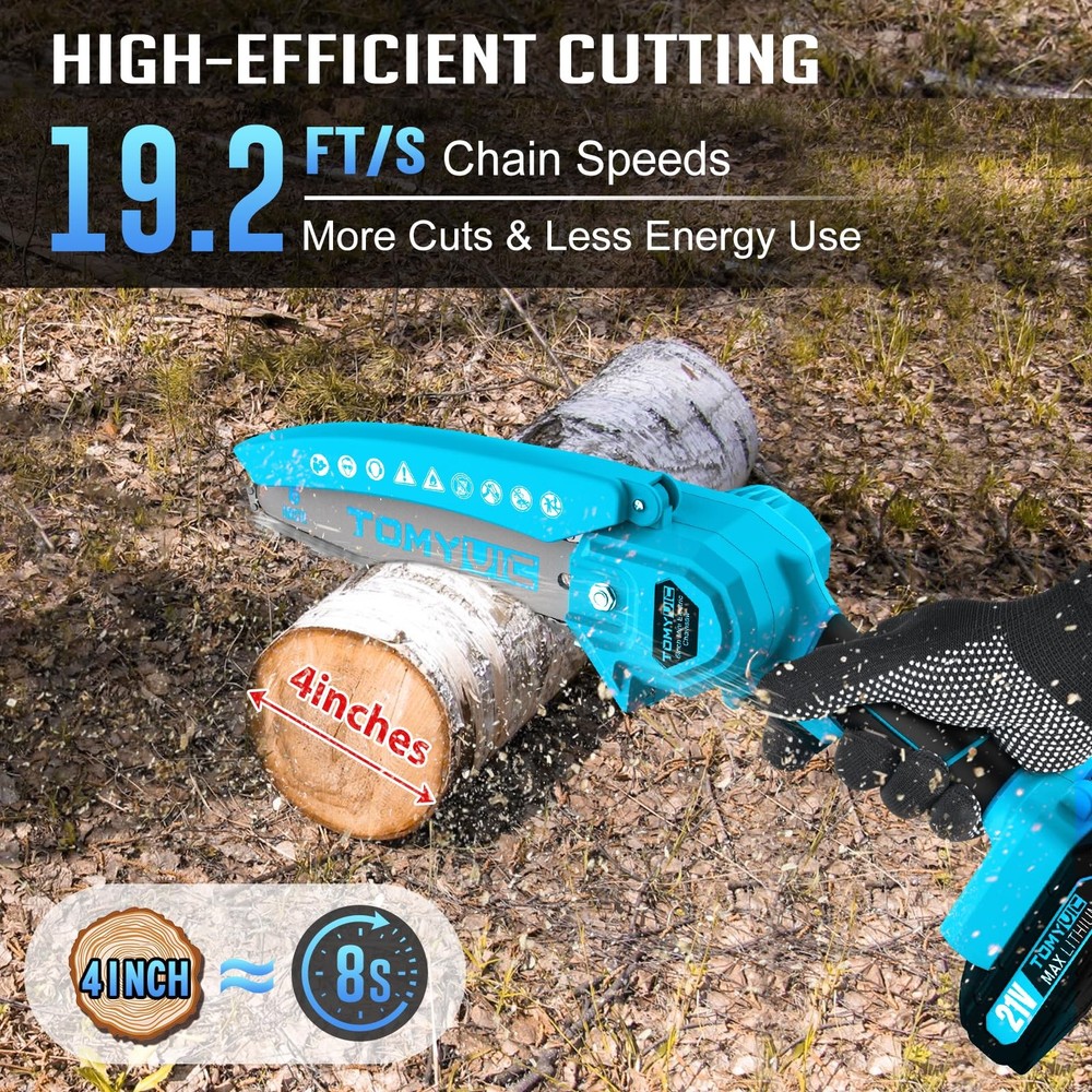 This mini chainsaw is a game-changer! It cuts through 6-inch logs in seconds, making yard work a breeze. Super lightweight at just 2.5 lbs—super easy to handle, even with one hand. The two included 21V batteries last forever, and the safety features give peace of mind. Perfect for small spaces, and surprisingly powerful for its size. No cords, no hassle—just fast, efficient cutting. Highly recommend for anyone needing a compact yet mighty saw!
