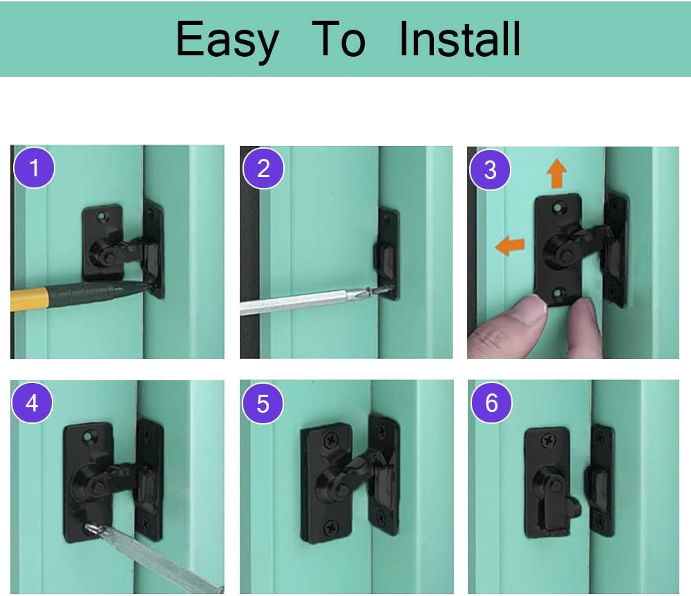 High-Quality Materials: Our 90 degree door buckle made of 304 stainless steel, one-piece molding, premium coating on the surface. High strength, no rust, no discoloration, guaranteed service life and reliability. Excellent Design:Toggle design, simple and practical. The counterbore design allows the screw head to be flush with the latch surface, which means that when you flip the lever, the screw head will not interfere.The thickened base is not easy to be broken and deformed, and it is strong and durable. Application on Both Sides: Our pocket door locks suitable for left and right applications. Contains screws, easy to install. Multi-Purpose: Theses sliding door locks very suitable for wooden doors close to the wall. Very suitable for doors and windows that open from the inside. Such as bathrooms, toilets, fitting rooms, dressing rooms, bedrooms, barn doors, sliding doors, sliding windows, etc., can also be used for baby doors or pet doors. Tiny Size: Our designers deliberately designed this clasp lock as a mini size, which is convenient for installation in a tight space. Please check the size before buying. Product Description ●This is a keyless lock, ideal for doors and windows that open from the inside. Suitable for left and right applications. ●MINI SIZE: you can use it for bathroom, toilet, fitting room, dressing room, bedroom, sliding door, sliding window, etc. It can also be used for baby door or pet door. ●As a reminder: this door latch can only resist low violence and is not suitable for doors with high security requirements such as gates. Matte black, fits any style you have. One-piece molding, multi-layer polishing treatment on the surface,highlighting the texture. Upgrade size, More choices