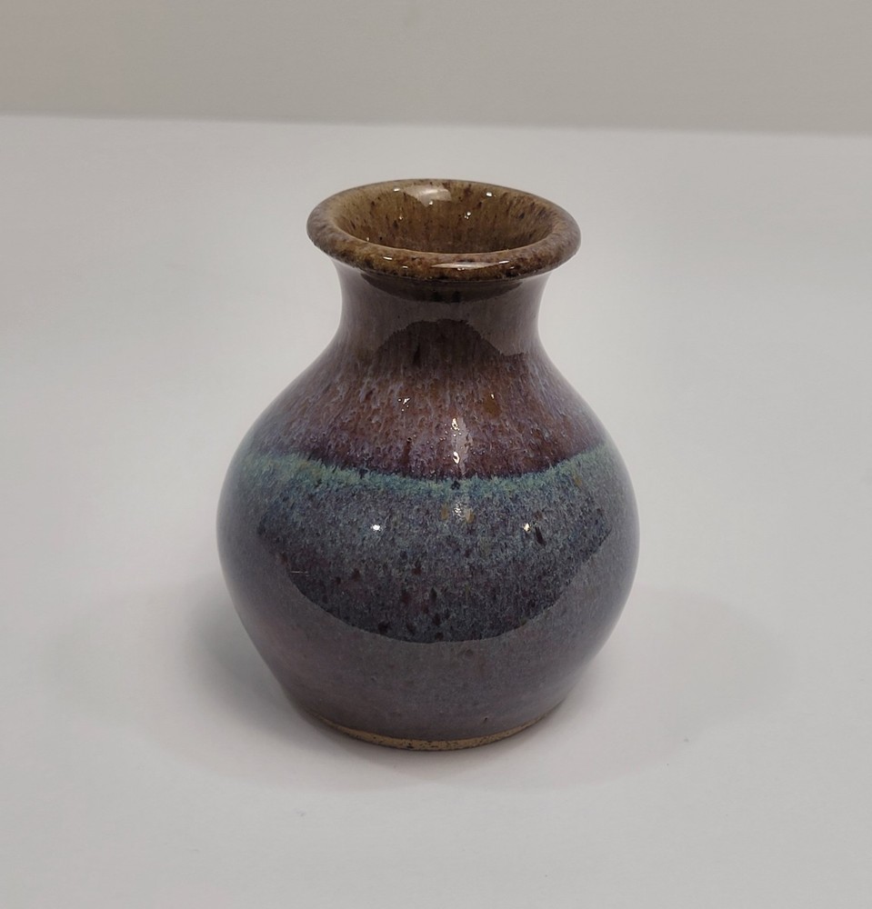 Art Pottery Drip Glaze Mini Bud Vase in shade of Purple, Blue and Brown. 3.5" Tall, Signed. Excellent condition.