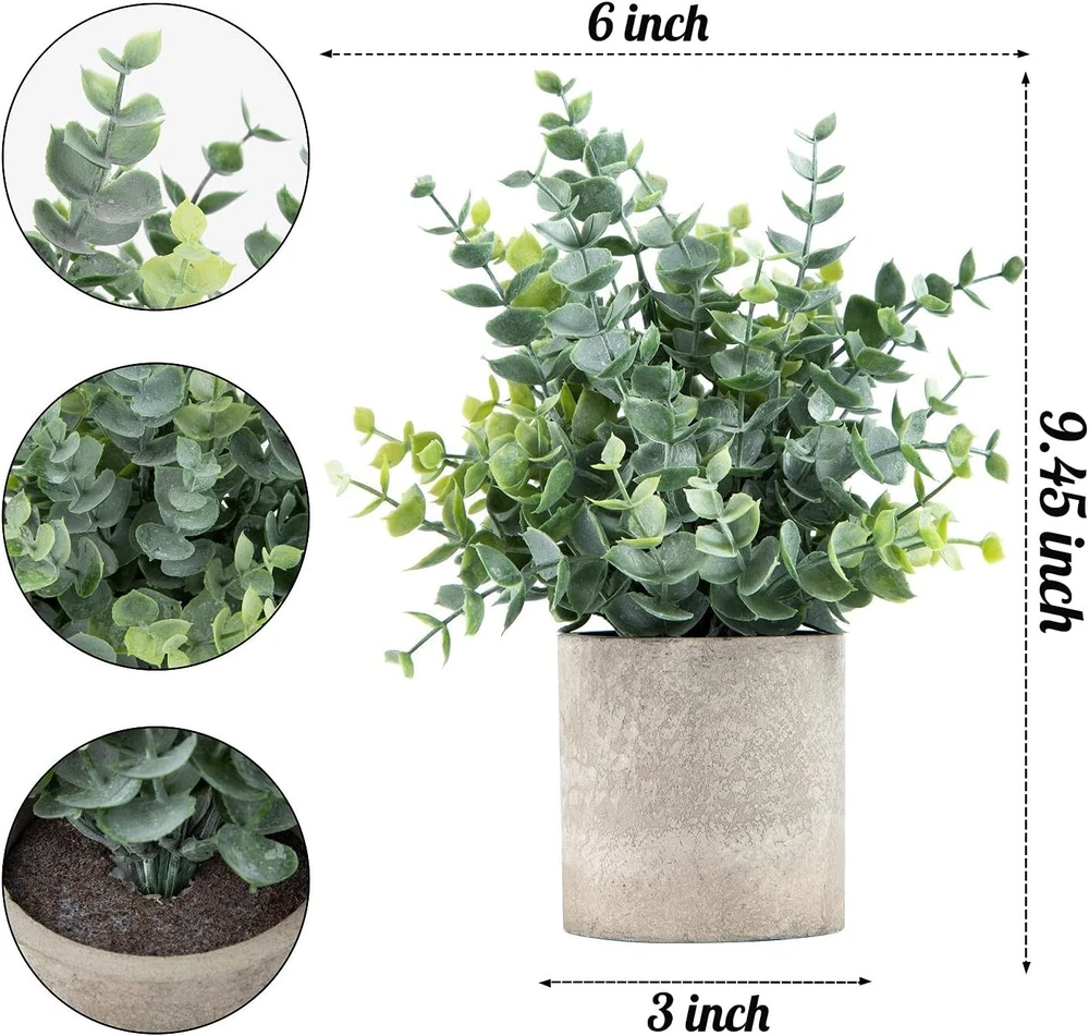 Small Fake Eucalyptus Plants - Set of 2 Potted Artificial Plants for Home Decor ‹ › ‹ › ‹ › ‹ › ‹ › ‹ › ‹ › ‹ › ‹ › Small Fake Eucalyptus Plants - Set of 2 Potted Artificial Plants for Home Decor -Safe and durable material, made of environmentally friendly plastic -Vivid colors and realistic leaves for a natural look -Comes with gray paper pulp pots for a classic appearance -No daily care needed, easy to maintain and always remain green and fresh -Can be placed on tabletop, window, office desk, shelf, farmhouse, bathroom, and dining table -Dimensions: 9.45" tall and 6" wide, pots measure 3" tall and 3" diameter -Package includes 2 packs for versatile decorating options -Perfect after-sales service for any questions or issues Benefits: Realistic and lifelike appearance No maintenance required, perfect for busy individuals Suitable for various home decor styles and locations Easy to adjust and display in any space Comes in a set of 2 for added value Safe and durable materials for long-lasting use Why choose our Small Fake Eucalyptus Plants? Looking to add a touch of greenery to your home without the hassle of maintenance? Our Small Fake Eucalyptus Plants are the perfect solution. Made of high-quality plastic with realistic leaves, these artificial plants require no daily care and always look fresh and vibrant. With their classic appearance and versatile placement options, they are a great addition to any home decor. Don't miss out on the opportunity to enjoy the beauty of nature in your home with our hassle-free artificial plants. Order your set of Small Fake Eucalyptus Plants today! Shipping Free & Fast Shipping - We offer free shipping to most of the USA with a normal delivery time of 3-7 days. However, due to the current situation, additional delivery time (up to 3 weeks) may be required for some items. Alternative Carriers - We may use alternative carriers (e.g. USPS, FedEx, UPS, etc.) to ensure your package arrives safely and on time. Due to the use of multiple carriers, we are unable to provide a tracking number automatically. Handling Time - Orders are processed and shipped within 1-2 business days of receiving cleared payment. Shipping Restrictions - Shipping to Alaska, Hawaii, Puerto Rico, Guam, and other US territories may incur shipping charges or delivery restrictions. Please contact us before ordering, or your order can be refunded/cancelled. State Restrictions - There may be restrictions based on your state of purchase. For example, certain items may not be shipped to California due to state regulations. Contact for Tracking Updates - If you require tracking updates or have any concerns about the delivery of your order, please feel free to contact us, and we will be happy to assist you. Return 30-Day Hassle-Free Returns - We want you to be completely satisfied with your purchase. If you are not, you can return the item within 30 days of receiving it for a full refund or exchange. Easy Return Process - To start a return, simply contact us and we will provide you with a prepaid return shipping label and detailed instructions. Restocking Fee - There are no restocking fees for returns. However, the buyer is responsible for return shipping costs if the return is not due to a seller's error. Refund Processing Time - Refunds will be processed within 5 business days of receiving the returned item in its original condition. Payment We accept all major credit cards, PayPal, and Apple Pay for your convenience. Your payment information is secure and encrypted to ensure a safe and seamless transaction. Please complete your payment within 3 days of purchase to avoid any delays in shipping. Feedback Your feedback is extremely important to us. We strive to provide the best products and customer service possible. If you are satisfied with your purchase, please take a moment to leave us a positive review. If you have any concerns or issues with your order, please contact us before leaving negative feedback. We are committed to resolving any problems and ensuring your satisfaction. Contact Us If you have any questions or concerns, please feel free to reach out to our customer support team. You can contact us through the eBay messaging system. We are available Monday to Friday, 9:00 am to 5:00 pm EST, and we will do our best to respond to your inquiry within 24 hours. Thank you for supporting our small family business!