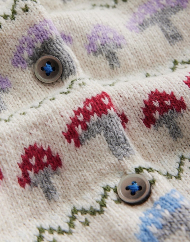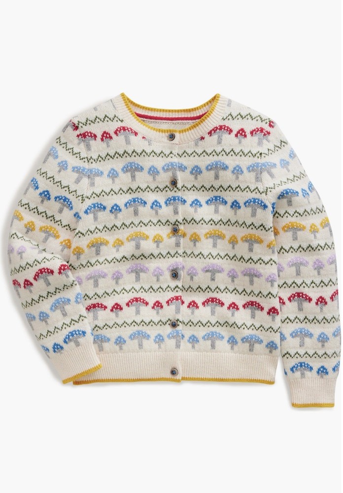Adorable Mini Boden Edie Toadstool Fair Isle Cardigan featuring a whimsical toadstool pattern on a classic Fair Isle knit. Perfect for layering during cooler weather—both cozy and stylish. Details: * Size: 7–8 Years * Front button closure * Soft knit with a hint of wool * 57% cotton, 31% polyamide, 12% wool * Imported * Item #10463632 Condition: Excellent pre-owned condition. Always dry cleaned only, never washed.