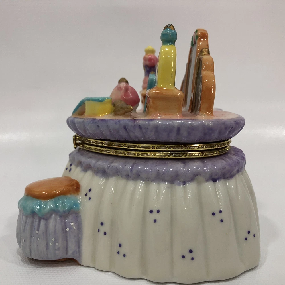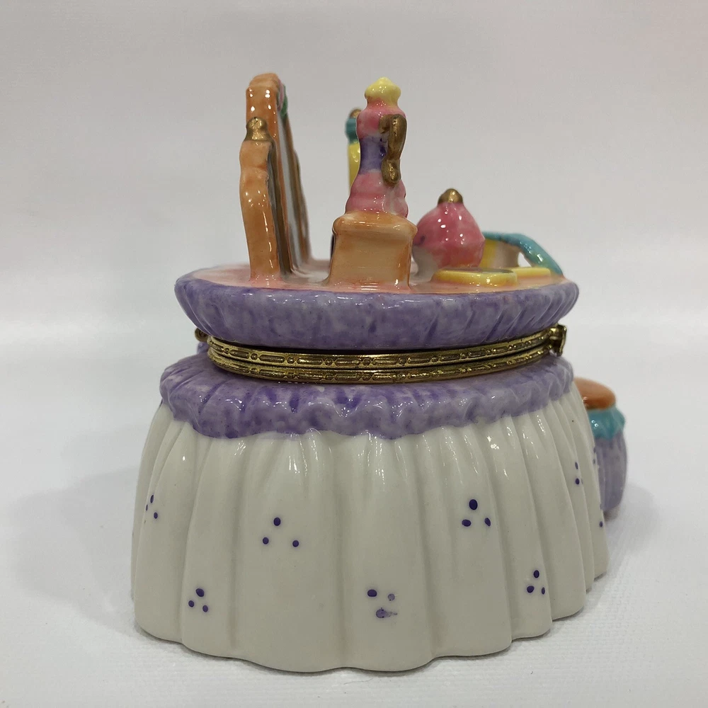 Cute Mini Ceramic High End trinket Dressed Dresser Heart Shape Gold Trim Jewelry Box. Condition is Pre-owned in great shape! The item is marked w/ black marker on the bottom. Please see pics for details. Shipped asap by USPS first class mail.