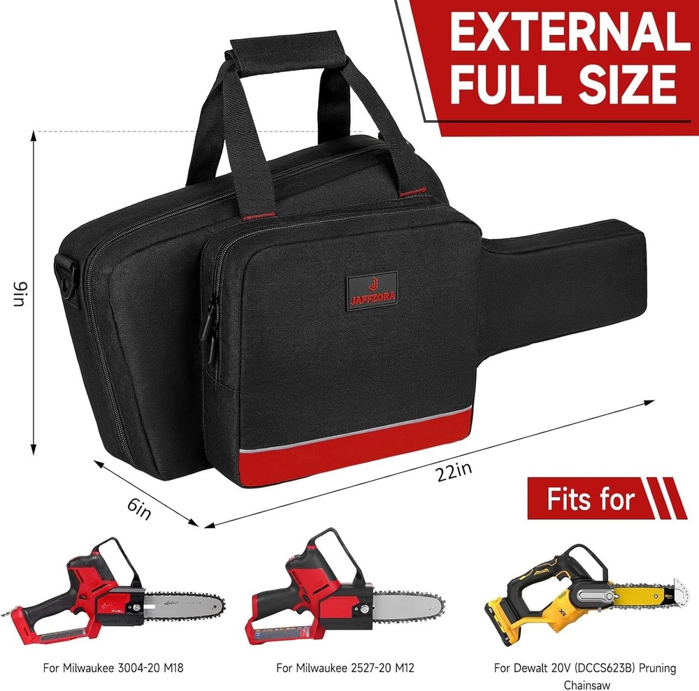 Mini Chainsaw Case Compatible with Milwaukee Electric Tool M18/ M12/CRDLSS 12V Fuel Hatchet 6In 8In Pruning, Waterproof Chainsaw Storage Bag Fits for RYOBI & Chrome (3004-20) & Accessories (Bag Only) About this item Compatible Models: The mini chainsaw bag is compatible with Milwaukee Electric Tool M18 (3004-20) / M12 (2527-20)/ CRDLSS 12V Fuel Hatchet 6 & 8 Inch Pruning Saw, batteries and charger. And fit for Dewalt & RYOBI ONE+ HP Brushless mini chainsaw. Utility Chainsaw Case: The main compartment is enough to hold 6in or 8in chainsaw and battery. The front pocket can hold M18 lithium-Ion batteries and charger, and back pocket for storing tongs, wrench, screwdrivers, etc. Well Protection: The mini chainsaw bag is made of waterproof fabric with soft lining, sturdy and scratch-resistant; The 8-inch chainsaw case is equipped with reflective tape and smooth double zippers, which is easy to find and use. Easy to carry: The chainsaw storage bag has a sturdy padded handle and detachable shoulder strap for convenient portability. Perfect choice for carpenters and woodsmen. Excellent After-sales Service: If any quality problem about this chainsaw bag, just need to tell us, we will get back to you with a solution quickly.