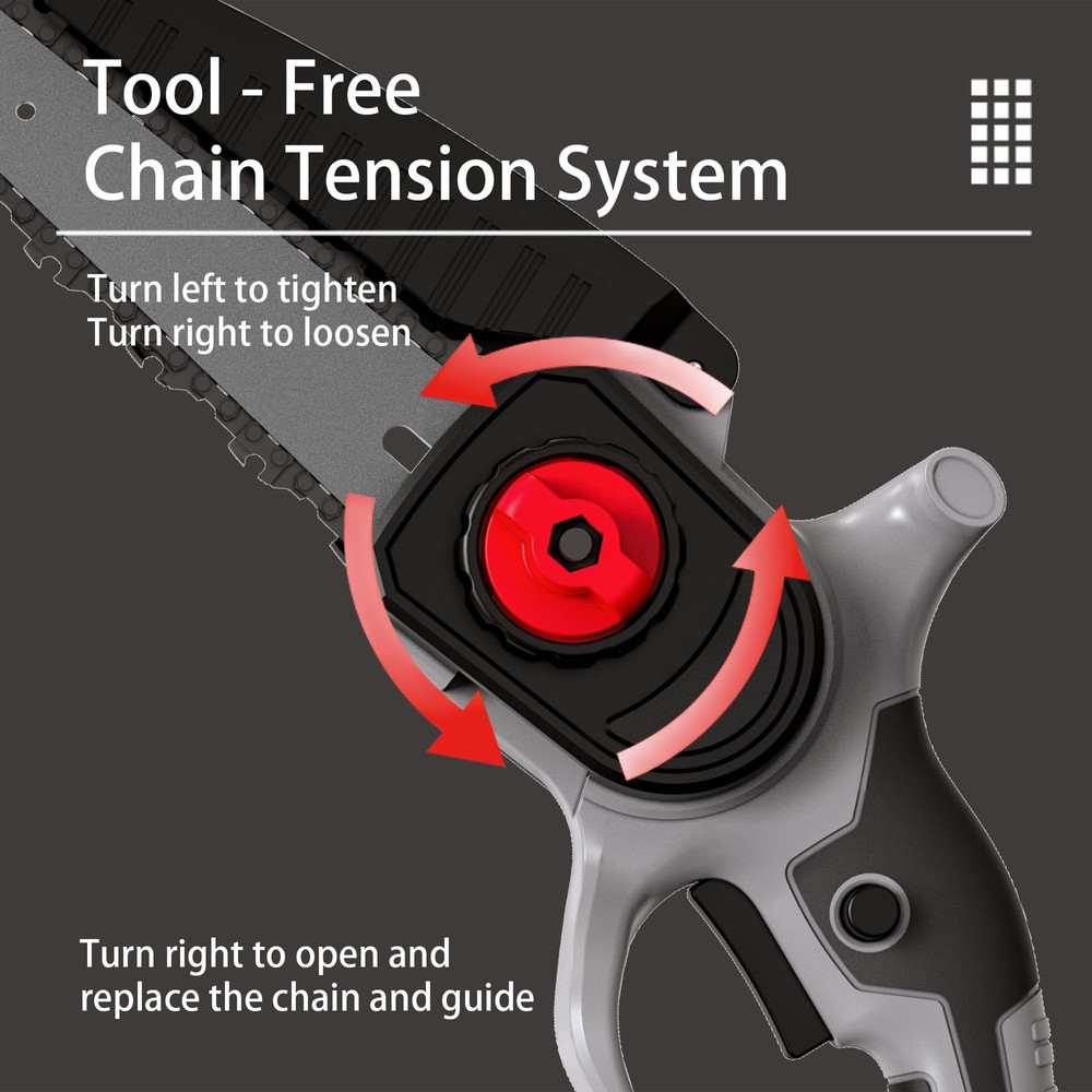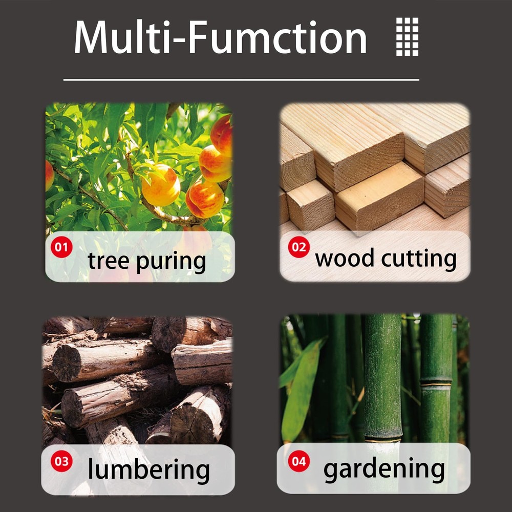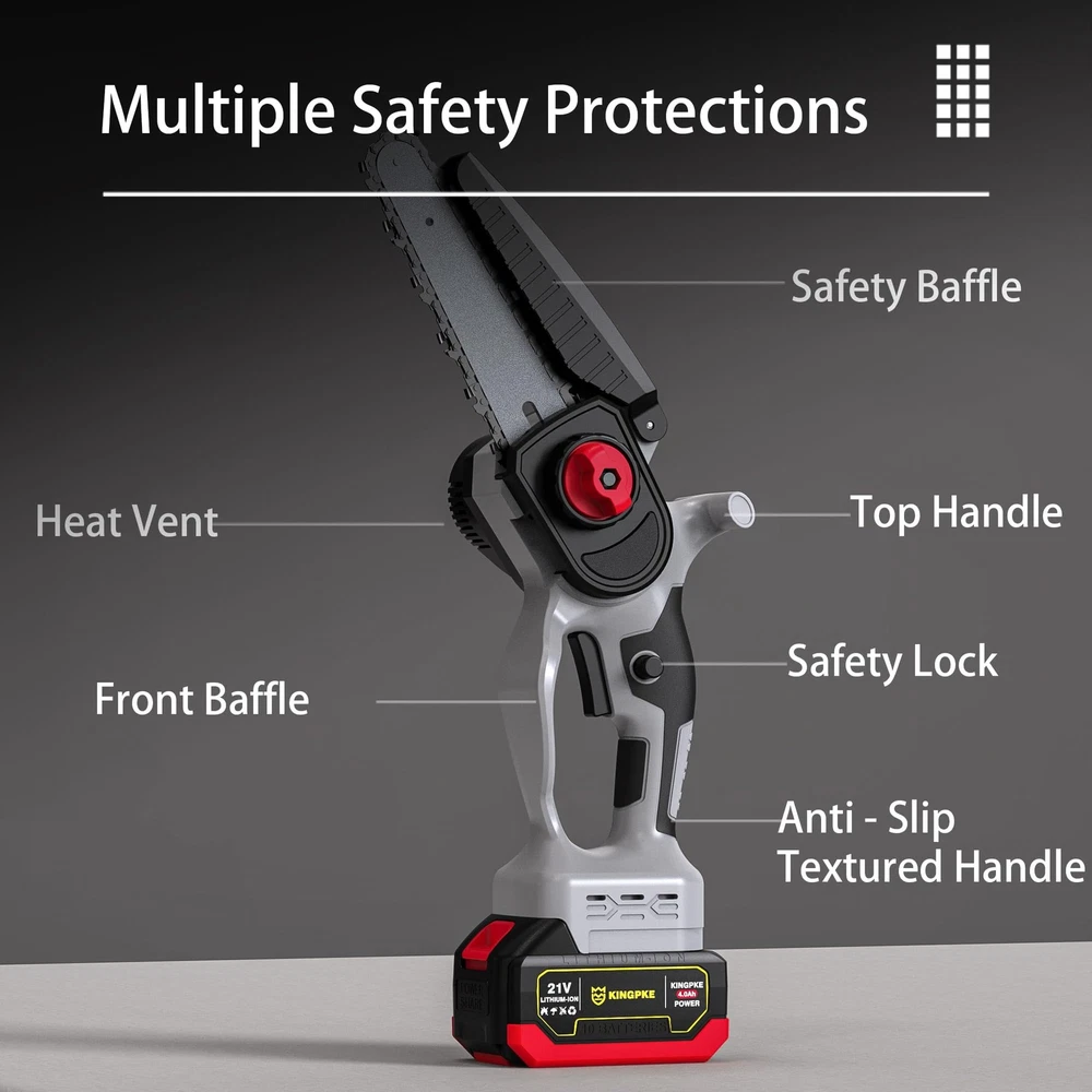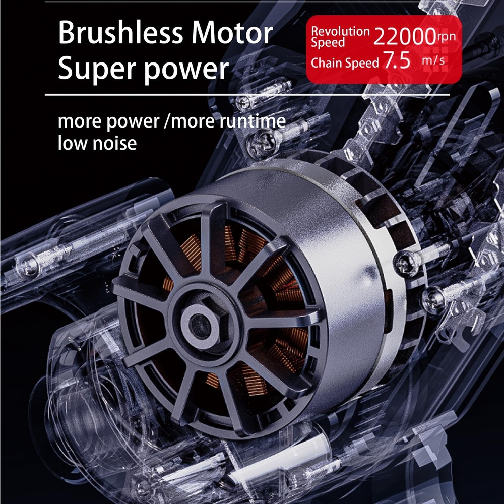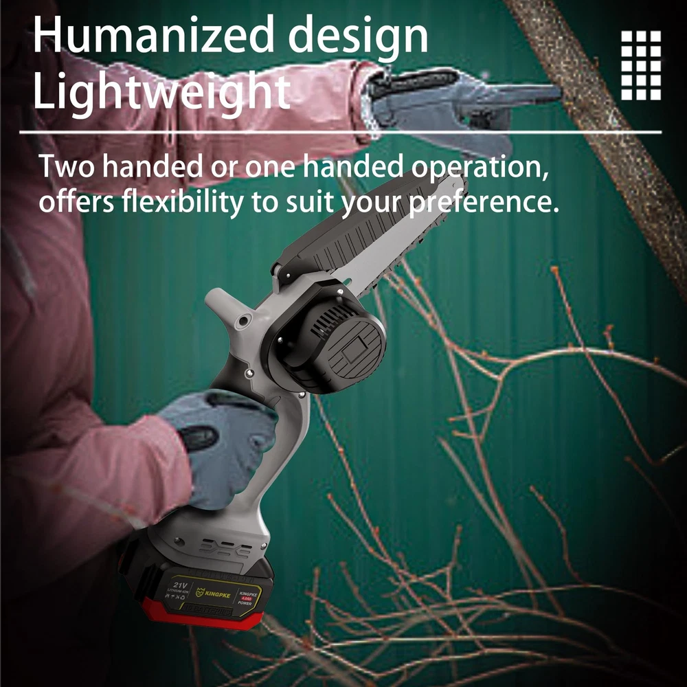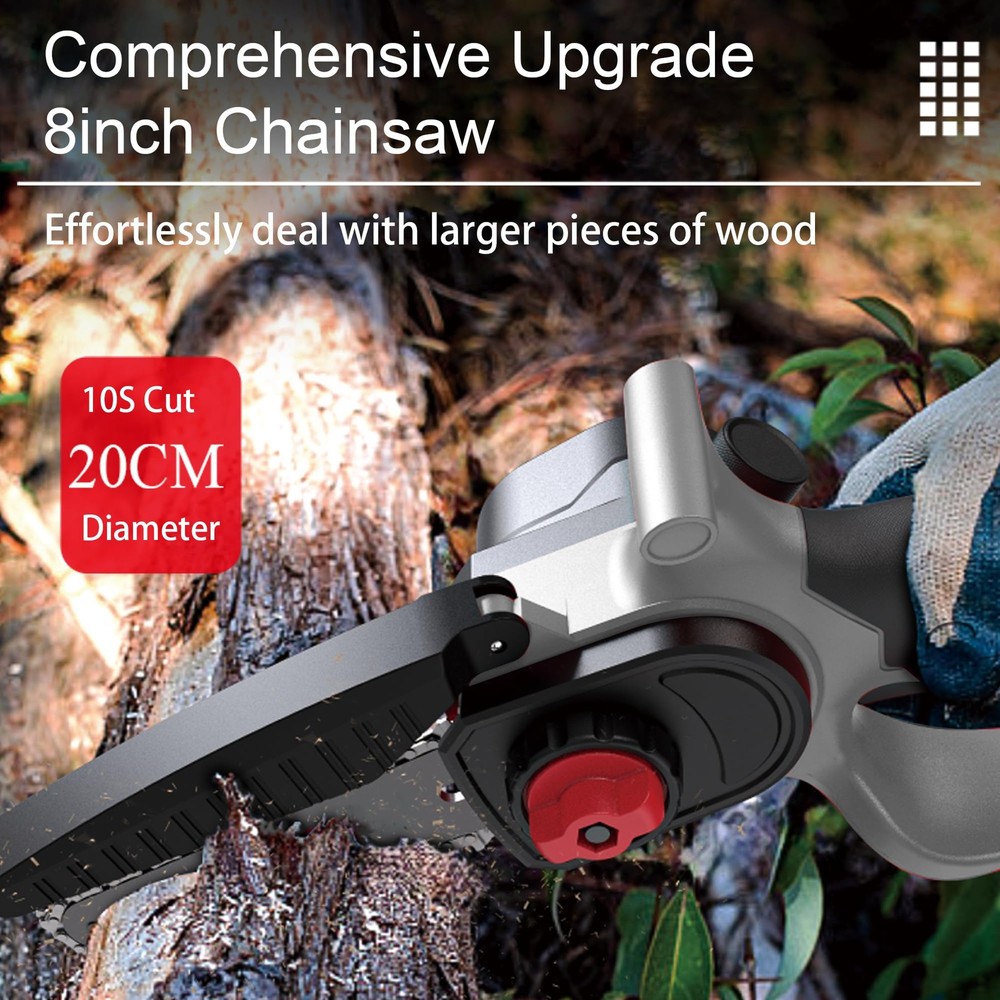 was founded in the 2007s. It evolved from a patio, lawn & garden care club. A group of professionals who love garden care got together to develop more convenient, durable and cost - effective garden tools. Welcome to the family! Please share your ideas about outdoor power tools! Let's create wonderful patios, lawns and gardens together! Why Choose ? Brushless Motor Adoption: Our chainsw are equipped with high - performance brushless motors, which offer stronger power, longer service life, low noise, and effectively assist your outdoor work. 2X4.0 Ah Batteries: Our power chain saws fitted with two 4.0 Ah batteries that can be used alternately during work, allowing you to operate outdoors without worrying about battery life. Size Upgrade: Our hand held chain saw battery powered upgraded to 8 - inch and 6 - inch sizes. While upgrading the size, the performance of the motor is also enhanced, providing stronger power and giving you more cutting options. Top - Mounted Handle: The larger the motosierra de bateria, the more attention should be paid to safety. The top - mounted handle can better improve the stability and safety during cutting, enabling women and the elderly to operate it easily. Safety Designs: Safety lock, chain guard, rubber - coated handle, and top - mounted handle. All these safety designs can help you operate more safely. Precautions: 1. Be sure to read the instruction manual carefully and strictly follow the safety instructions to ensure safe operation. 2. When you receive the electric saw, fully charge the battery first. Do not charge the battery for more than 8 hours, and do not wait until the battery is completely drained before recharging. Parameters: Included: 1 x small battery operated chainsaw 1x 8 inch guide bar 1x 8 inch chain 1 x toolbox 1 x User manual Color: Grey Wattage: 1000W Battery: 2 pcs 4.0AH 【Brushless Motor】 Our mini chainsaw 8 inch cordless hand-held electric chain saw delivers exceptional performance with super power, more runtime and avoid motor smoke and battery fault issue durability-extending the life of your mini chainsaw. The low noise is good for those who mind noise to neighbors. Efficient cutting and low noise help you focus on tasks in various situations. 【Super Power 8inch Chainsaw】 The cordless chainsaw is equipped with a 8 inch chain and guide bar, enabling larger scale cutting. It adopts a 1000 watt brushless motor and a deep quenched chain guiding design, which can effortlessly deal with larger pieces of wood. Experience greater power and versatility, making it the first choice for any demanding tasks. 【Tool Free Chain Tension System】 Our mini chain saw is no need for any tools or professional knowledge to replace the chain. Just remove the red knob and the replacement can be done. Also, there is no need for tools to adjust the chain tension. Just turn the red knob to adjust it. It is a very user - friendly and female - friendly design. Even women and the elderly can easily control and use it. 【2 PCS 4.0 AH Battery】 The electric chainsaw cordless is an excellent outdoor tool. It is suitable for wood cutting, garden pruning, twig trimming and shrub pruning with two large 21V 4.0 mah batteries, it helps you work outdoors without worrying about running out of power. The rechargeable batteries with self overload and temperature protection offer a longer battery life. 【Humanized design】We attach great importance to safety and ease of use. The 8 inch battery powered chainsaw is equipped with a screw on handle. This design not only enhances safety but also is easy to operate. Whether you prefer two handed or one handed operation, the electric chain saw offers flexibility to suit your preference. 【Multiple Safety Protections】 1. The safety lock prevents accidental activation (the handheld chainsaw needs to press the safety lock and the start button simultaneously to start). 2. Safety baffle to prevent the wood from splashing. 3. Anti - slip textured handle, allowing you to hold the mini chainsaw tightly. 4. Top handle helps you cut more stably. 【You Will Get】1 x small battery operated chainsaw, 1x 8 inch guide bar and chain, 1 x toolbox, 1 x User manual.The mini chain saw cordless is a perfect gift for fathers, mothers, wives, husbands, friends, gardeners, DIY enthusiasts and carpenters. Ideal for use in gardens, farms, parks, forests, pastures and greenhouses. 【Sales Service】If you have any questions about our cordless chainsaw with battery and charger, please feel free to contact us. Our after - sales service experts will do their best to solve your problems for you. You can buy and experience with confidence.