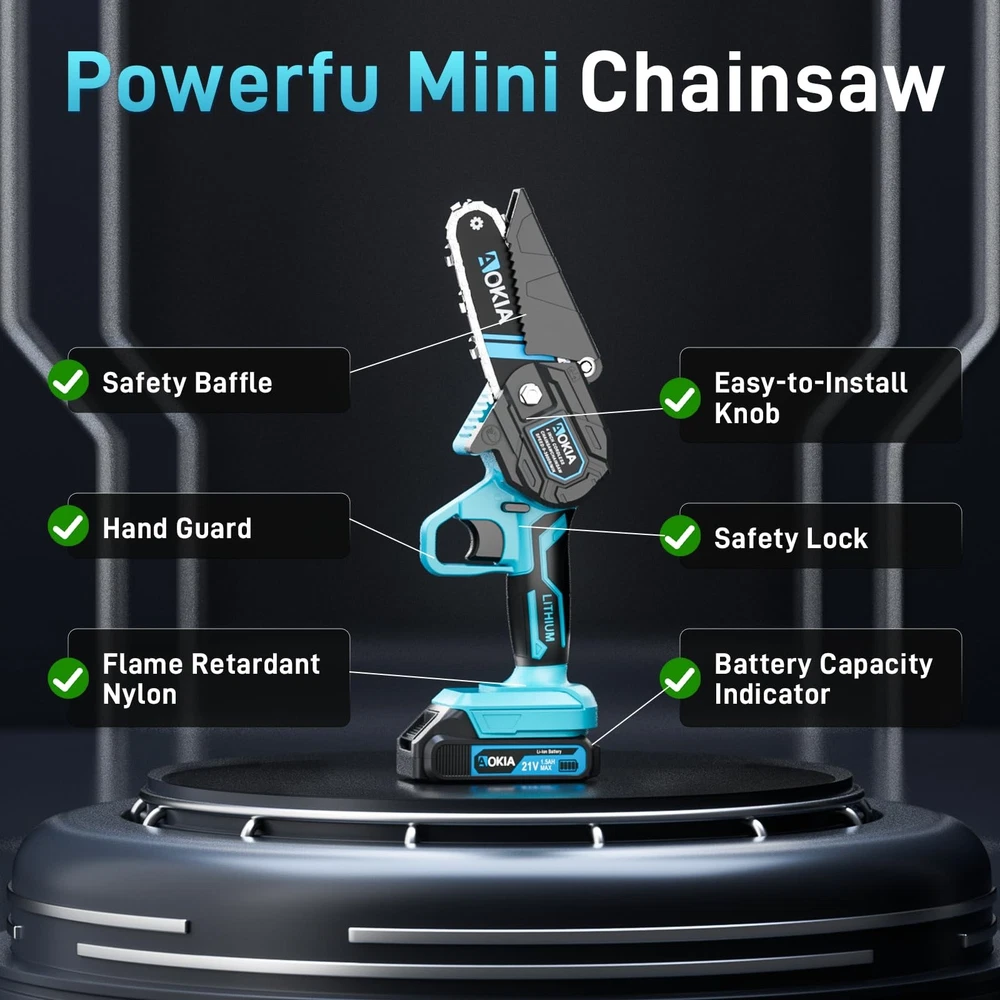 【HIGH-EFFICIENT CUTTING】Cordless portable mini chainsaw is powered by a pure copper motor, equipped high-quality guide chain that has undergone a deep quenching process to ensure cutting efficiency is higher and faster. 【LIGHTWEIGHT AND PORTABLE】4-Inch cordless chain saw weighs only 2.4lbs (including ONE battery), making it carry anywhere. One hand operation, women and the elderly can easily use this samll saw for cutting work. 【SAFETY DESIGN AND MORE RELIABLE】In order to protect you and your family. Our battery powered chainsaw adopt the strict safety measures: ①Security Lock prevent accidental activation. ②Blade guard prevent injury when pressing with the other hand. 【UPGRADE 21 VOLT BATTERY POWERED】This electric mini saw comes with 1500 mAh battery and fast charger, which can be used for a long time. So you don't have to worry about running out of power mid-task, you can cut more woods in yard. 【NOTE】After using the mini chainsaw for a few minutes, a few drops of oil need to be added to the chain. Please check if the chain is securely fastened before each use. If you have any issues when using the mini saw, please contact us. 【MINI SAW FOR YARD CARE】Handheld chainsaw can be widely used in daily life, whether it's cutting tree branches and wood or pruning garden and yard, can be done with this samll saw. It's also ideal tool for farms, parks, forests, pastures.