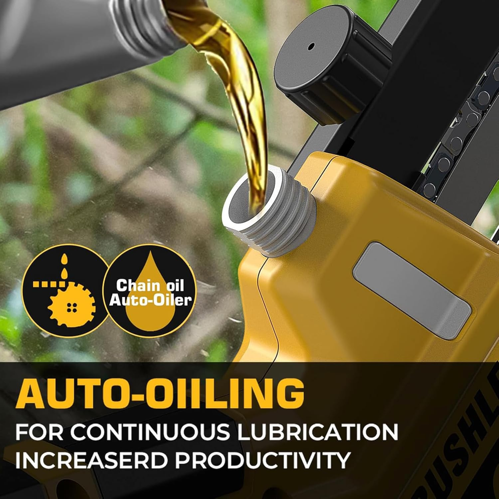 HIGH-EFFICIENCY BRUSHLESS MOTOR: The pruning chainsaw is equipped with a powerful 800W brushless motor. High-efficiency Brushless Motor delivers the power for more efficient cutting and maximizes run time and motor life. Chainsaw Compatible with DCB 20V MAX BATTERY: The Pruning Chainsaw Compatibility with DCB 20V MAX Battery, such as DCB200, DCB201, DCB203, DCB204, DCB205, DCB206, DCB230, DCB240, DCB246, DCB248, DCBP520, etc, Plug in your own battery and get your job done fast and easy! Low-voltage protection is our first concern. The machine will automatically shut down if the battery voltage is below 14.4v to prevent any overload damage. AUTO-OILING FOR CONTINUOUS LUBRICATION: Automatic oiler delivers proper chain lubrication and increased productivity. Lubricates the saw chain automatically while the pruning chainsaw is running, minimizing friction and wear and optimizing bearing and mechanical life. TOOL-FREE CHAIN TENSIONER: Easy access chain tensioner for quick adjustments to chain tension. The mini chainsaw with tool-free chain tensioning and bar lock knob making it easy to install and replace chain. No tools need at all. 8-INCH AND 6-INCH 2-IN-1 DESIGN: The 6"and 8" 2-in-1 suit design meets your extensive choice, gives you more flexibility in terms of cutting different sizes of woods. COMPACT DESIGN FOR BETTER HANDLING: Weighing just 2.8 lbs (tool only), the Pruning Chainsaw is 61% lighter and 3x more compact, designed to reduce fatigue while cutting, trimming and pruning. Use it to trim branches from downed trees, cut bundles of wood or branches, and manage thick brush or daily pruning needs. Compact design allows for easy access to tight spaces. EXCELLENT CUTTING PERFORMANCE: The mini chainsaw cordless is equipped with a powerful motor and sharp blades for efficient cutting. With a high chain speed of 8m/s, it only takes 6 seconds to cut 4 inches of wood. Up to 70 cuts per charge on 4x4 pressure treated wood (using a 20V MAX 4Ah battery). WHAT YOU GET: Package includes a Pruning chainsaw (battery not included), a 6" guide bar and chain (already installed on the machine), 1*8" guide bar, 1*8" saw chain, 1*scabbard, 1*user manual, and 24 months Limited Warranty. If you have any questions or comments about the item, please contact us. Product Description