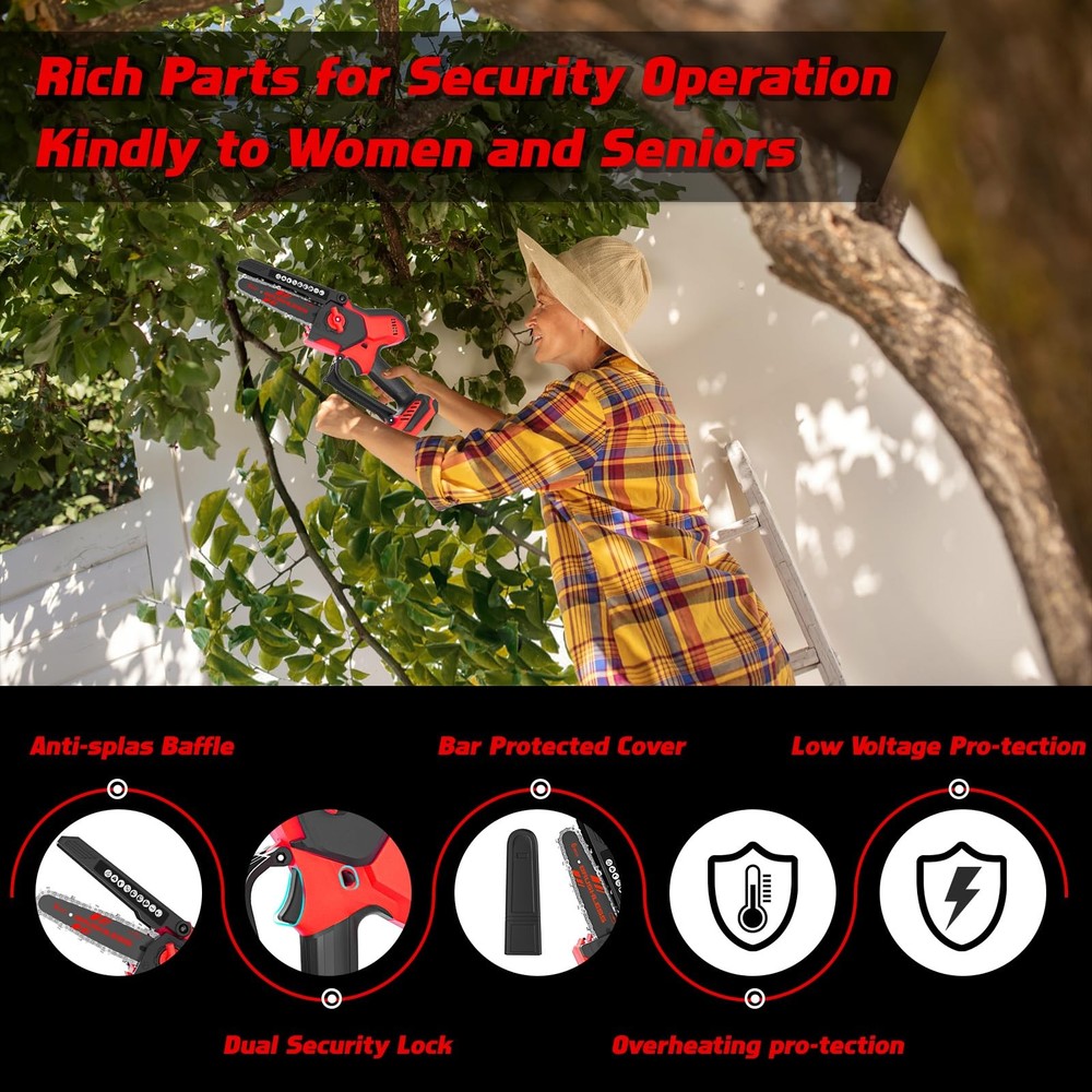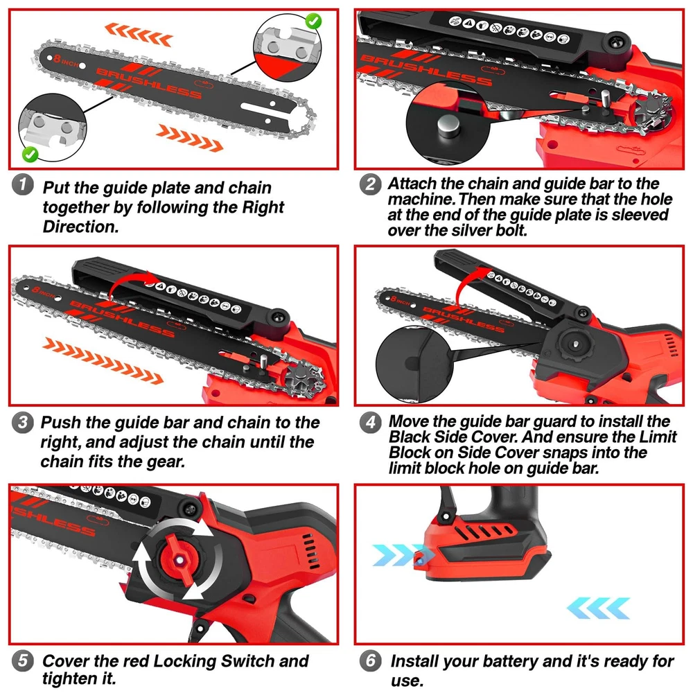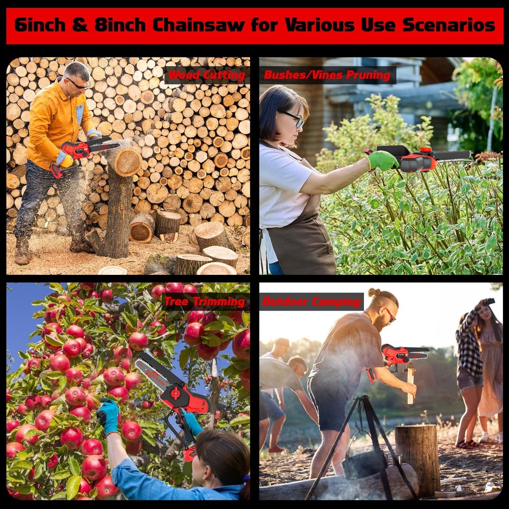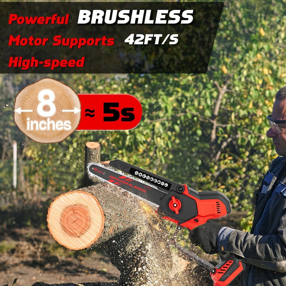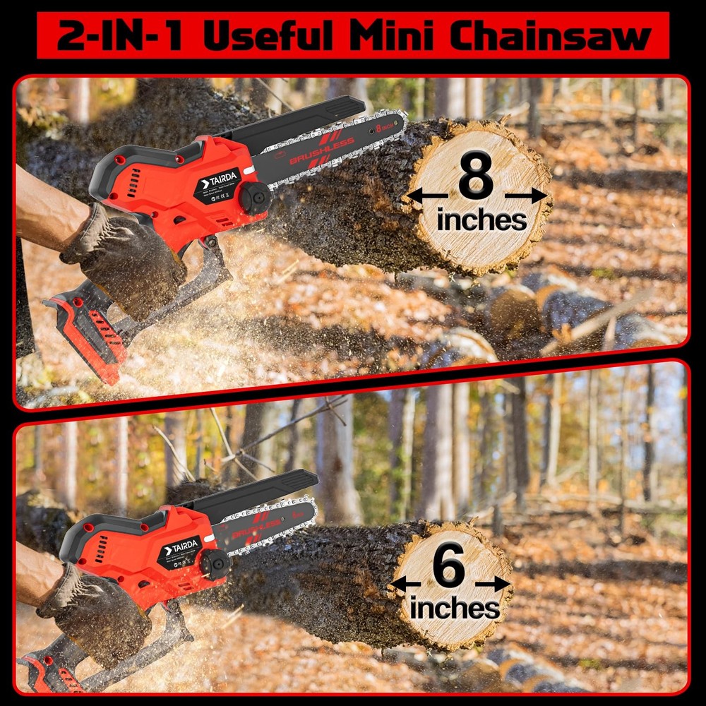 2-IN-1 Mini Chainsaw, 8-Inch And 6-Inch Brushless Cordless Chainsaw with Auto Oiler & Security Lock, 800W Electric Chain Saw for Tree Pruning, Branch Wood Cutting(Battery NOY Included) Battery Powered Mini Chainsaw: (BARE TOOL, NO Battery Or Charger) cordless chainsaw is compatible for milwaukee 18v batteries. Important Note: Low-voltage Cut-off Pro/tection, when your battery voltage drops to 15V voltage, the chainsaw will stop operating to guard your battery Useful 2-IN-1 Min Chainsaw: cordless chainsaw provides you 8-inch and 6-inch sizes bar, 2-in-1 unique design meets various cutting projects, like cutting diameter from 1 inch to 8 inches, cutting pieces, slices or chunks without problem. Wide used in your Yard, Gardens, Ranch, Fireplace, Camping for Tree Trimming, Branches Pruning, Wood Cutting, etc Powerful And Excellent Cutting: Our mini chainsaw is well built with 800 watts super power BRUSHLESS motor, supports high cutting speeds up to 42FT/S, slices through branches up to 8 inches in seconds, no effort. Cuts down your pruning time a lot and save your energy and money Lightweight And Comfortable: The small chainsaw only weights 2.6 lbs, much lighter than other gas chainsaw or full size chainsaw, greatly makes for less stress on your shoulders and back. With the thoughtful design, it will give you a balanced and comfortable feel when using. Also suit for women and the elderly Easy to Maneuver: The compact pruning chainsaw allows you to one-handed grip and operate easily. When need installation or replace chain, it's tool-less, just assembling the chain and bar in proper position, then turning the knob to fixed the chainsaw