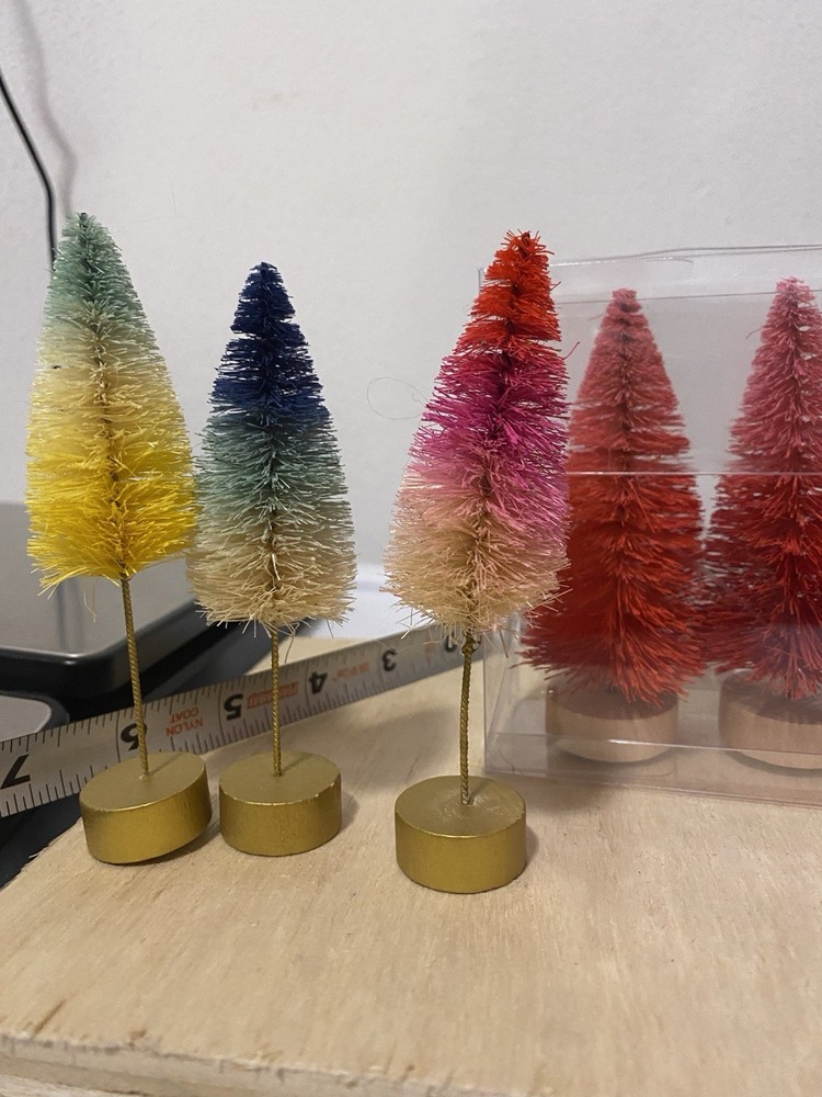 The product is a lot of mini artificial pine Christmas trees decorations in multicolor. They are designed for decorating doors and are perfect for the Christmas occasion. Made from pine material, these decorated trees are ideal for adding a festive touch to your home during the holiday season. Each tree can be easily displayed and enjoyed as part of your Christmas decorations.