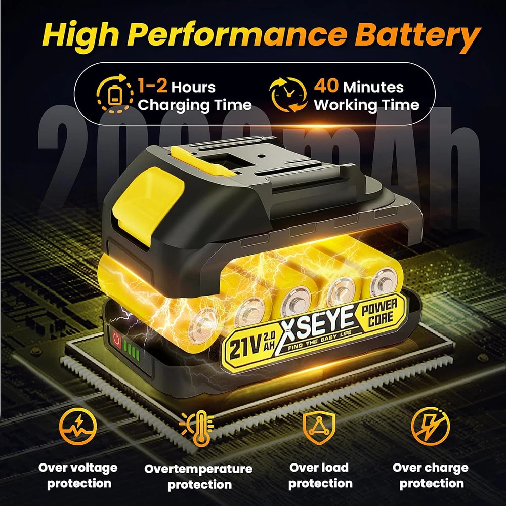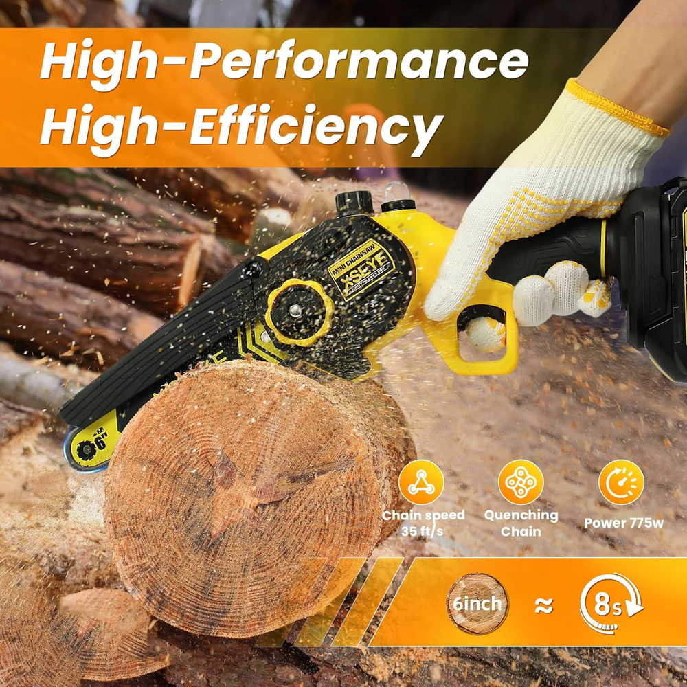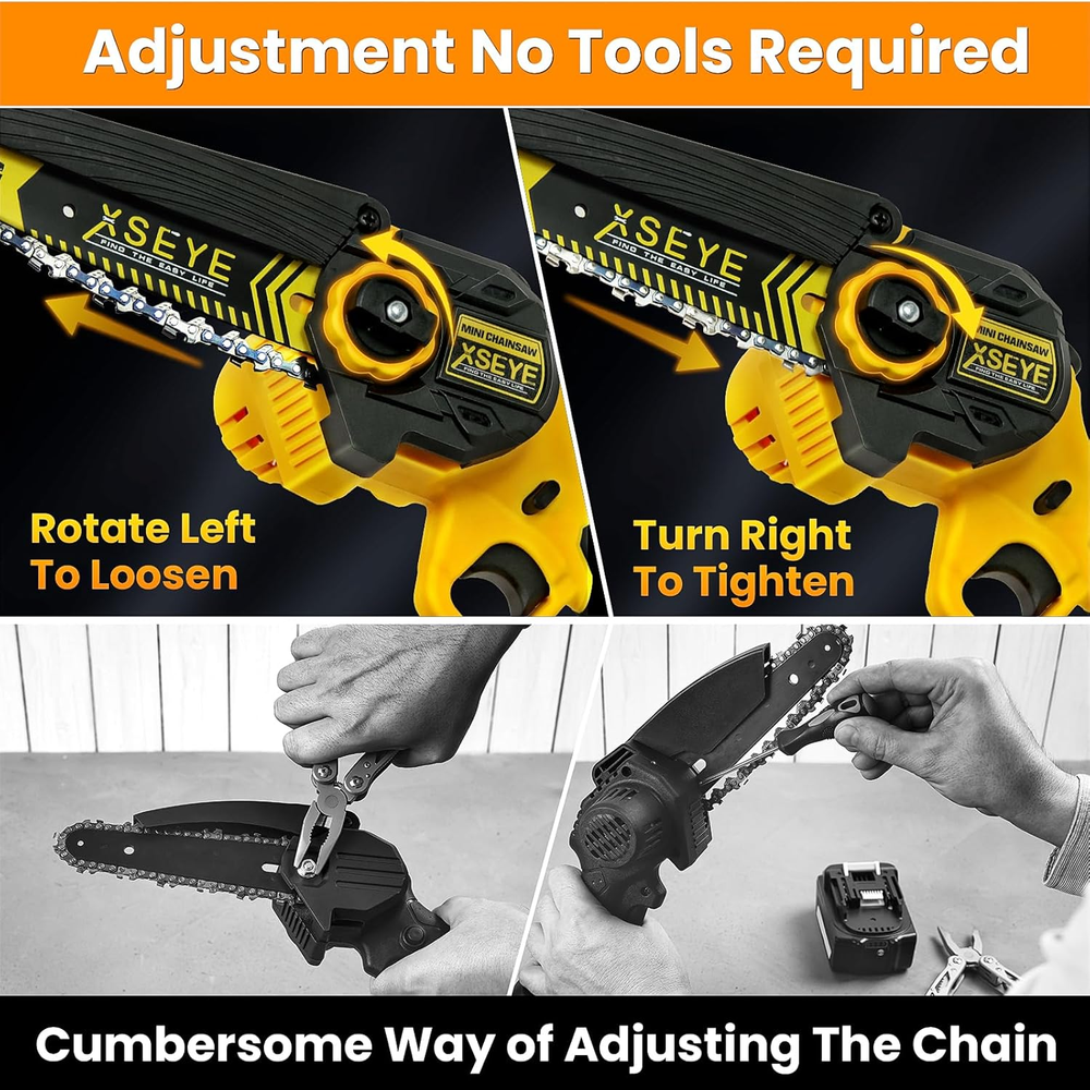 XSEYE mini chainsaw cordless comes with an automatic oiling system for hassle-free maintenance. Just pour oil into the tank, secure the cap, and press the bulb a few times to lubricate the chain. The auto-lubrication system minimizes chain wear, extends its lifespan, and ensures smoother, more efficient cutting performance. Mini chain saw battery powered is powered by a 21V 2000mAh rechargeable lithium-ion battery, delivering extended runtime and designed for easy removal, ensuring convenient recharging whenever needed. The battery is also equipped with a power indicator, allowing you to effortlessly track the remaining charge. Ideal for a wide range of cutting applications, this electric tree trimmer excels in wood cutting, garden pruning, pasture upkeep, backyard maintenance, and more. This Electric Chainsaw Cordless features a robust 775W pure copper motor, delivering an impressive idle speed of up to 21,000 RPM for powerful performance. Equipped with a high-quality metal chain, it effortlessly cuts through branches up to 6 inches (15 cm) in diameter, as well as wood and more. Ideal for tree trimming, camping, and gardening, it makes these tasks hassle-free and efficient. User safety is our top priority, which is why the mini chainsaw is equipped with a safety lock. The cordless chainsaw only activates when both the safety lock and trigger are pressed simultaneously. Additionally, a removable, adjustable splash guard on the guide plate helps prevent flying debris, while the included goggles offer excellent eye protection. Lightweight Mini Cordless Chainsaw weighs just 3.22 pounds and features an ergonomically designed handle for comfortable, fatigue-free one-handed use. It’s easy to maneuver and a joy to work with, making it ideal for beginners and gardeners alike. The cordless design ensures excellent portability, even in tight spaces. Perfect Gift Choice: Whether it's Christmas, Father's Day, Thanksgiving, birthday or anniversary, XSEYE Mini Chainsaw Cordless is the ideal choice for Dad, your husband, or any man in your life. Make this holiday season full of surprises and practical love by giving this thoughtful gift, ensuring he feels your care and support every time he uses it! 365-Day Warranty for XSEYE Product: We are committed to product quality and offer a 365-day support plan—no complicated return process required. Check the "Product Description" section for helpful usage and maintenance tips. If you have any questions, our team is always ready to assist you. Are you tired of struggling with branch trimming and gardening tasks? Why not opt for a lightweight yet powerful tool to simplify your work? Introducing XSEYE Mini Chainsaw—your solution for effortless gardening! Powered by a robust 775W pure copper motor, this mini chainsaw provides consistent performance for all your cutting needs. Its high-quality metal chain effortlessly slices through branches up to 6 inches (15 cm) in diameter. With a built-in 21V 2000mAh rechargeable lithium-ion battery, you can count on long-lasting power for various applications. Make XSEYE Mini Chainsaw your essential gardening tool, and enjoy a more efficient and hassle-free experience! Package Include: 1× Mini Cordless Chainsaw 1× Pre-installed Chain 1× 2000mAh battery with charger 1× Safety goggles 1× User manual 1× Pair of gloves