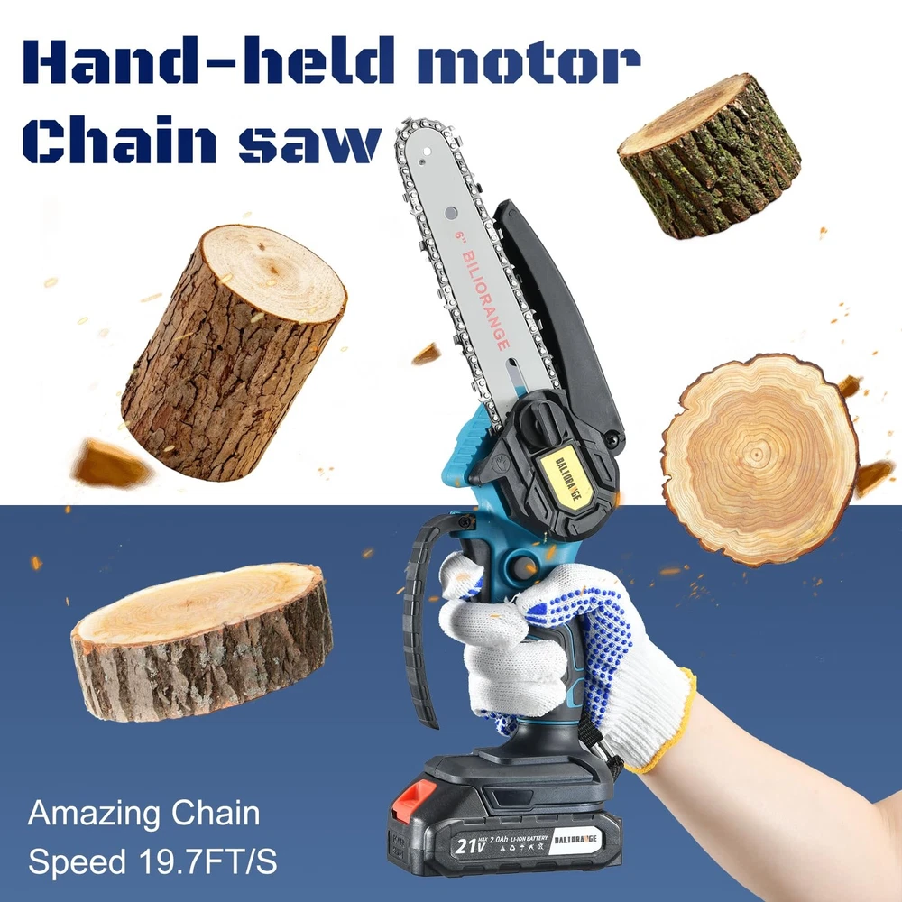 Introducing the Small Battery-Powered Chainsaw, a versatile and efficient tool designed for home users who value both power and convenience. This brushless lithium saw is engineered with a lightweight and compact one-handed operation design, making it easy to handle while still offering a robust cutting performance. The powerful brushless motor ensures precise cuts without compromising on power. Equipped with a high-capacity lithium battery, this chainsaw boasts long-lasting battery life, eliminating the need to worry about power during extended use or outdoor projects. The non-slip handle design enhances stability during operation, promoting safe and secure cutting. Its durability and low maintenance requirements make it an ideal tool for woodworking and gardening tasks around the home. Whether you're pruning branches in the garden or making intricate cuts for woodworking projects, this mini chainsaw is designed to meet your needs for a convenient and efficient work experience. Say goodbye to cumbersome tools and welcome the ease and precision of the Small Battery-Powered Chainsaw into your home toolkit. Mini Chain Saw: A lightweight 6-inch mini chain saw that conforms to ergonomics. The Bomves electric chain saw uses deeply quenched guide chains, pure copper motors, and 2x21V high-power batteries to ensure smooth cutting. It only takes 8-15 seconds to cut round logs with a diameter of 6 inches. Whether cutting down ordinary trees at home or large logs at work, it can be easily and efficiently accomplished Rechargeable Battery: The mini electric chainsaw is equipped with 2 detachable and rechargeable 21V-2000MAH batteries. It only takes about 1.5 hours to charge and can work for 25-30 minutes after charging. In addition, the battery is equipped with overheat/overload protection, which can provide longer battery life Multiple security protections: 1. Security lock button: prevents accidental activation. 2. Splashing baffle: prevents sawdust from splashing everywhere. 3. Goggles: Protect the eyes and prevent debris from entering the eyes. 4. Anti slip safety gloves: protect your hands and make you feel comfortable Widely used: Portable battery powered chain saw with small size and light weight. It can be used with one hand and is not easily fatigued due to long-term use. Very suitable for family and temporary work, even elderly, beginners, or women can easily control it. Hand saws can be used for wood cutting, general tree pruning, garden art, as well as forest harvesting and other activities. Suitable for gardens, farms, parks, forests, pastures, orchards, indoor and other places You will receive: Our package includes everything you need to get started: 1x chainsaw, 1x6-inch chain plate (guide plate), 1x replacement chain (one of which is already installed on the machine), 2x battery, 1x charger, 1x screwdriver, 1x file, 1x carrying case, 1x super easy to read and detailed manual, 1x oil bottle (empty). In addition, we also give away a pair of beautiful protective glasses and anti slip gloves.