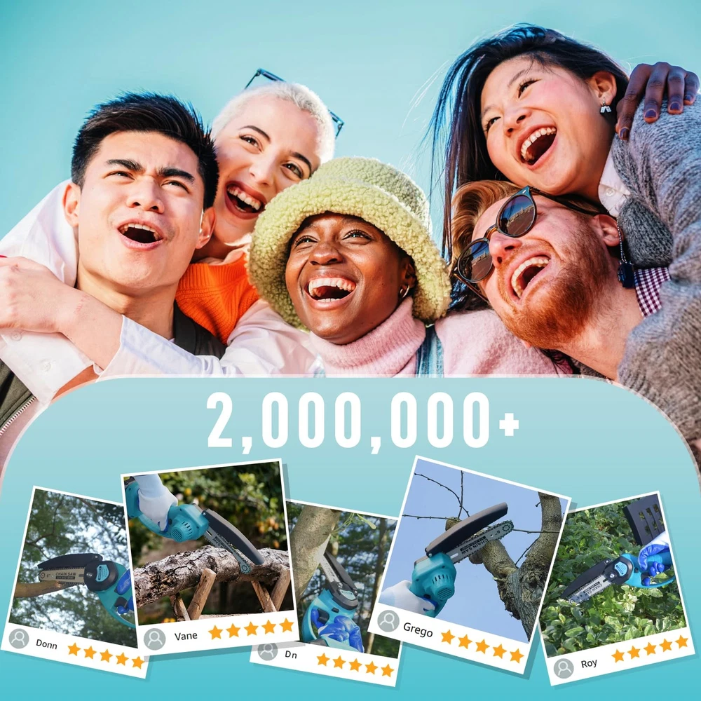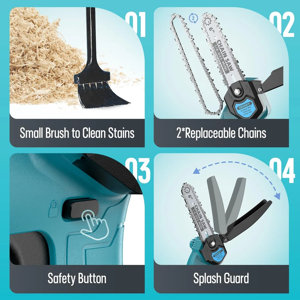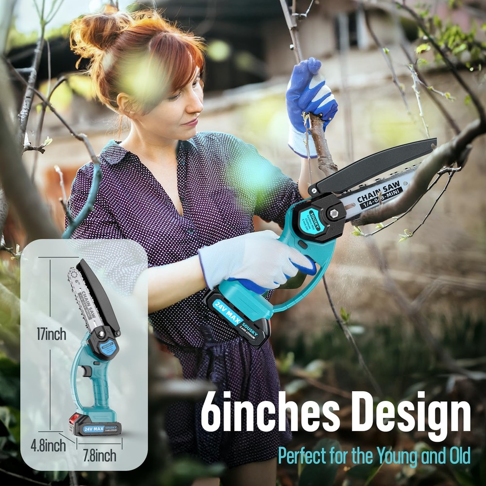 【Strong 6 inch Mini Chainsaw】: We collected feedback from thousands of buyers, and created this upgraded 6inch mini chainsaw based on user needs and suggestions from top designers. Longer working time, stronger power, and smoother chain operation all greatly improve the cutting efficiency and prolong the service life of the mini chainsaw 【2*Powerful 24V Batteries】:The mini electric chainsaw is equipped with 2*24V-2000MAH rechargeable batteries, no need to worry about insufficient power. A fully charged battery can work for 45-50 minutes to meet your cutting needs. The 3A high-quality battery has the self-overload and temperature protection function of lithium-ion battery. Additionally, the mini chainsaw also comes with overheating and explosion protection. We have safety certification of CE and UL 【Easy Operation and Collection】: The cordless mini chainsaw weighs only 5.8lb. Ultra-thin body, small size, comfortable to hold. It equipped with a toolbox to collect all accessories, you can carry it wherever and whenever you go. Warming tips: You must unlock the safety lock before starting to use the mini chainsaw, then use it while pressing the trigger 【Multi-protection & Quality Assurance】: Multiple protection measures fully guarantee your personal safety. 1.Equipped with a safety lock button to prevent accidental activation. 2.The safety baffle prevents sawdust from flying around. 3.Equipped with goggles to prevent debris from entering your eyes. 4.We offer 365 days of free replacement of products with defective quality, so you can buy our mini chainsaw with confidence 【Widely Used】: Despite its small size and light weight, the mini chainsaw cordless is just as powerful and efficient as larger chainsaws. All accessories can be stored perfectly. It can be used for trees pruning, garden art and shrub pruning in everyday household, as well as forest cutting, timber harvesting and other activities in large work. Gardens, farms, parks, forests, pastures, orchards, indoors and other places can be satisfied one by one 【Full Accessories & Great After-Sales Service】:Mini Chainsaw ×1, Rechargeable Li-on Battery ×2, Chain ×2 (1 has been installed on the chainsaw), Safety Guide Plate ×1, Safety Gloves ×2, Charger ×1, Screwdriver ×1, L-type Socket Wrench×1, Brush×1, Oil Bottle×1, Toolbox ×1, User Manual×1; will solve your problems online 24 hours a day. Feel free to answer your questions anytime