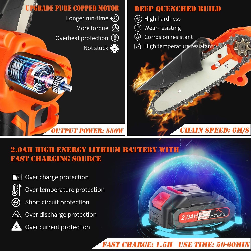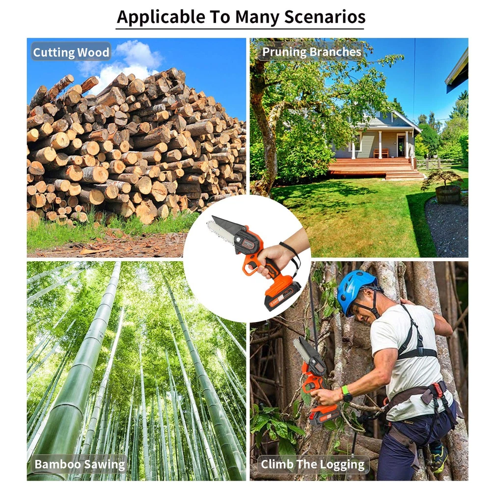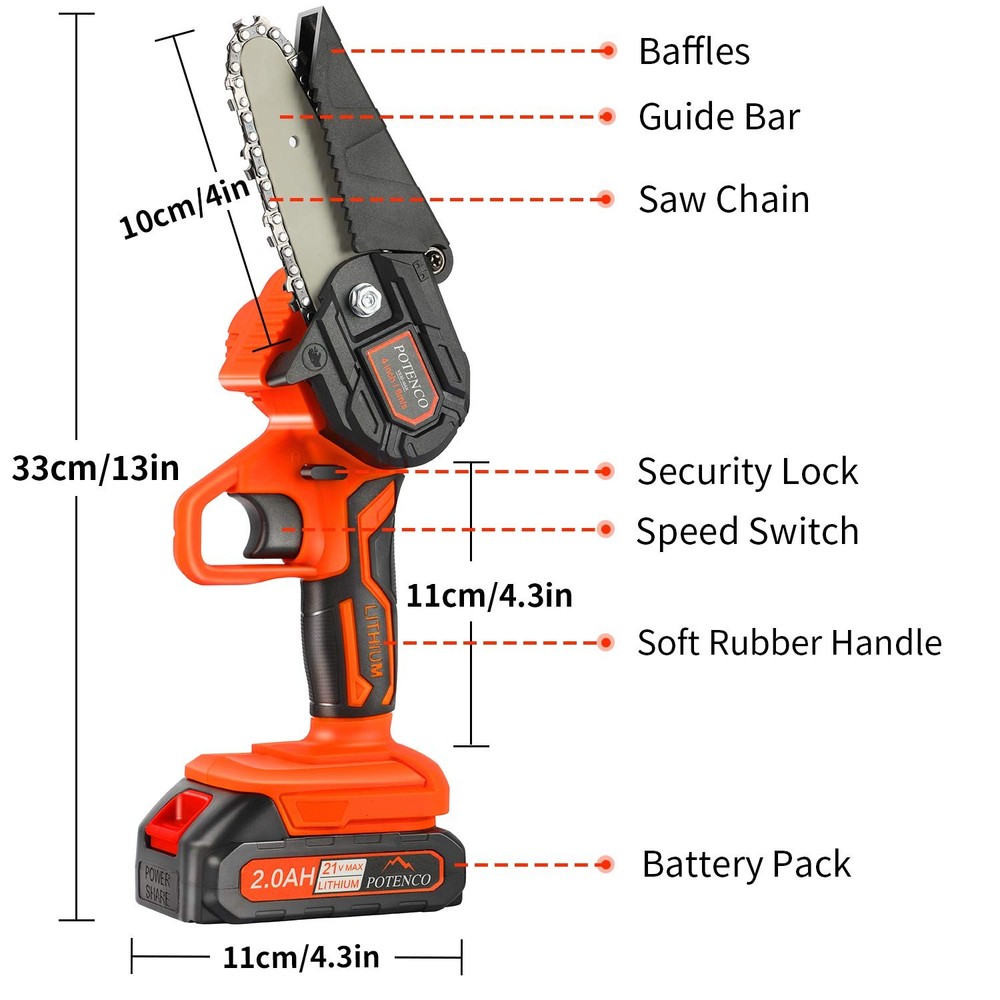 The 0.78kg (1.76 lb) lightweight, portable and safe design is the most important feature of this mini chainsaw. Say goodbye to heavy gasoline saws and laborious pull saws, this is an excellent choice for improving efficiency in tree top pruning, wood cutting and gardening. is committed to improving work efficiency for users. Whether you are a master carpenter or an occasional DIY tool-seeker, this product can bring you a wonderful experience. 【One-Hand and Lightweight】This mini chainsaw just about 0.8kg(1.76lbs) in weight and 13-inch long. It is easy to use for women and the elderly, and will not feel tired after a long time of use. This electric chainsaw is very suitable for treetop pruning, woodcutting, and gardening. The upgraded lanyard and spot light functions work with users in more scenarios. 【Power Cutting】The mini chainsaw cordless is powered by a 21V, 2.0Ah high-energy lithium battery and can work for 50-60 minutes. The powerful motor speed is up to 6m/s, and the output power of 550w can cut logs with a diameter of 4-inch in 5s. The deep quenched chain and the step-less speed control switch can achieve fast and smooth cutting without jamming and bark damage. 【Safe and Reliable】4 security measures to ensure that the battery chainsaw has reliable safety: ①With a security lock to prevent children from mistouch. ② Baffles prevent debris splash. ③Rubber grip improves slip resistance and comfort. ④When the temperature reaches 200°F, the motor automatically stops working to provide protection. 【Quality Accessories】In order to improve user experience, this small handled power chain saws is equipped with 2Pcs battery, 2Pcs guide plate, and 2Pcs chain. In addition, it also provides gloves, cleaning brush, oil bottles, screwdrivers, wrenches and a detailed manual in English, is very suitable as a gift to friends, DIY lovers, fathers, woodworker, craftsman. 【Easy to Install and Maintain】The electric chainsaw has been installed, you only need to fully charge the battery before you use it. Equipment maintenance only needs simple oiling and wiping, does not need to wash with water. If you have any questions during use, please contact us and we will reply within 24 hours.