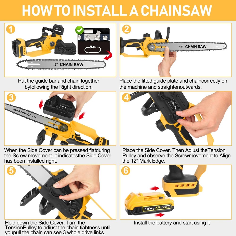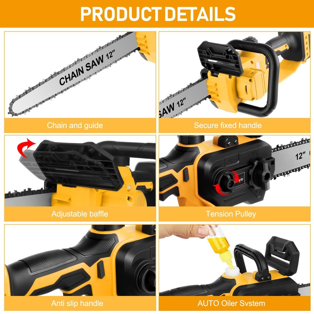Mini Chainsaw Cordless Compatible for Dewalt 20V Battery (Without Battery) 12 Inch Handheld Brushless Electric Chainsaw with Auto Oiler & Security Lock, for Garden, Wood, Trees Cutting (Tool Only) 🧰(Note: this product does not include battery, Tool Only) this Cordless Chainsaw is perfect for Dewalt 18V-21V battery compatibility. 🪵【12 inch Mini cordless chain saw】 This chain saw is engineered for people busy with gardens, farms, or DIY projects. This chain saw trims branches or vines, clears bushland, and cuts wood, bamboo, or poly pipes. This Small chainsaw enables fast and easy assembly in 5 minute, requiring no screwdriver. 🪵【Powerful brushless motor, efficient cutting】the chain is made of 65 Mn steel with high strength, hardness, elasticity and wear resistance, while the deep quenching process further improves its performance to ensure clean and smooth cuts. An 1000W pure copper motor drives the chain at 45ft/s and delivers faster and more efficient cuts, cuts 12-inch branches in 5~10s. 🪵【Brushless ChainSaw Application】Designed for people who have a lot to do with Household and Garden, farms or DIY projects. Chainsaw suitable for wood cutting, gardening trimming, small branch shearing and bush pruning. Widely used in gardens, farms, parks, forests, greenhouses, pastures and orchards. 【🎁Brushless the electric chainsaw】🎁12" Brushless Motor Handheld Electric Portable Mini Cordless Chainsaw Perfect Gift. Chainsaw is a Great Gift Choice for Husband, Dad, Mom, Friends, DIY Enthusiasts and for Any Special Occasions Such as Christmas Days, Thanksgiving Day, Valentine’s Day, Father’s Day, Anniversaries.
