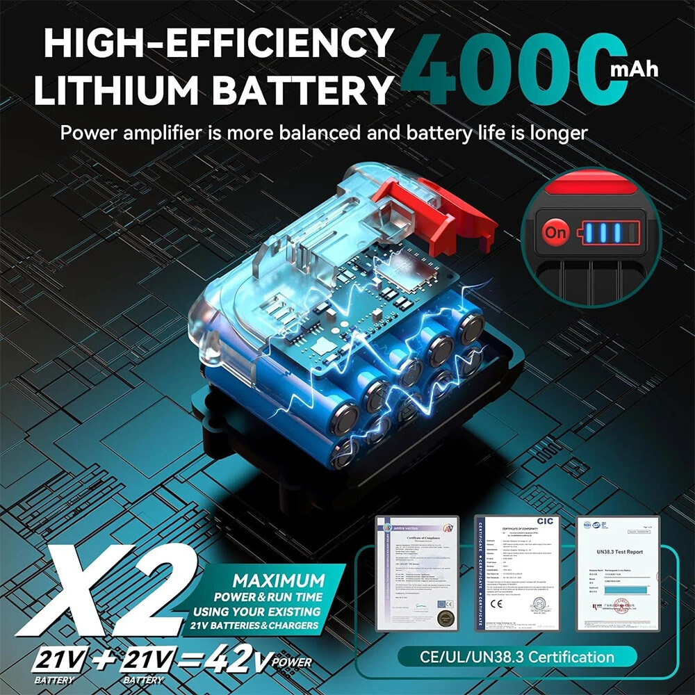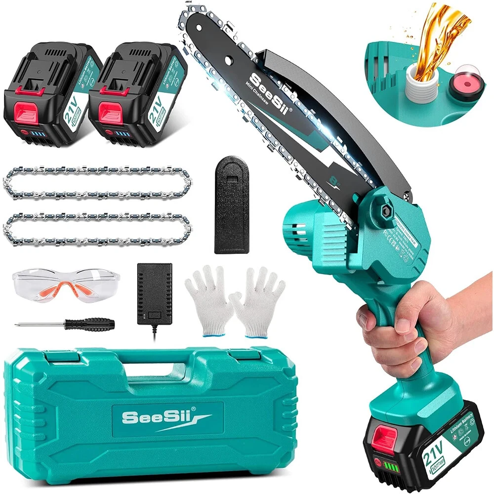Por favor, tenga la seguridad de comprar. La mini motosierra con batería resuelve completamente el problema del humo del motor y la de la batería en el mercado. Dos años de total en Alemania. Ligero y eficiente Con guías de 8 pulgadas para un área de corte más larga, mientras que la motosierra portátil SeeSii pesa solo 3,24 libras. Está elaborado para evitar que alguien sea demasiado pesado para operar la sierra. Nunca te sentirás cansado después de un largo trabajo. 8 pulgadas se puede usar para prácticamente cualquier proyecto que surja en la vida de una casa típica. Adecuado para cortar madera, recortar ramas, eliminar arbustos persistentes, jardinería y más. Motosierra mejorada de 8 pulgadas Esta mini motosierra viene con lubricación del tanque de aceite. La cadena puede ser autolubricada, lo que reduce la resistencia a la fricción en la cadena de transmisión cuando se utiliza una motosierra sin alambre para cortes suaves. A una velocidad de motosierra de 16,4 pies/s, solo toma 10 segundos cortar un tronco de 20 cm de diámetro, como cortar mantequilla. TIEMPO DE BATERÍA EXCEPCIONAL Sabemos que la de la batería de la sierra de la batería es su principal preocupación. Nuestra motosierra está equipada con dos baterías de 21 V 4000 mAh que le permiten cortar continuamente más de 100 piezas de madera. La protección contra sobrecalentamiento y sobretemperatura garantiza una duración de la batería mucho más larga. El indicador de estado de la batería se encuentra en la batería para comprobar fácilmente el estado de carga. Más seguridad y menos ruido Esta mini motosierra con batería cuenta con un interruptor de bloqueo de seguridad y protección contra salpicaduras. Para evitar el arranque accidental, el bloqueo de seguridad y el gatillo deben presionarse simultáneamente para iniciar la sierra. La protección contra salpicaduras evita que el aserrín salpique durante el trabajo. El ruido es muy bajo, por lo que no tienes que preocuparte por molestar a tus vecinos.