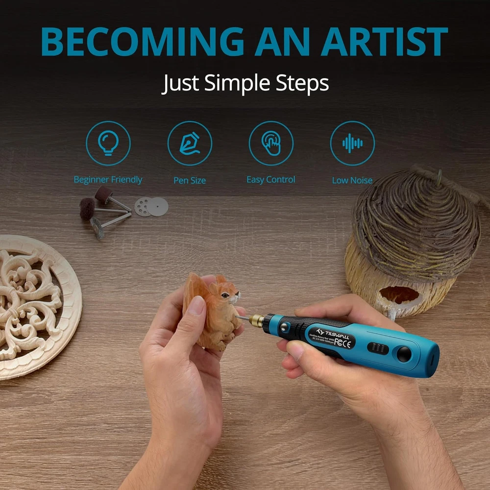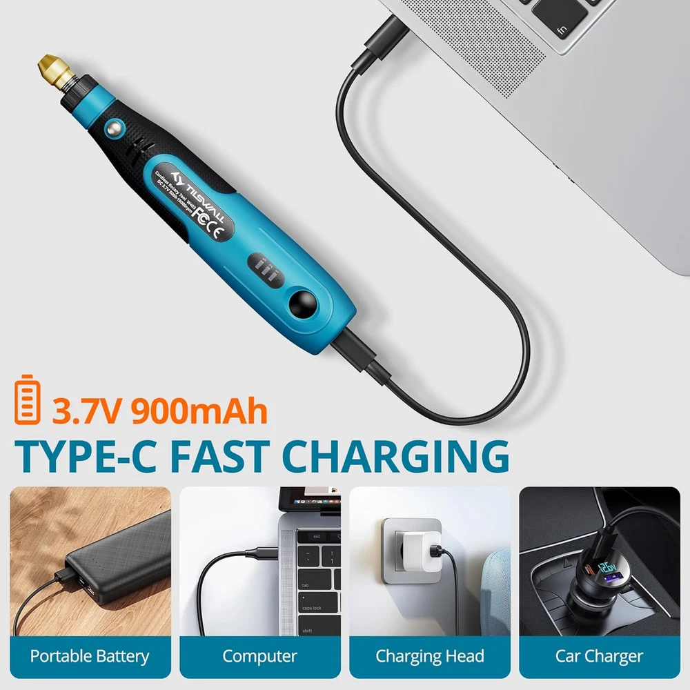 【Cordless Rotary Tool】With our cordless rotary tool, you can work freely anytime, anywhere, and easily say goodbye to tangled cords and restricted movement. 【Lightweight & Comfortable Design】Tilswall 3.7V rotary tool weighs only 0.26 pounds, the lightweight design can effectively reduce hand fatigue. The size is compact and mini, and the hand grip part is designed with soft rubberized cover for a comfortable grip. 【Multifunctional Rotary Tool Set】This rotary tool set has 82 accessories for carving, cutting, drilling, sanding, polishing and many DIY projects. 【3 Speed Settings】 The mini rotary tool has 3 speeds ranging from 5,000 rpm to 15,000 rpm to meet your DIY needs at all stages of creation. Choose the right gear and you are ready to start your fine work. 【Long Battery Life】Our cordless rotary tool is powered by a long-lasting battery that ensures uninterrupted operation. You can enjoy unlimited creative fun! Product Description