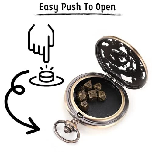Return Policy Fast Delivery Trusted seller Mini D&D Dice Set DND Pocket Watch Shell 7PCS Micro Polyhedral Dice Set Metal Dice Dungeons and Dragons Gift Accessories Bronze Product Description Mini D&D Dice Set for DND Player - 7pcs tiny metal DND dice are easy to carry. Ideal Dice Case - All D&D dices are put in a hollow Dragon & Phoenix pocket watch case, which can be worn with a necklace or pocket watch chain as you wish, stylish and portable. DND Gifts for DND Lovers - This D&D Dice Set is sure to be loved by the Dungeons & Dragons, Warhammer, Baldur's gate enthusiast or dnd starters! Dimension - 0.33~0.39'' D4~D20 zinc alloy dice, 1.85'' diameter dice case, 14'' stainless steel pocket watch chain, 27'' stainless steel necklace. Shipping Returns Payment Shipping Shipping is FREE to all addresses other than APO/PO boxes in the lower 48 states. All our stock ships from US-based warehouses. Shipped via USPS or UPS (depending on location and package weight) Unless stated otherwise, all orders will ship within 24-72 hours of your payment being processed. Check our feedback to see the great reviews of FAST shipping we offer. Returns Seller does not accept returns Payment We currently accept payment via eBay managed payments only. Once payment is cleared, we will dispatch your shipment within 1-3 business days. Please refer to the "Shipping" tab for more information regarding shipping speed to your destination.