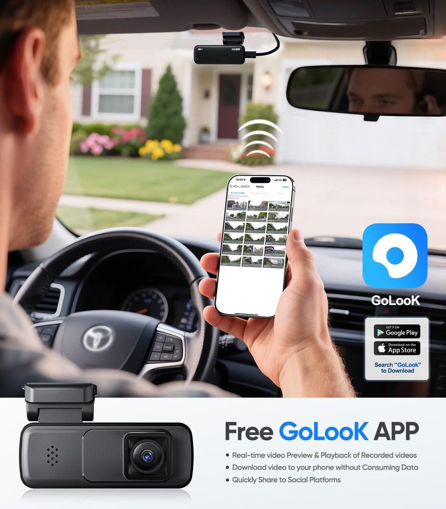 dash cam, dash cam front and rear, dash camera for cars, dashcam, car camera, camara de seguridad para carro, dash camera, mini dash cam, car dash cam, dash cam front, wireless dash cam, dash cam front and rear wireless, camera for car, camara para carro delantera y trasera, dashcams for cars, car camera wireless, dash cam for cars, dash cam wifi, dash cam car, mini camera 【2K HD Camera & Wide Angle】DR-1 dash cam capturing 2K(1296P@30fps) front videos. This driving recorder enhances your ability to clearly read road signs, Car license plate and critical details, delivering both heightened driving enjoyment and superior safety. Equipped with a 170° ultra-wide front camera, it significantly expands your field of view. 【Ultra-Compact & Stealthy Design】The DR-1 mini dash cam features a hidden design with dimensions:3"(L) x 1"(W) x 0.6"(H). This might be the smallest mini-type dash cam you've ever seen – comparable to a lighter in size. Its discreet installation allows full concealment behind rearview mirrors, remaining completely undetectable. 【Wireless WiFi & APP Control】The DR-1 Wireless dash cam features an enhanced Wi-Fi module for rapid data transfer, enabling smooth video previews, downloads, and sharing. Via the GoLook APP on your smartphone, effortlessly access recordings, watch live feeds, configure settings, and share clips on social media or with family in one tap. 【G-Sensor & Loop Recording】The DR-1 dashcam features a high-performance 3-axis G-Sensor with enhanced sensitivity. Upon collision, it automatically locks and saves real-time footage as critical evidence. When storage fills, loop recording overwrites oldest files while its innovative technology eliminates video gaps and key frame loss, ensuring seamless video continuity for reliable evidence preservation. 【24/7 Parking Surveillance】The DR-1 dash cam for Cars supports continuous parking monitoring. After engine shutdown, it automatically initiates time-lapse recording at 1 frame per second (1fps). Requires hardwire kit (Purchase ASIN: B0F8QMWB7Q) for power supply. 【Easy Installation & Includes 32G Card】 This car camera installs effortlessly—just plug into your vehicle's power port for instant operation. With a high-speed 32GB U3 microSD card pre-installed, you gain immediate recording capability and exceptional value right out of the box. 【Voice Guidance System】This car camera wireless delivers intelligent voice prompts that instantly notify you of its operational status. Clear vocal alerts enable real-time awareness and prompt necessary actions – all without visual distraction. 【Reliable Service Support】We guarantee free replacement of any product with quality issues within 6 months, and offer repair services and lifetime technical support within 1 year. We provide dedicated after-sales support via phone/email, with professional customer service staff available for immediate communication. All emails will be replied to within 12 hours.