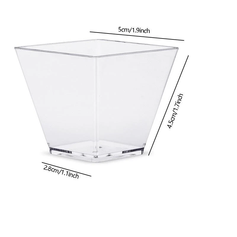 Description Mini Dessert Cups 50 CT 2 oz Clear Plastic Cups with Spoons Mini Square Dessert Bowls for Serving, Tasting Material: Plastics Quantity:50 cups + 50 spoons Capacity:2 oz(mini size) Elegant Design: Modern, clear cups perfect for showcasing desserts Complete Set: Each cup includes matching spoon for convenience Versatile Use: Ideal for various events including weddings, parties, and catering services Package Content: 1 x 50 cups + 50 spoons Payment 1 . We accept PayPal only. 2 . Payment should be completed within 4 (Four) days of auction closing. Or unpaid dispute will be filed for closing auction. 3 . Sales Tax of 9% will be applied for orders shipped within the state of California 4 . We will leave a positive feedback immediately after payment is received. We appreciate a positive feedback as much as you do. If for some reason there is any issue with the purchase, please contact us prior to leaving feedback, and we will be glad to work with you to have it resolved. Shipping 1 . We Ship to United States ONLY. 2 . Ship from two warehouses and only to eBay ADDRESS. Package handling only takes 1 business day at our warehouse, so please make sure entering correct payment and shipping information before checking out. Once your payment is completed, pls leave ebay note if the changes are needed before we send the product. 3 . Truck company: 3-8 business days. | USPS: 2-6 business days. | UPS/FEDEX: 3-5 business days. 4 . Lccal pick up is available. Warranty and Guarantee 1 . All of our items come with a 30-day return policy. We ensure all our items are new and in excellent condition prior to shipping. In the event that you receive the item that is not to the standards above, please contact us via e-Bay messages. All returns must be in new original condition as received and should be shipped with delivery confirmation 2 . We ONLY accept the return for original package. Please make sure that item has NO man-made sabotage. Used items will not be accepted for return. 3 . We reserve the right to refuse any returns for objective reasons. 4 . All NON-seller mistake returns for refund are subject to 20% re-stocking fee and buyer should pay for the round-trip shipping fee. (E.g. you bought wrong model or wrong color). Feadback 1 .Any problem after receiving our goods,please contact us before leaving Neutral/Negative feedback.We promise to help you solve it asap,and make you feel satisfactory absolutely. 2 . Please DO NOT leave negative feedback without asking for help. Please do not leave negative or neutral feedback if you haven't received item in 30 days, because we have mentioned the shipping time repeatedly.