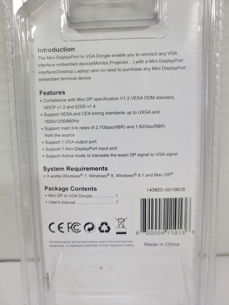 New in sealed original packaging. Mini DisplayPort 1.2 to VGA Dongle only. Item will ship within one business day of completed sale. I DO NOT ship media mail. All items will be securely packaged and will ship USPS Ground Advantage, Priority mail, UPS or Fedex depending on weight and size. I do offer a 30-day money back guarantee on almost every item I sell. If there are issues with your item, please return it for a refund. Refund will be issued upon return of item. Some restrictions may apply. It is always appreciated if you contact me before starting a return so that I can try and assist without the hassle of a return.