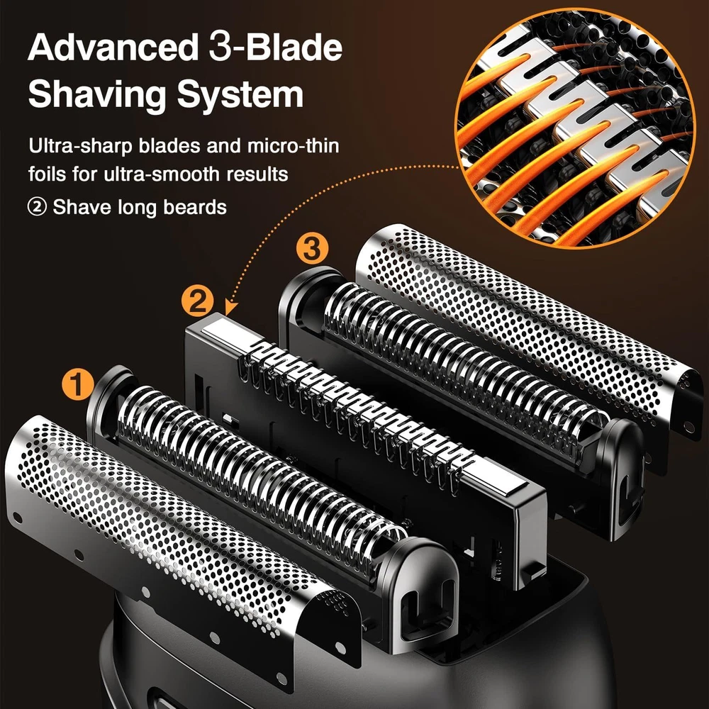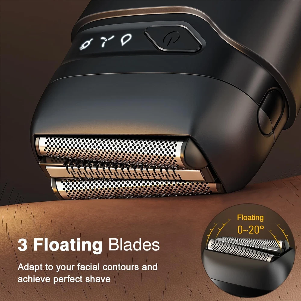 Recommended Uses For Product Beard, Face Special Feature 3 Blade Heads, Waterproof, Floating Head, Travel Lock Power Source Battery Powered Model Name Electric Razor About this item 3 BLADE HEADS: Our foil shaver adopts curved precision steel blades, which are safe and sharp; quickly cutting off long and short beards; Our shaver adopts intelligent sensing technology to effectively prevent hair pinching; bringing you a comfortable and smooth shaving experience every time FLEXIBLE FLOATING SHAVER: Our Electric Razor adopting ergonomic design and multi angle adjustment; The shaver adapts to your unique face contours to deliver a close shave and achieve Wonderful shave experience IPX7 WATERPROOF WET/DRY USE: Our electric shaver is fully IPX7 waterproof; We recommended softening the stubble with shaving foam first for a thorough shave; Enjoy a comfortable dry shave or a refreshing wet shave with shaving foam; The washable shaver head allows you to easily clean directly under the tap; which is easy to operate TRAVEL LOCK: Our men's electric shaver is equipped with a working indicator light; which can accurately remind of low battery level; A long press of the switch button for 3 seconds activates the travel lock; The electric shaver provides 100 minutes of cordless use; Our men's foil shaver is Wonderful for travel and business work; allowing you to shave and anytime SHAVING EXPERTS AND IDEAL PRESENT: Our Men's shavers are designed with fashion; Wonderful for giving to husbands; fathers; sons and boyfriends on any day